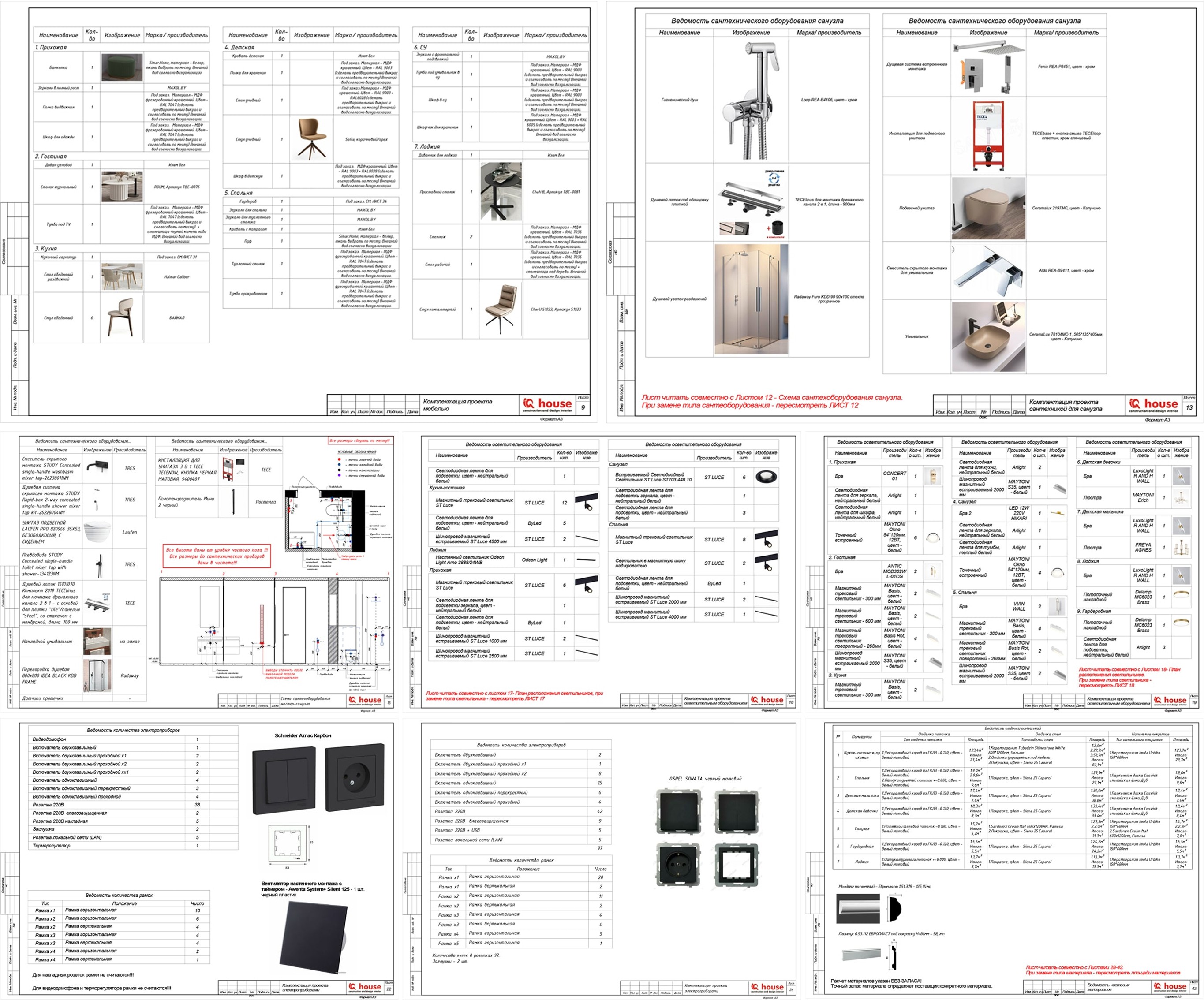 Все использованные в проекте чистовые материалы, мебель, освещение — это реальные предметы, которые всегда можно купить на нашем рынке. Для этого составляются ведомости отделки материалов, где указываются конкретные наименования материалов, их артикул, производитель, а также общая площадь, тоже самое касается и предметов мебели, освещения, сантехники, розеток и выключателей.