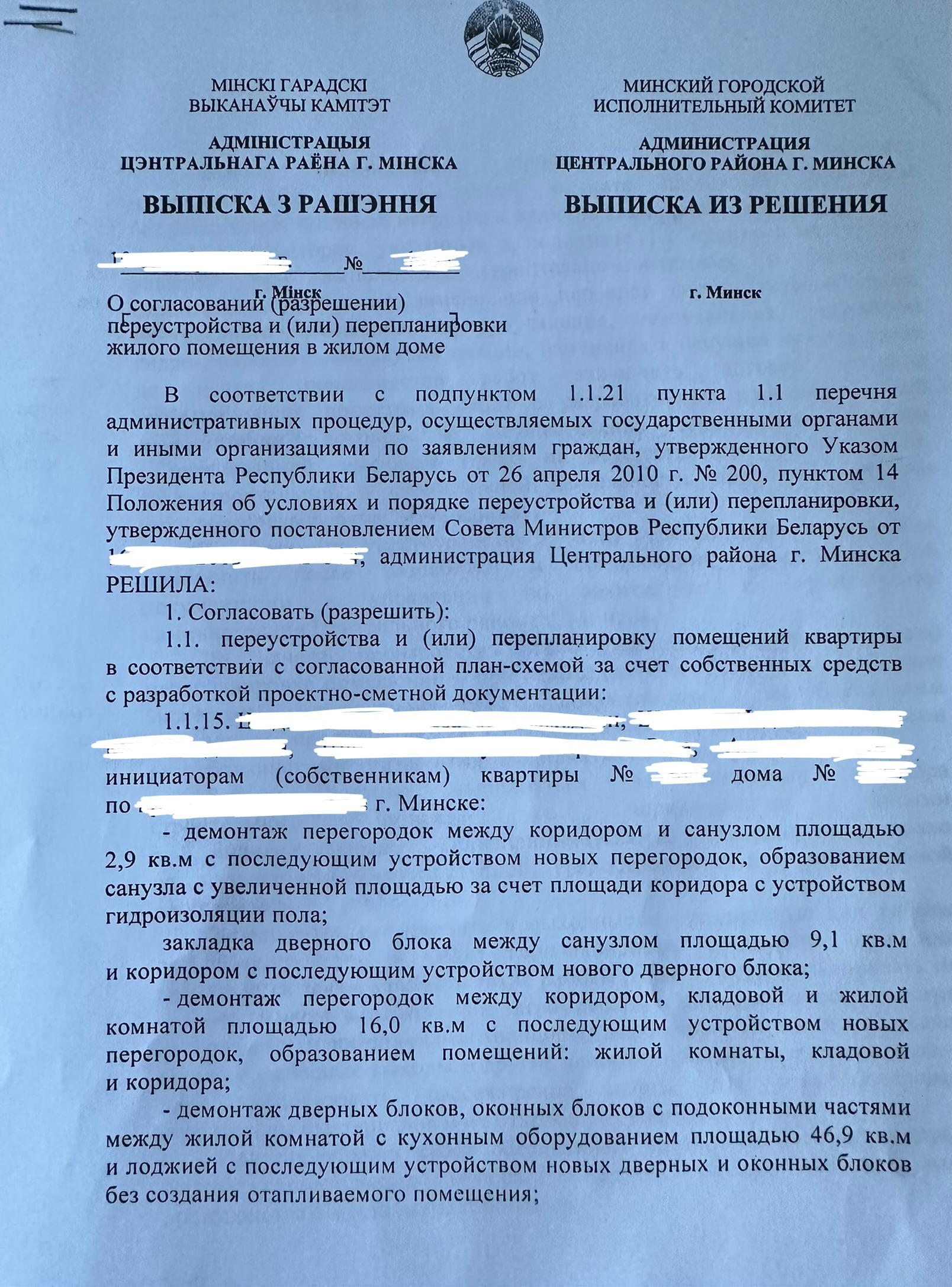 Подготавливается план-схема на основании существующего техпаспорта, на которой вы наносите изменения, которые хотите сделать в квартире. Эта план-схема подаётся в администрацию вашего района и рассматривается на заседании с принятием решения о разрешении и законности проведения вами данных работ. Ориентировочный срок рассмотрения такого решения — около 2-4 недель. Важно помнить, что ремонтные работы, затрагивающие изменение стен, санузлов, радиаторов отопления можно начинать только при наличии документального разрешения от администрации района.