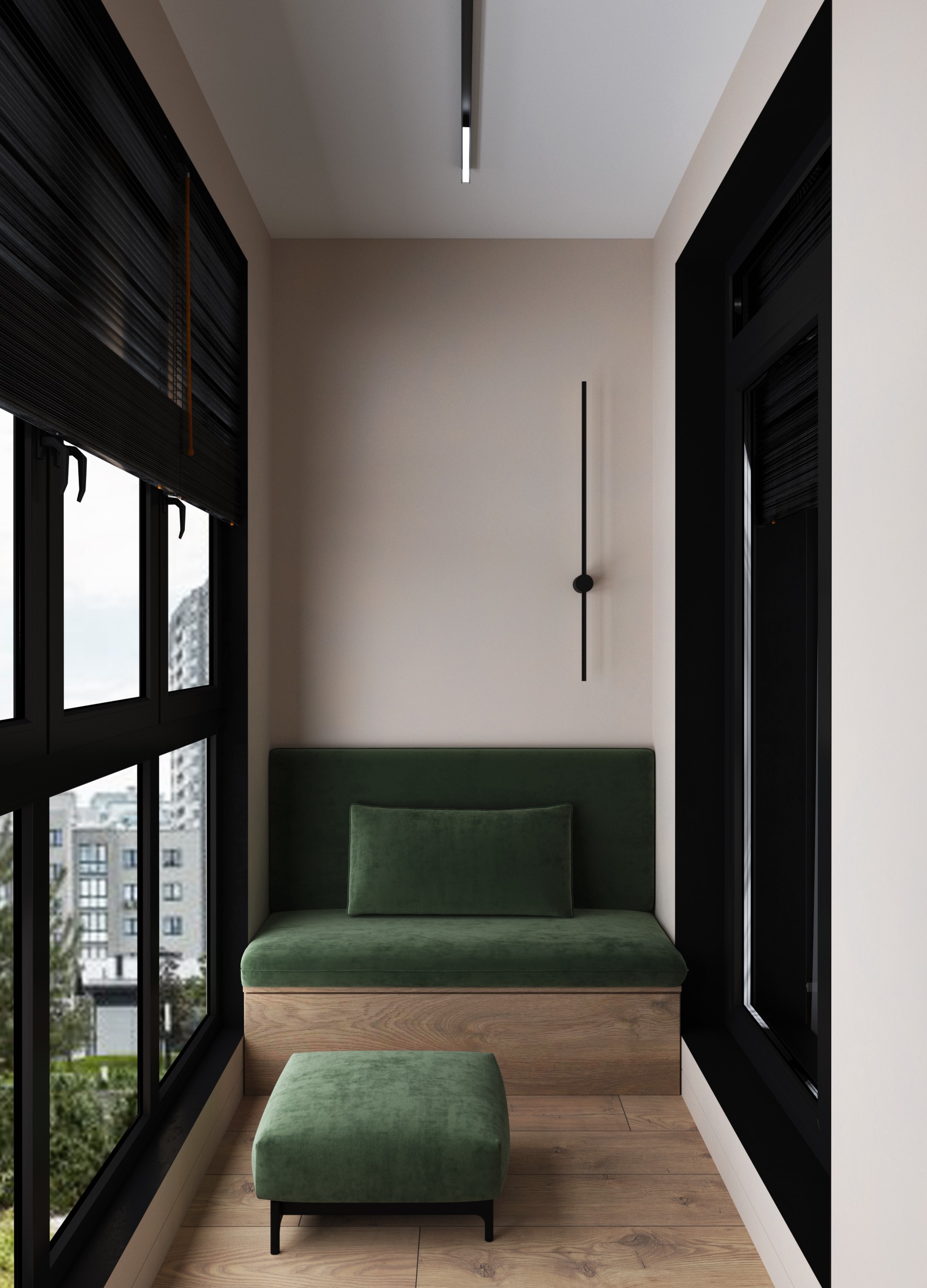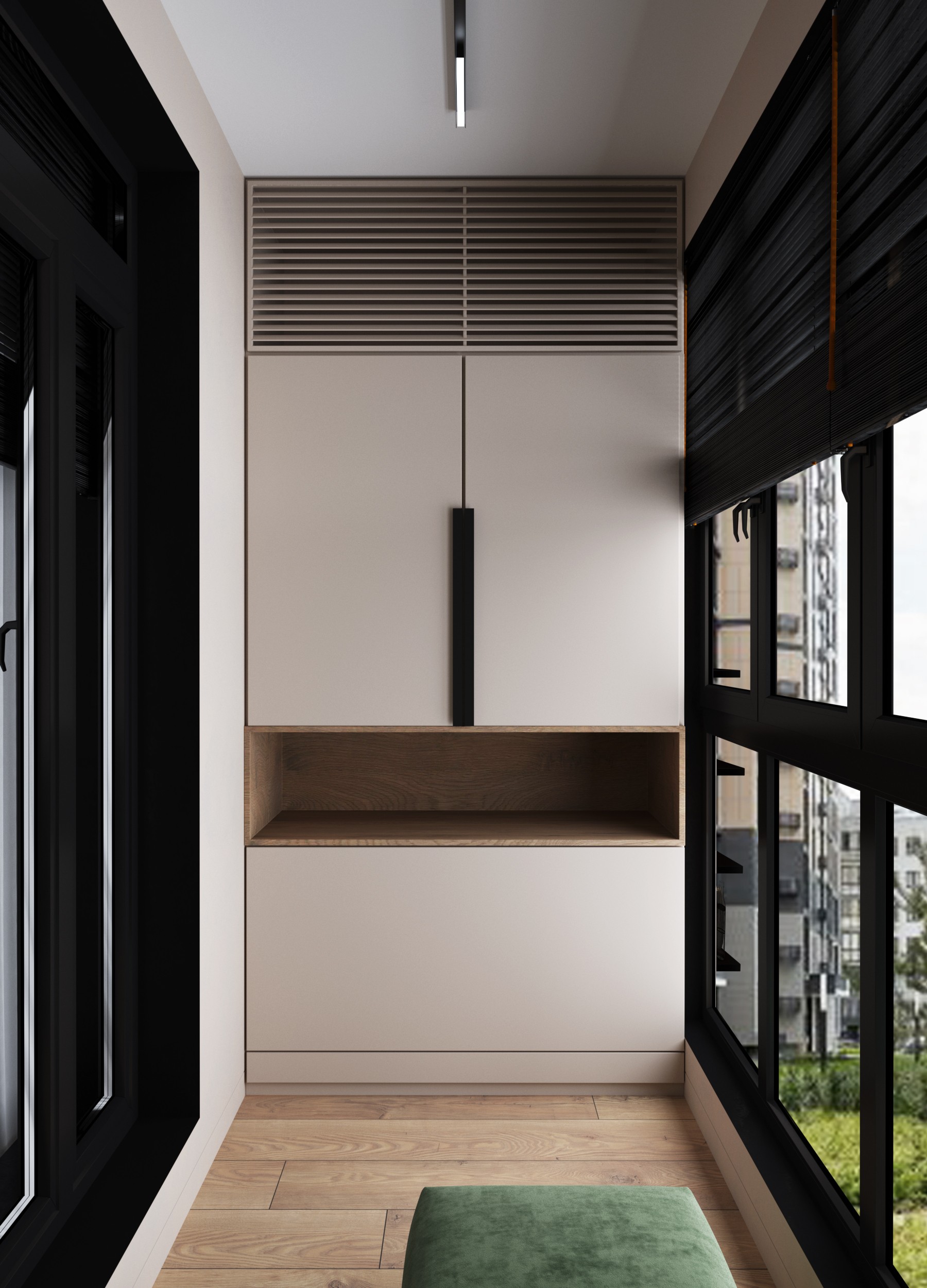 На лоджии установлен шкаф не просто так, в нем располагается приточно-вытяжная установка, это оказалось самым удобным и оптимальным местом для размещения, однако лоджию пришлось утеплить, поэтому решено было добавить сюда небольшую лаундж-зону.