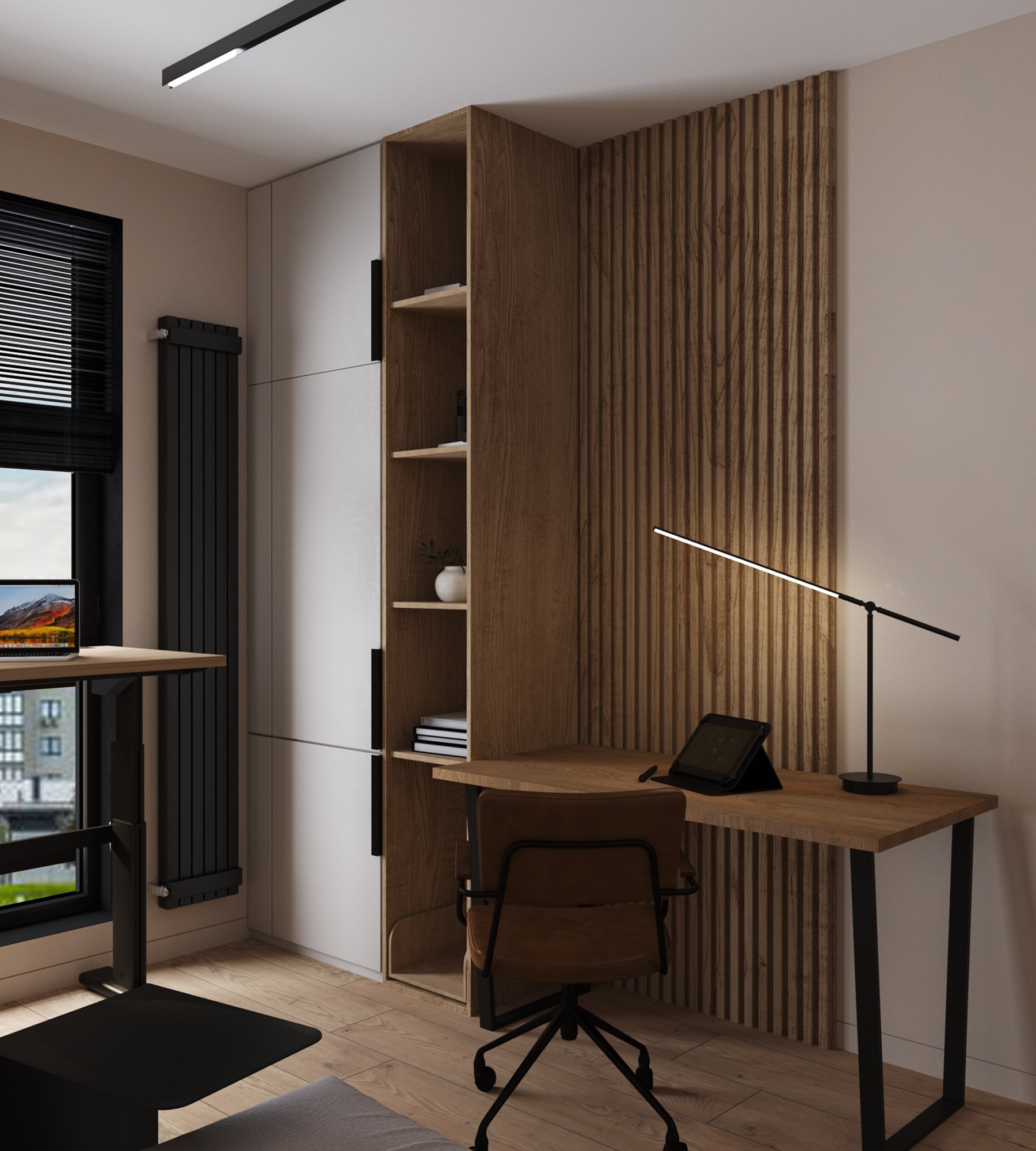 Текстиль на окнах используется только в спальне, а в кухне-гостиной и кабинете использованы деревянные жалюзи черного цвета оконные откосы облицованы керамогранитом для придания большей графичности и комфортной эксплуатации.