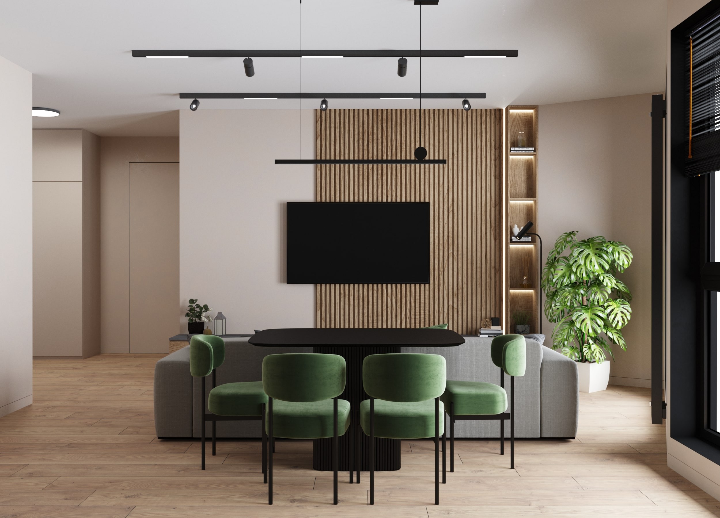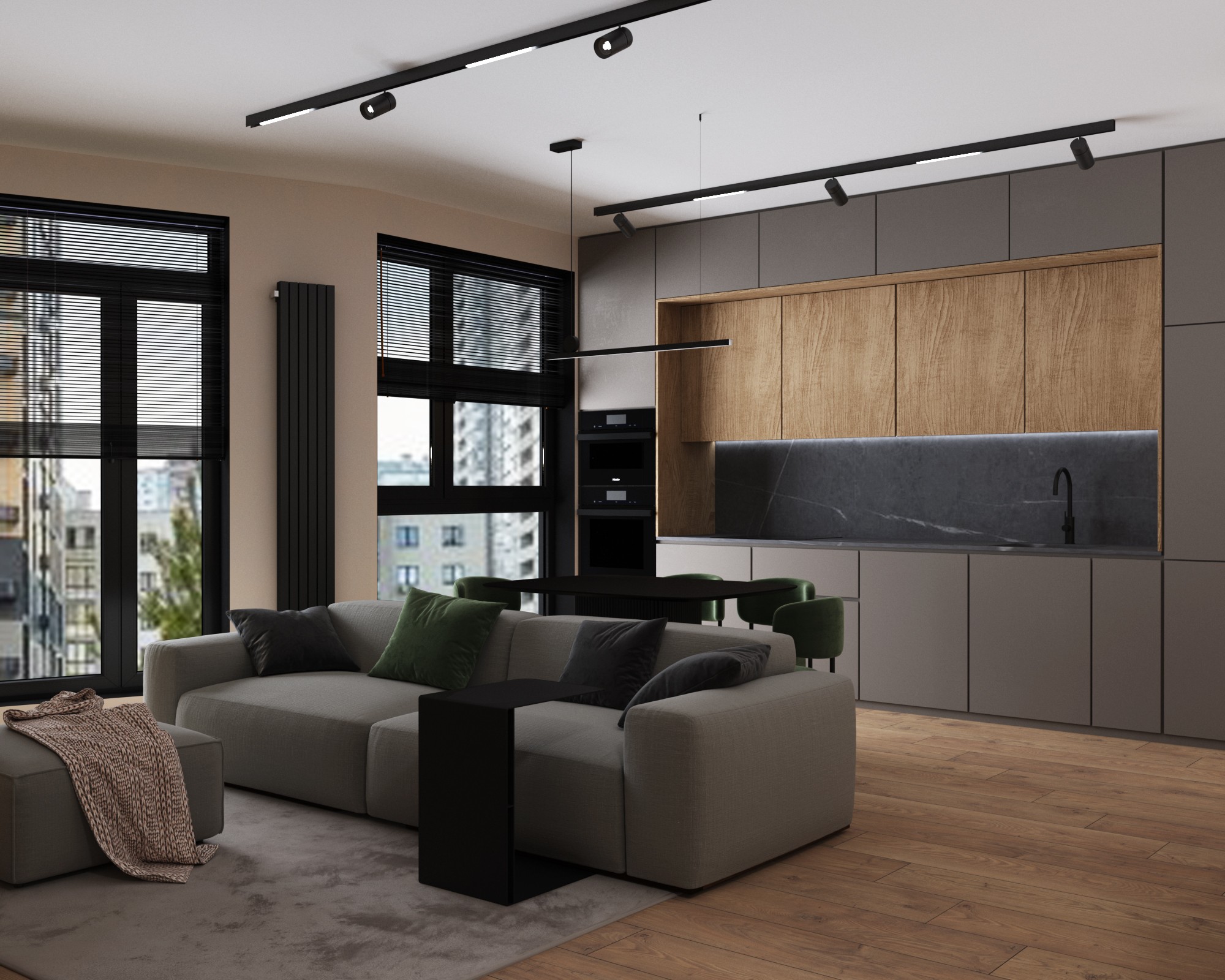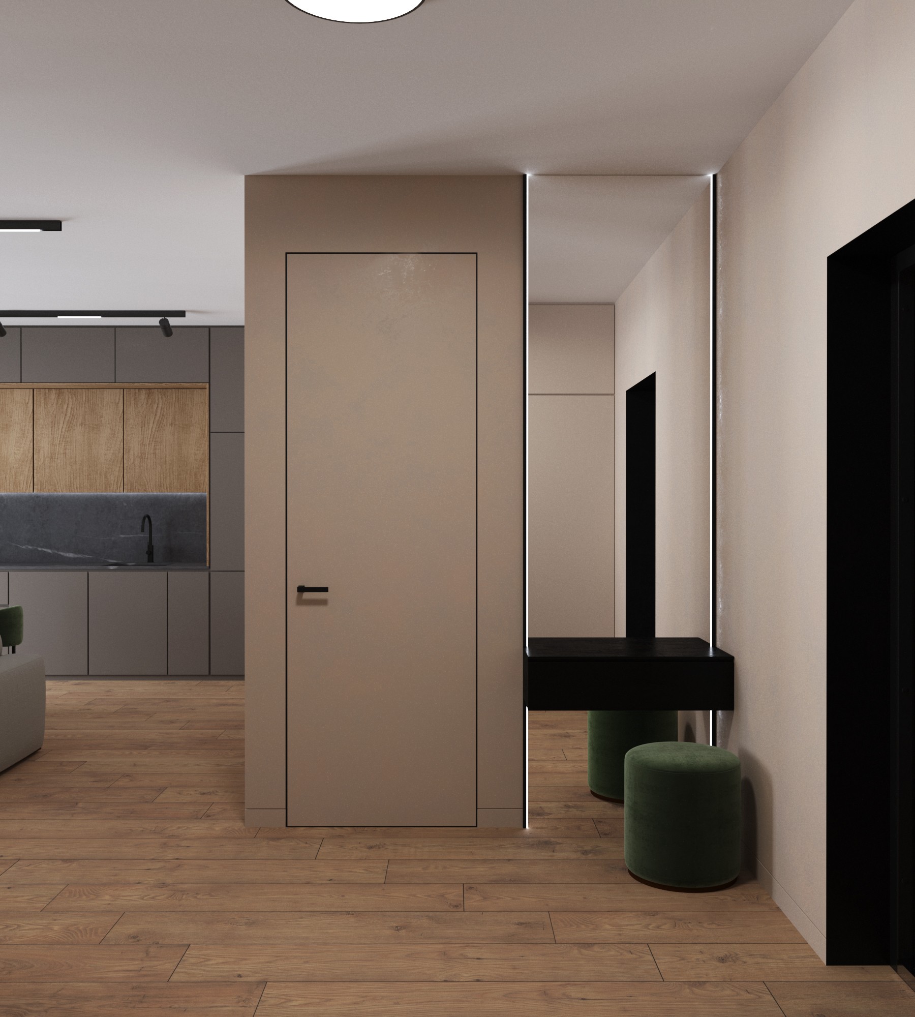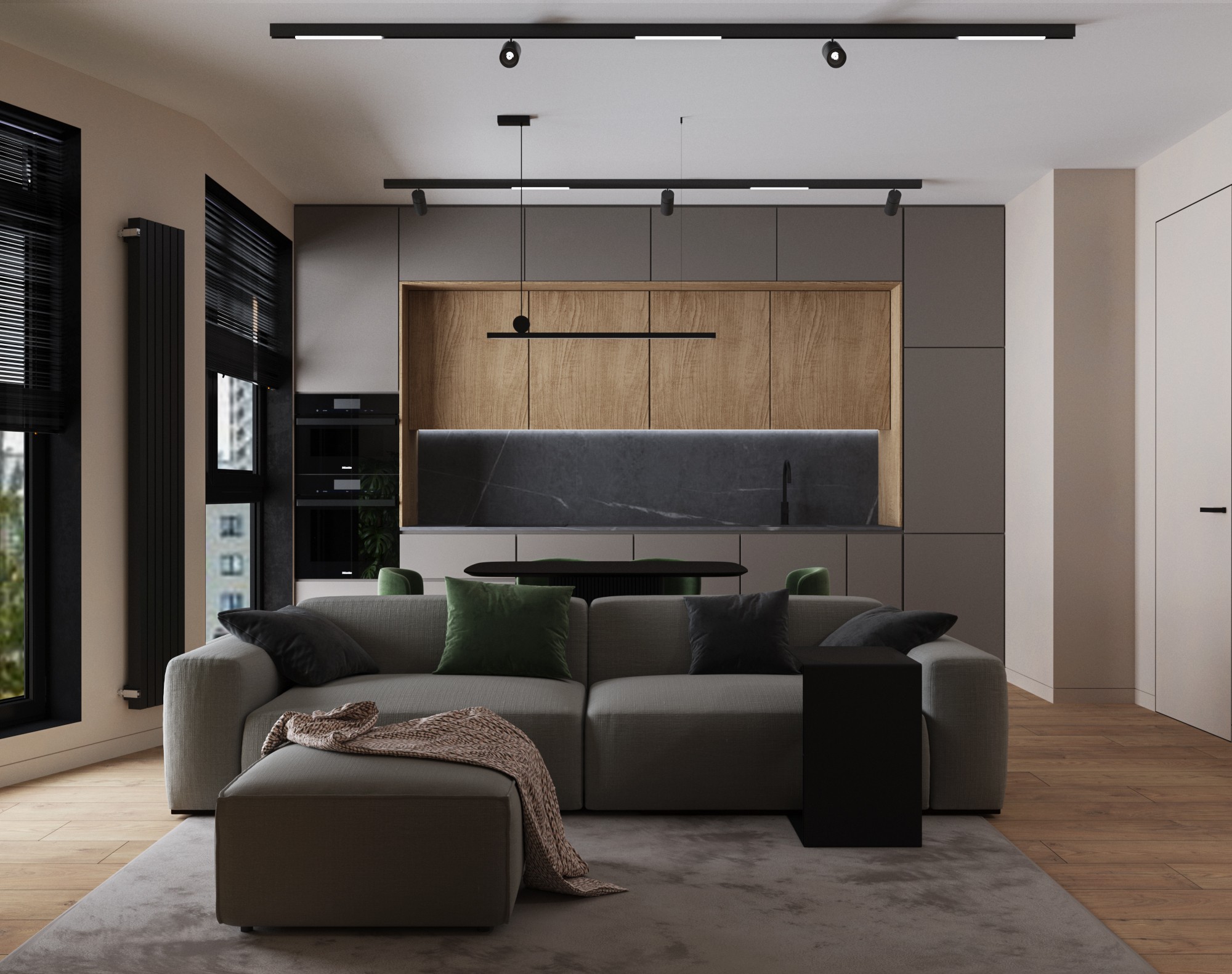 Интерьер квартиры достаточно аскетичный и простой, основной акцент на материалы - натуральное дерево, камень, а также на техническую часть проекта, здесь спроектирована приточно-вытяжная вентиляция по всей квартире, также система “умный дом”. Интерьер выполнен в мягких оттенках, акцентным цветом выступил зеленый, который точечно используется в текстиле.