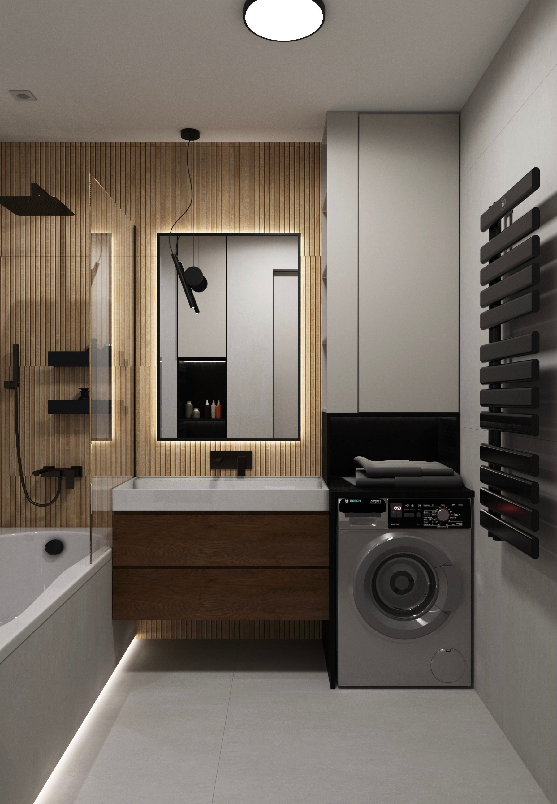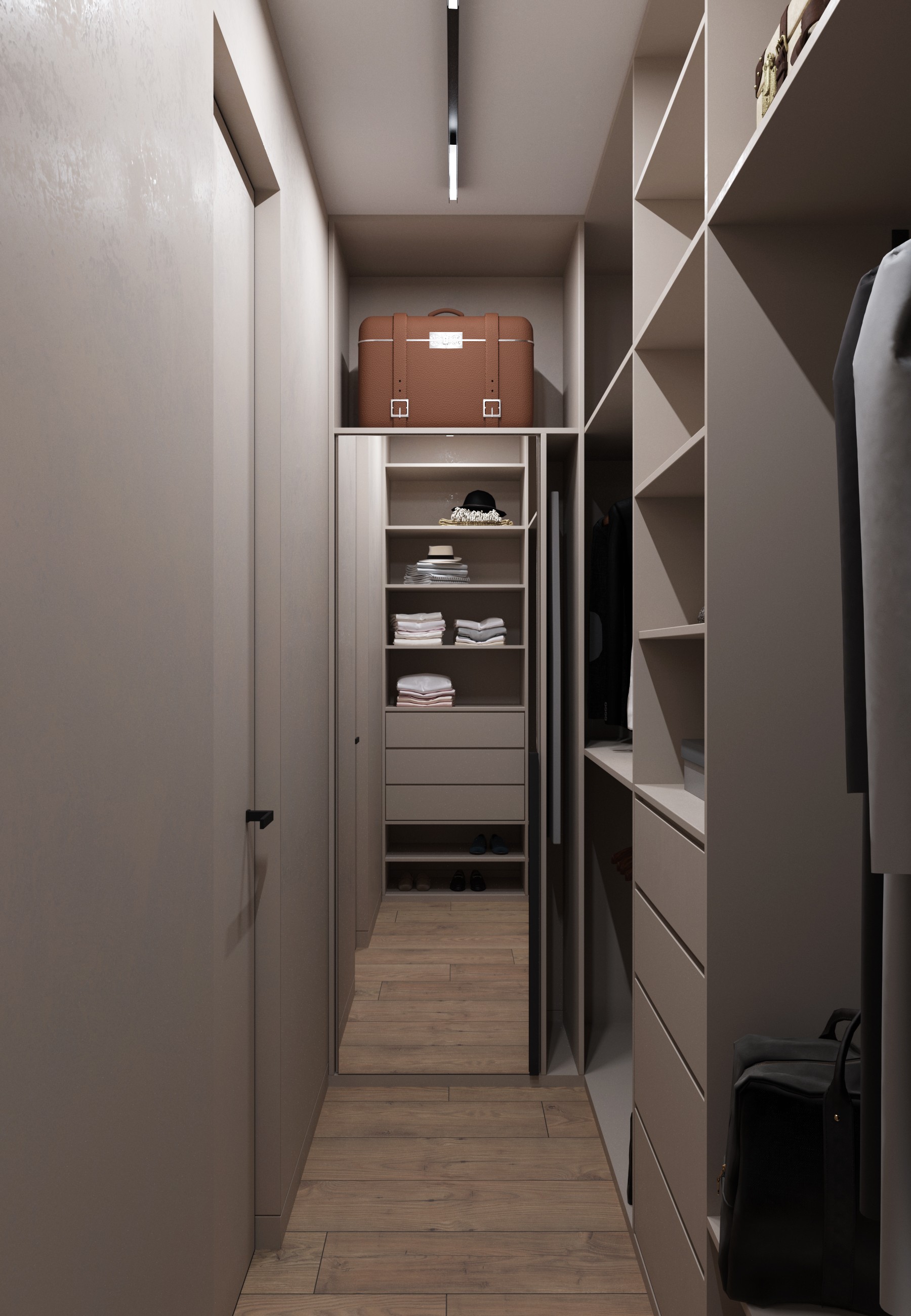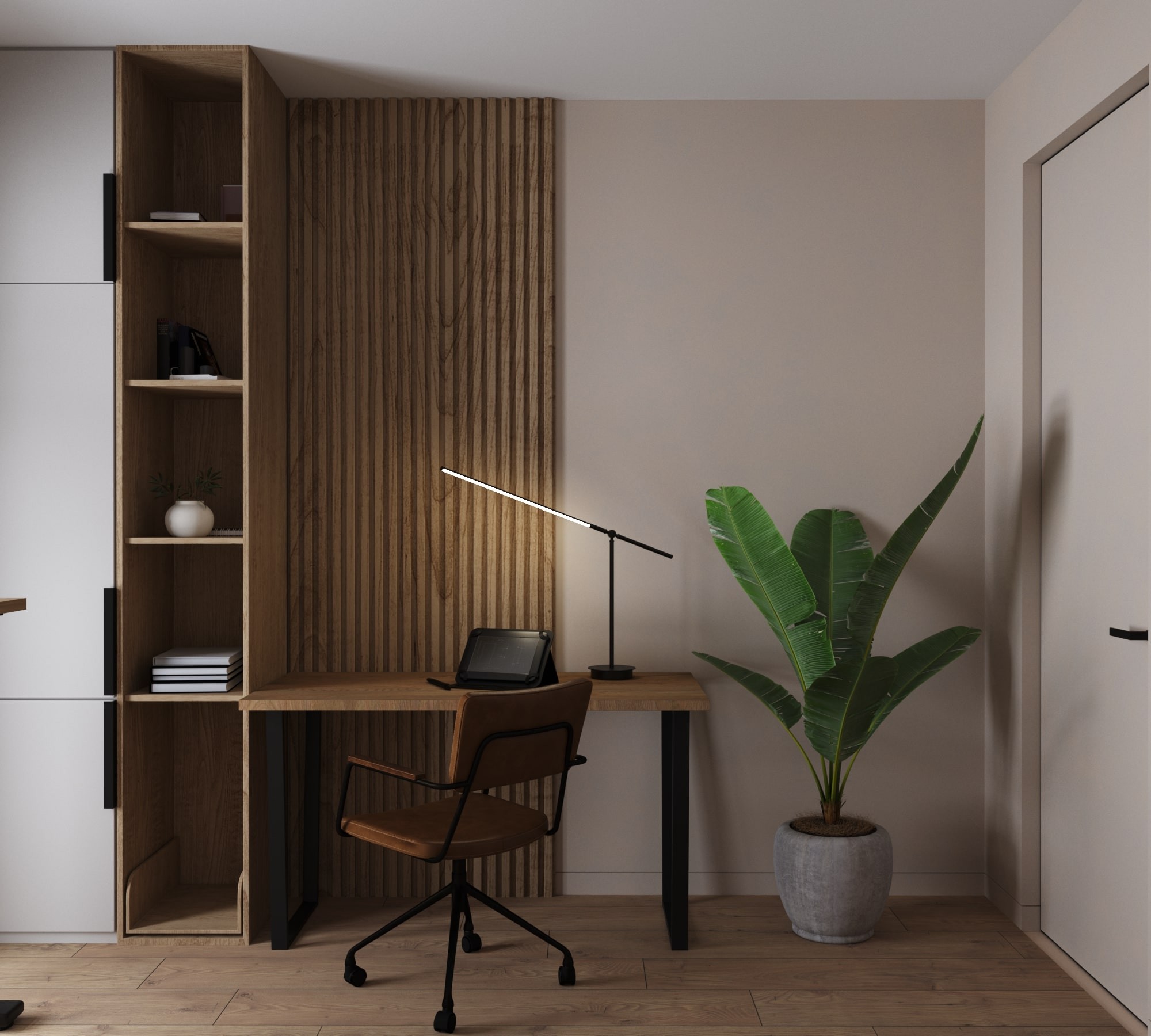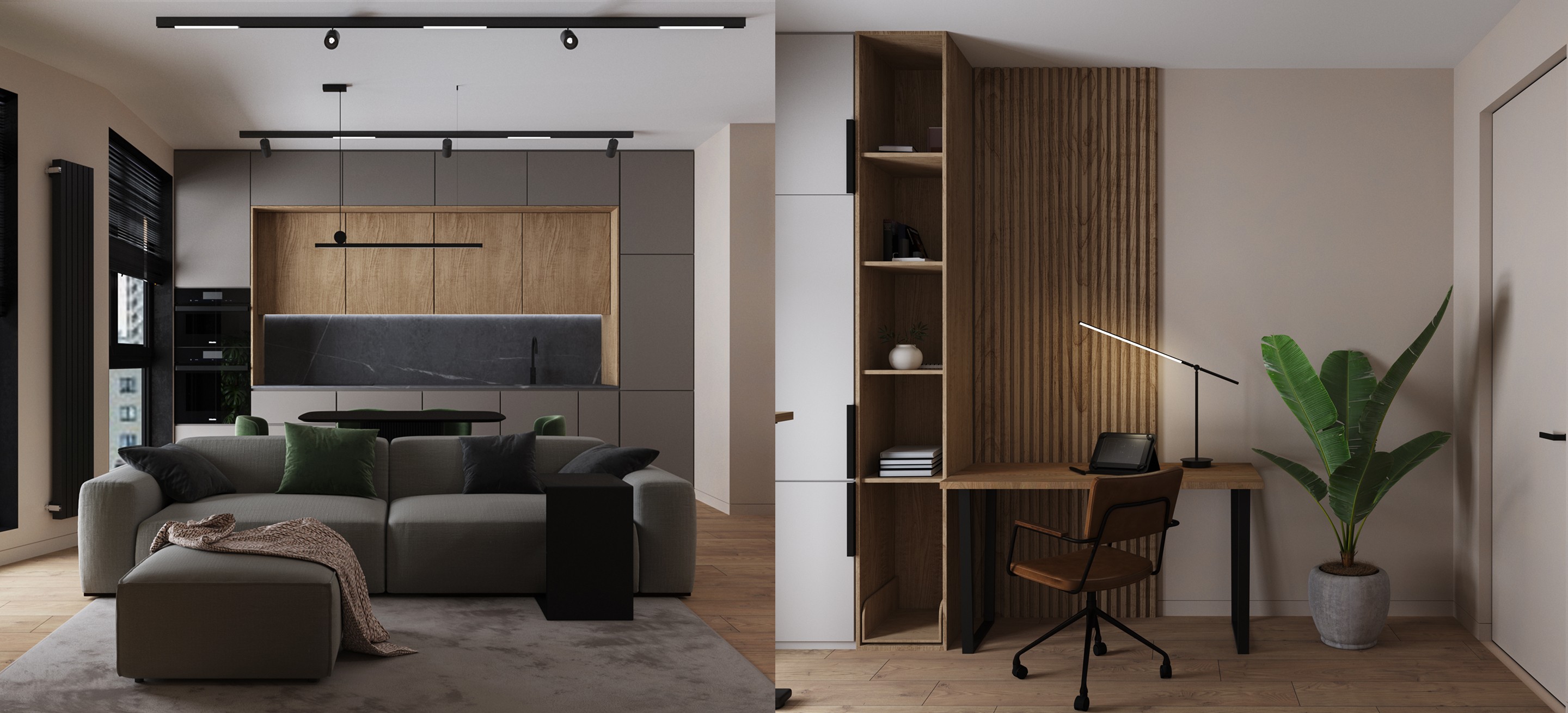 Интерьер квартиры достаточно аскетичный и простой, основной акцент на материалы - натуральное дерево, камень, а также на техническую часть проекта, здесь спроектирована приточно-вытяжная вентиляция по всей квартире, также система “умный дом”. Интерьер выполнен в мягких оттенках, акцентным цветом выступил зеленый, который точечно используется в текстиле.