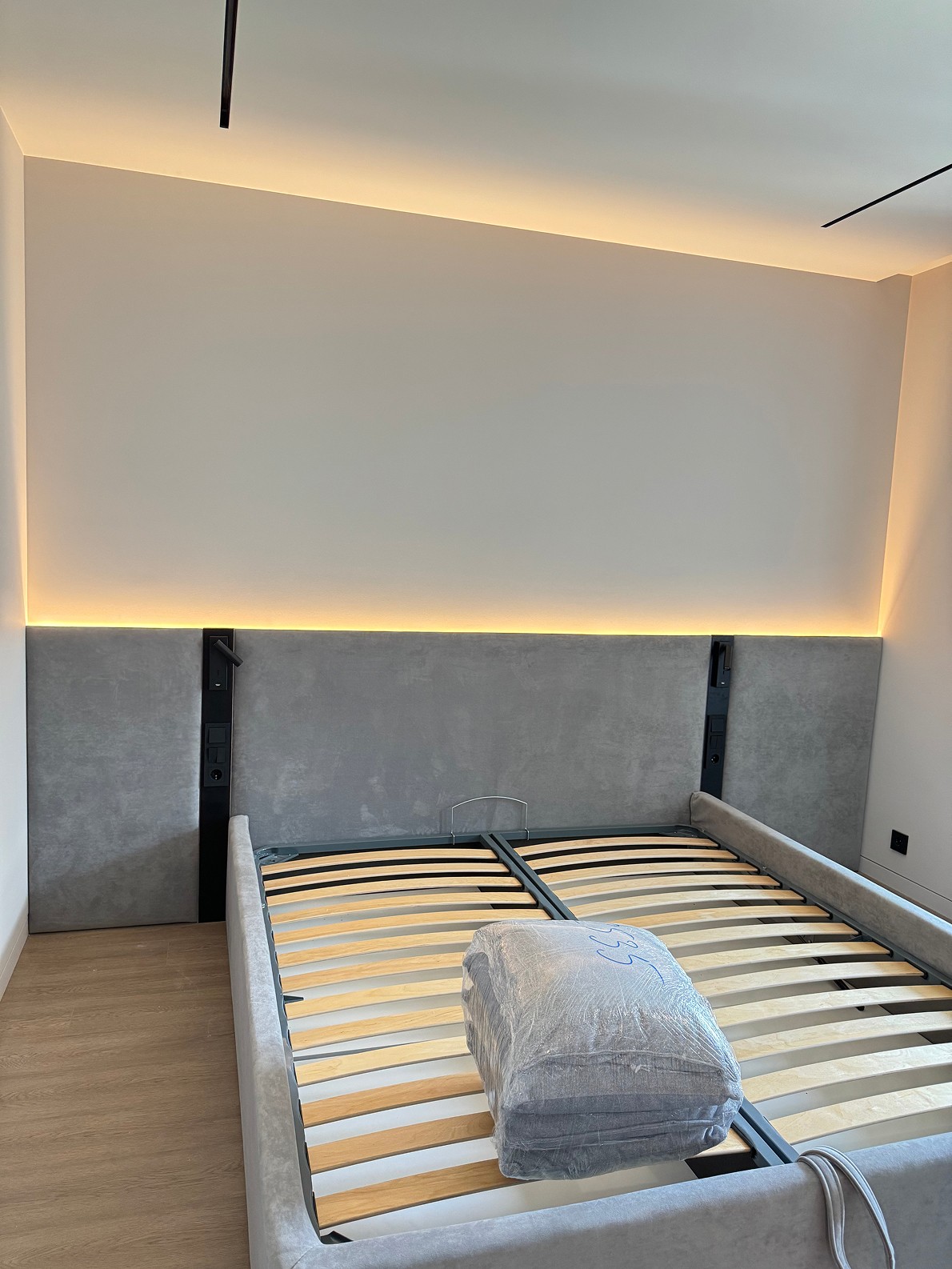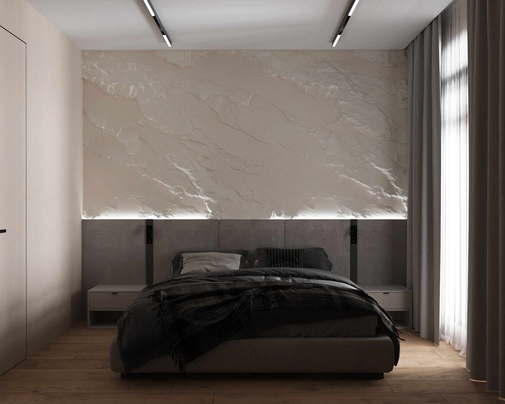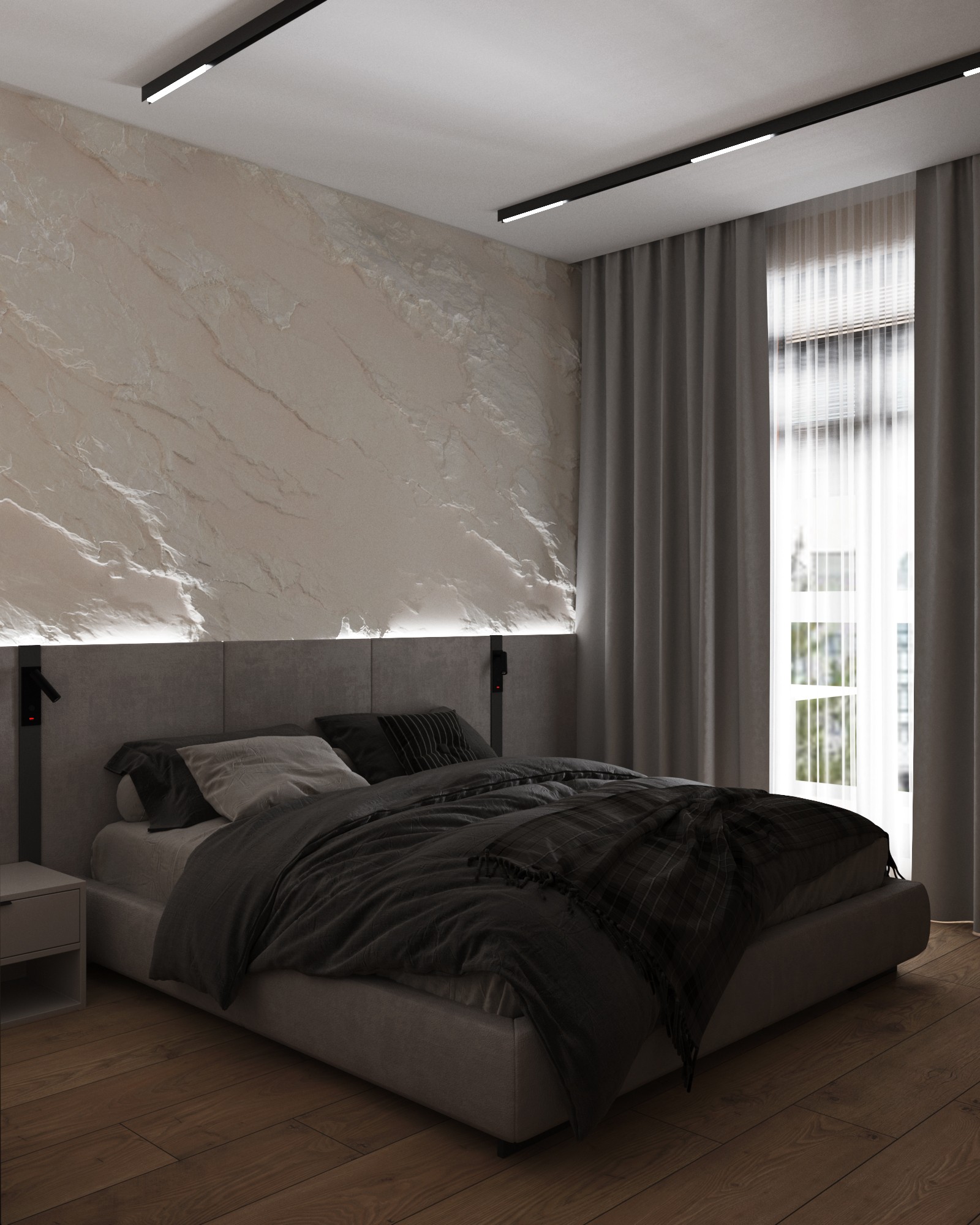 В спальне за изголовьем кровати нанесена декоративная штукатурка с имитацией скалы, подсветка придает дополнительный объем и графичность. Также в спальне выделена достаточно вместительная гардеробная, где разместились все личные вещи хозяина квартиры.