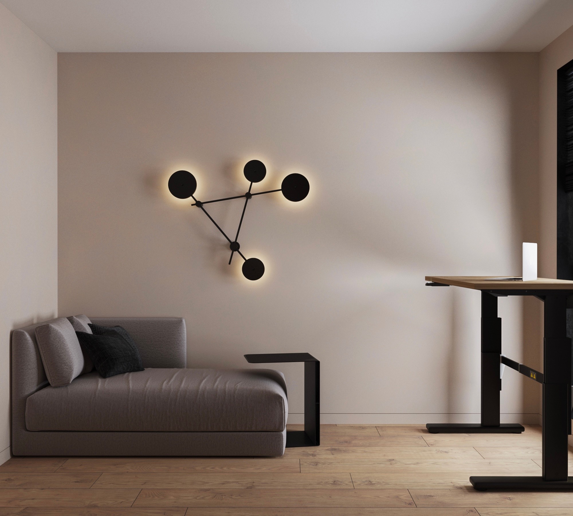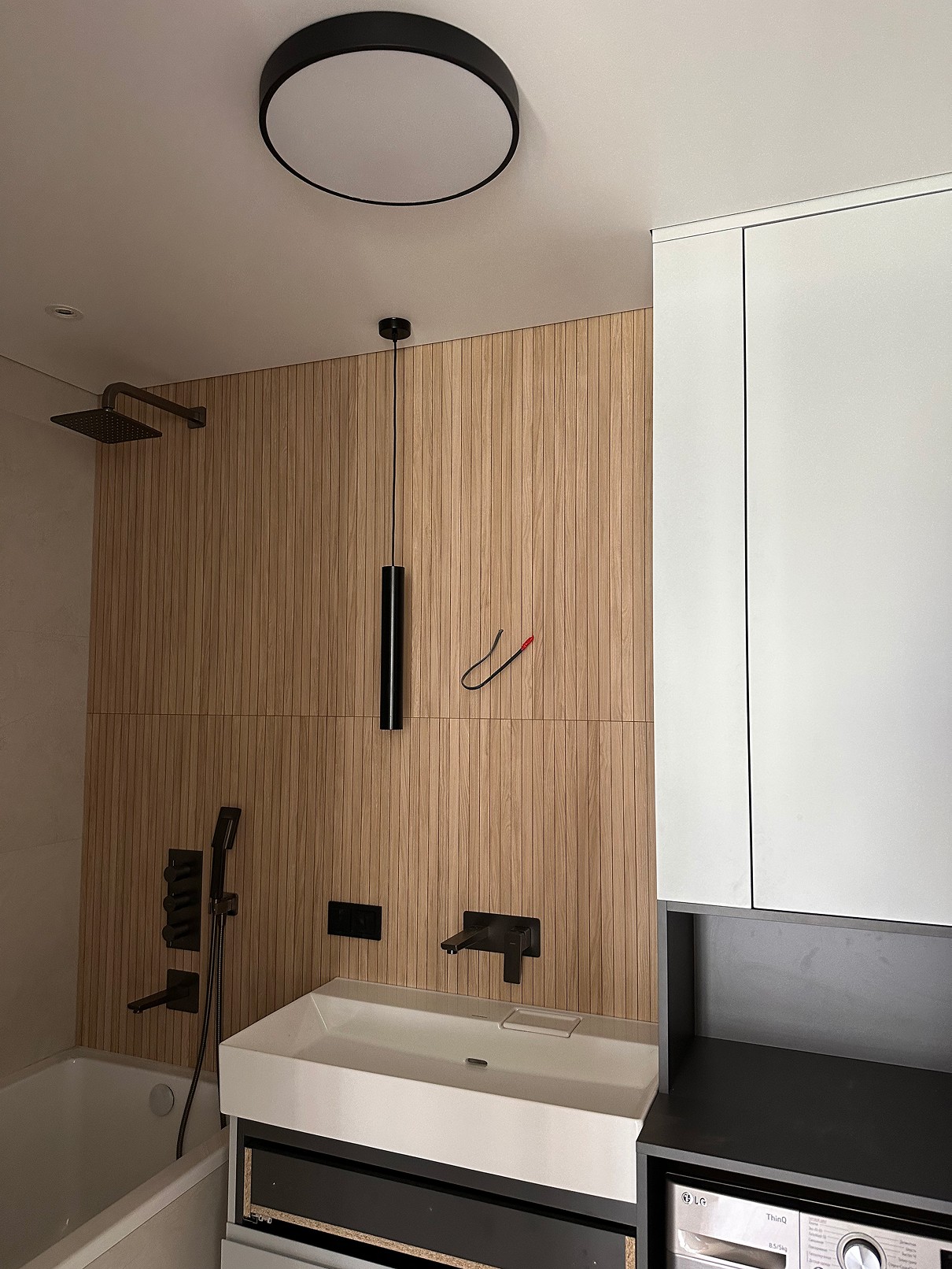 По всей квартире используется накладное освещение и это не просто так, за гипсокартонным потолком проходят трубы приточно-вытяжной вентиляции и для того, чтобы дополнительно не опускать потолки под встроенные светильники было решено использовать именно накладной тип монтажа светильников.