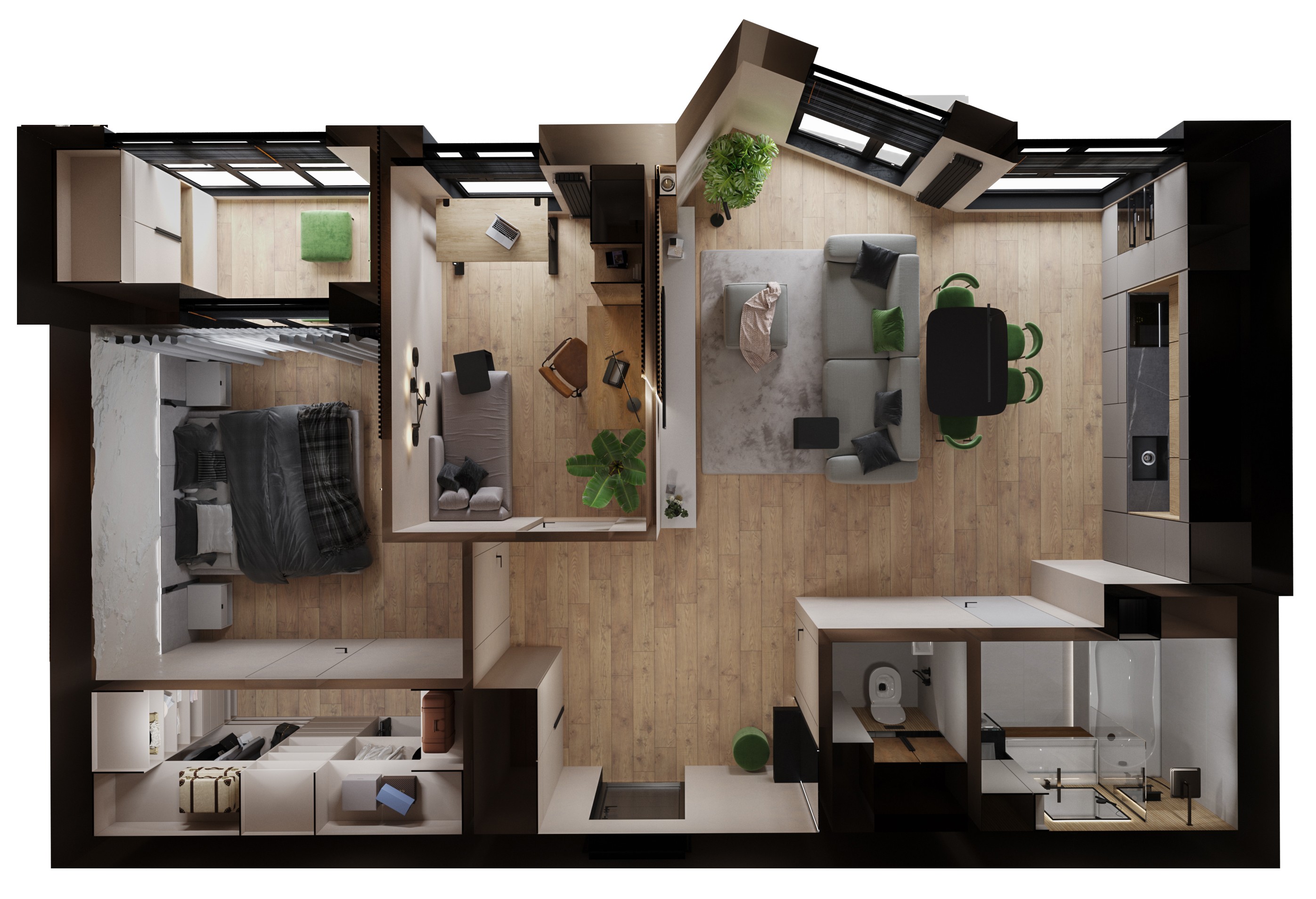 Удобное пространство для холостяка, где можно и поработать, и отдохнуть. В интерьере не должно быть никаких украшательств.