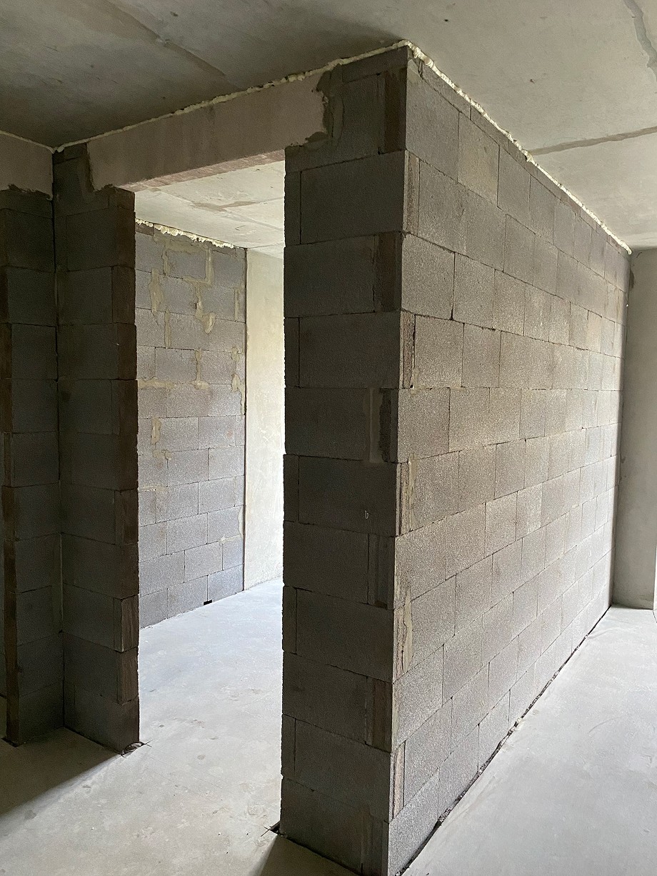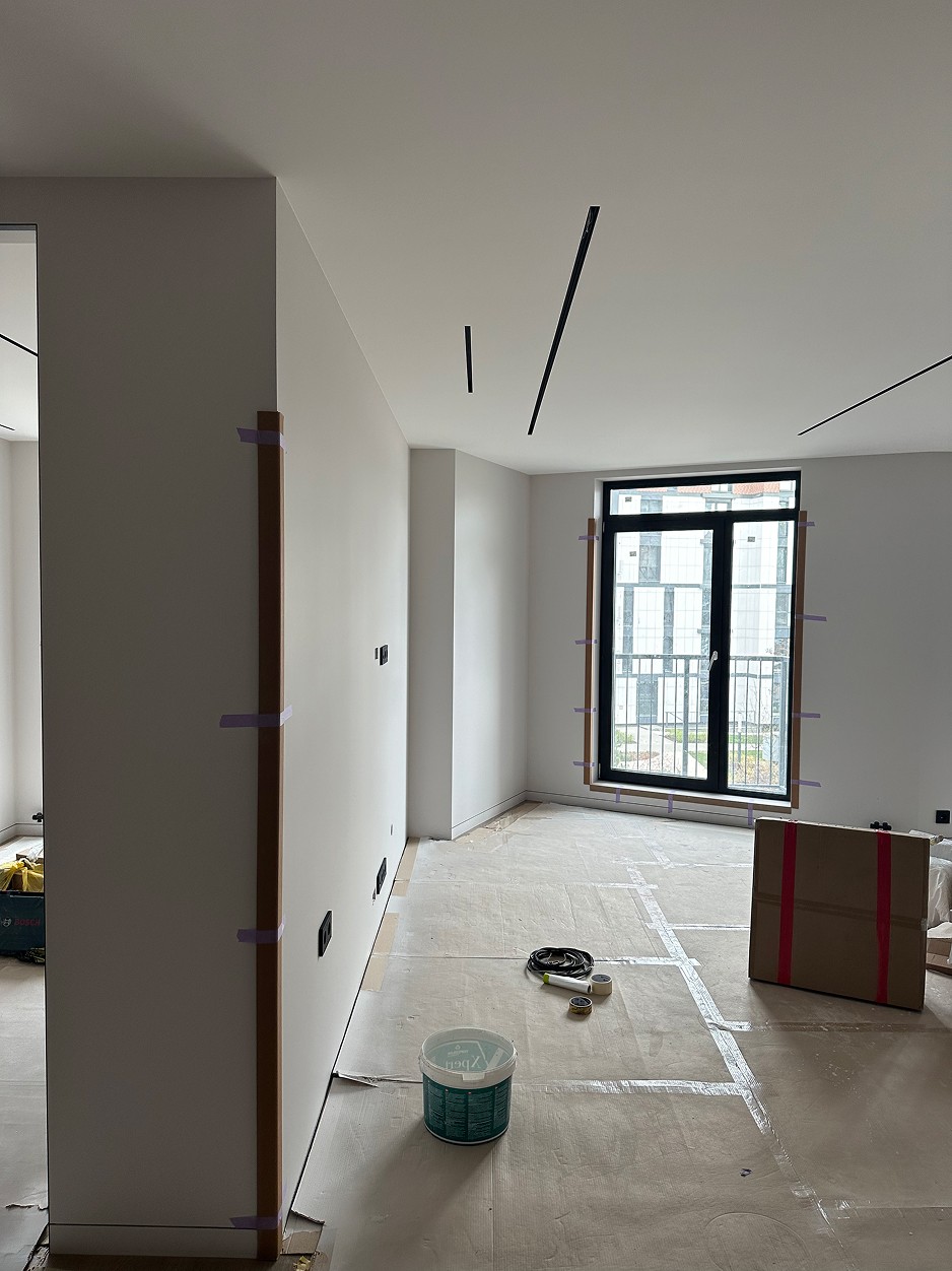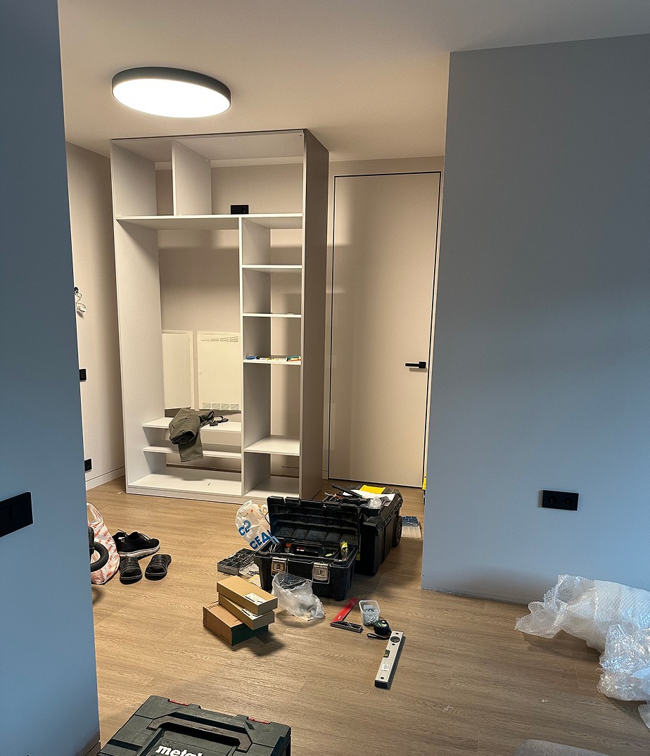 От застройщика нам досталась квартира-студия без перегородок, а главной задачей было обязательное наличие изолированной спальни с гардеробной, а также отдельного кабинета, потому что хозяин квартиры работает дома и ему нужен не просто отдельный стол, а именно изолированный кабинет с двумя рабочими столами, один из которых регулируется по высоте для возможности работать стоя.