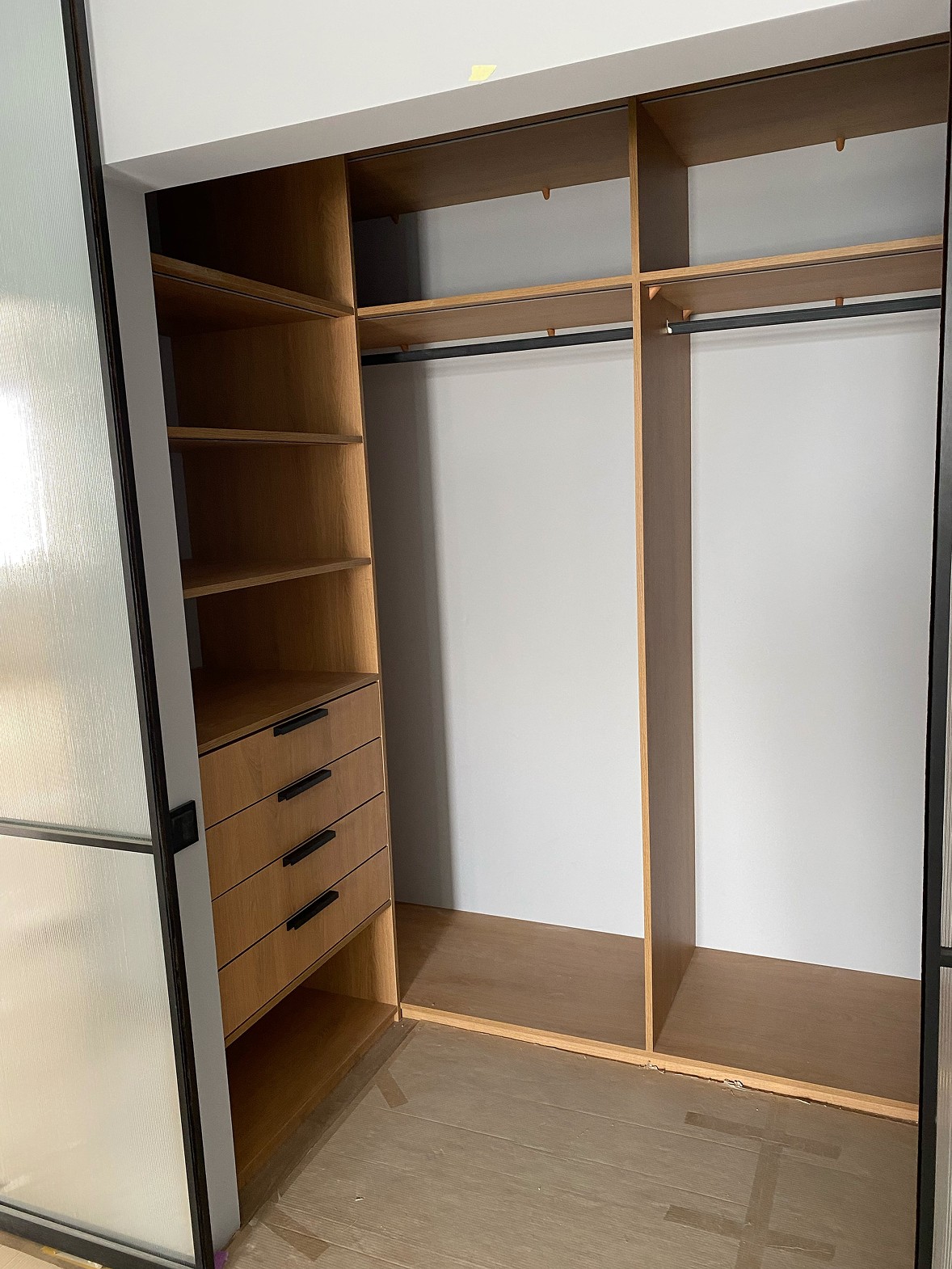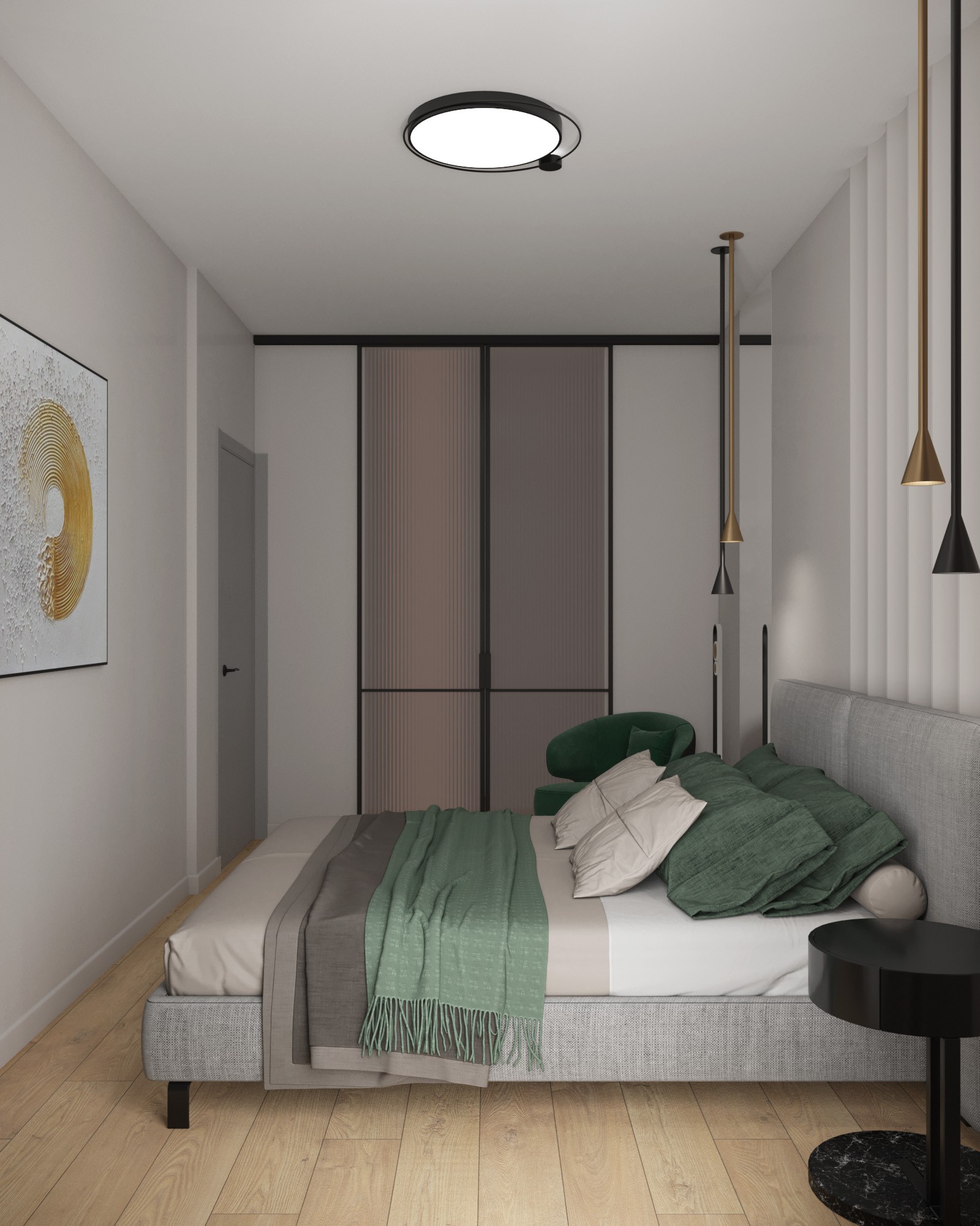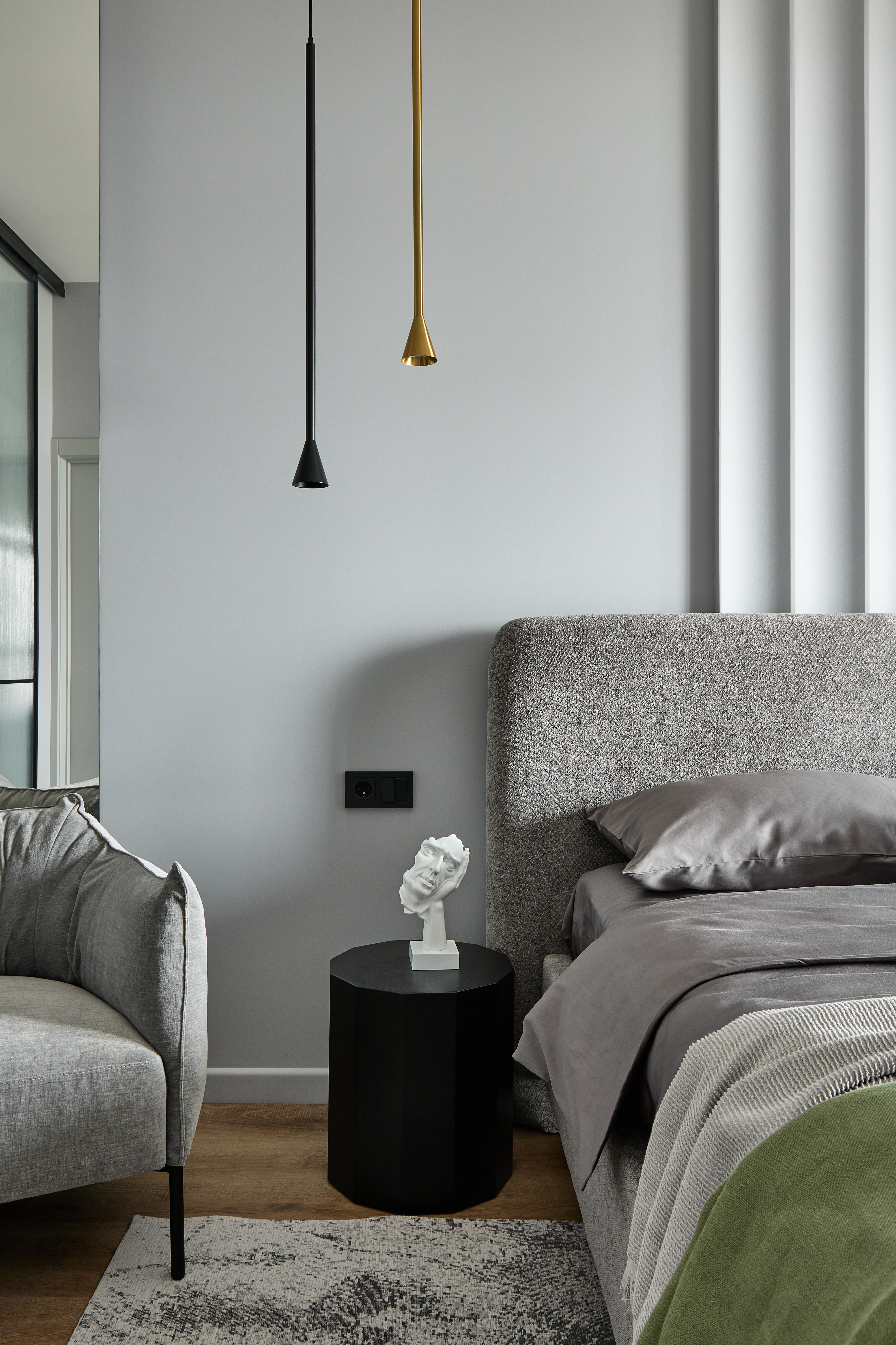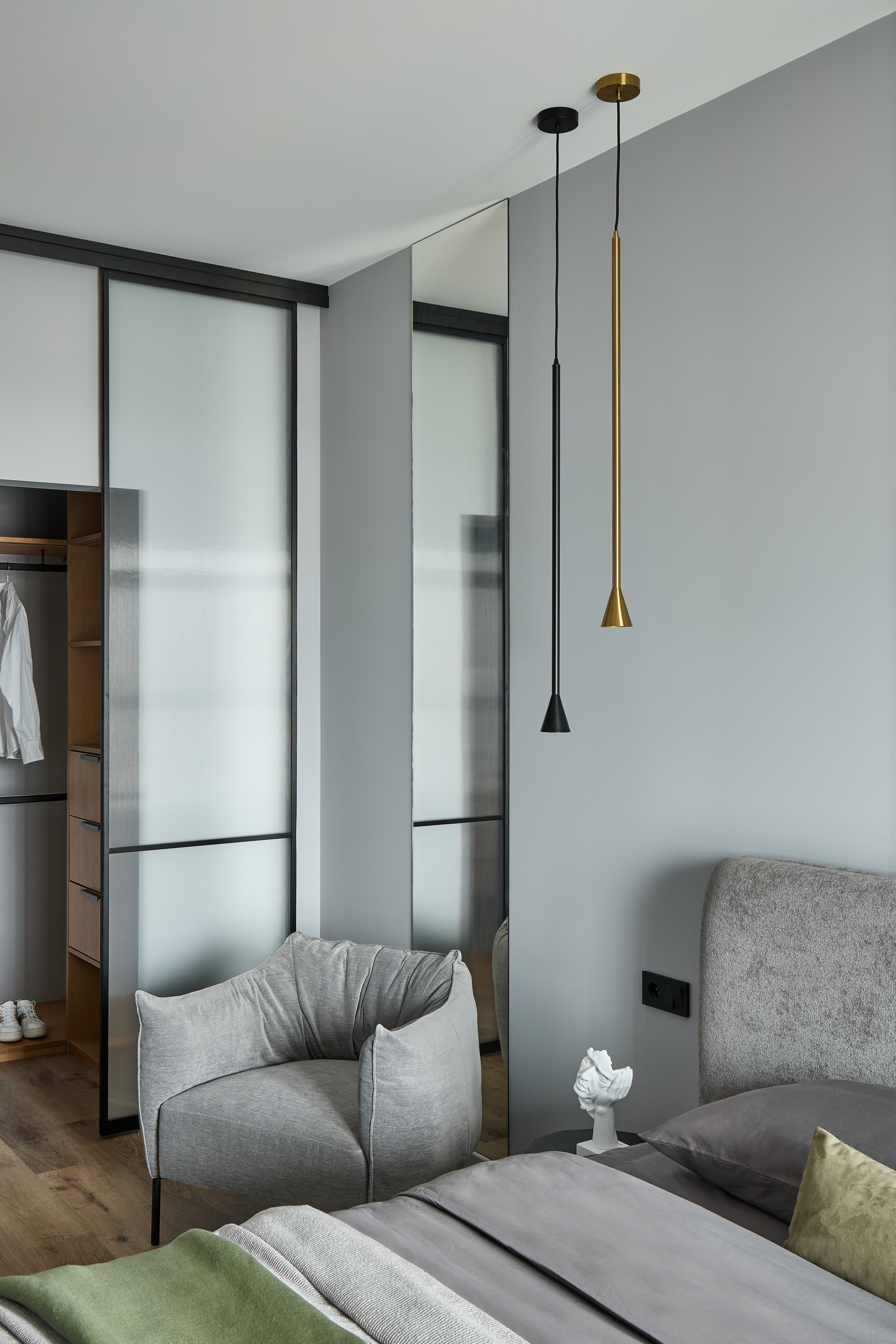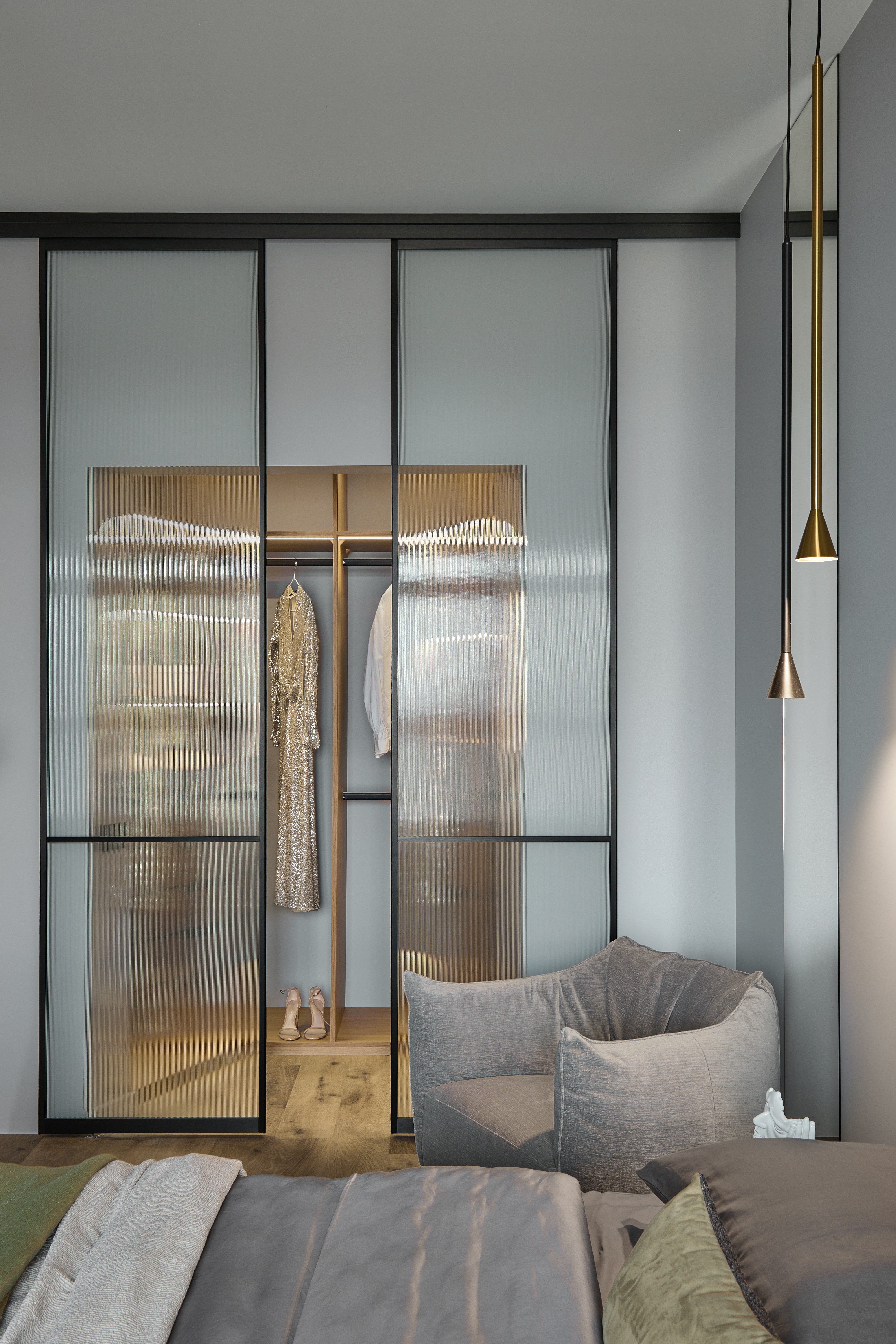 В спальне мы предусмотрели вместительную гардеробную за раздвижной стеклянной перегородкой, так как хозяйка квартиры очень любит шоппинг в разных странах мира и хранит большое множество вещей и обуви.