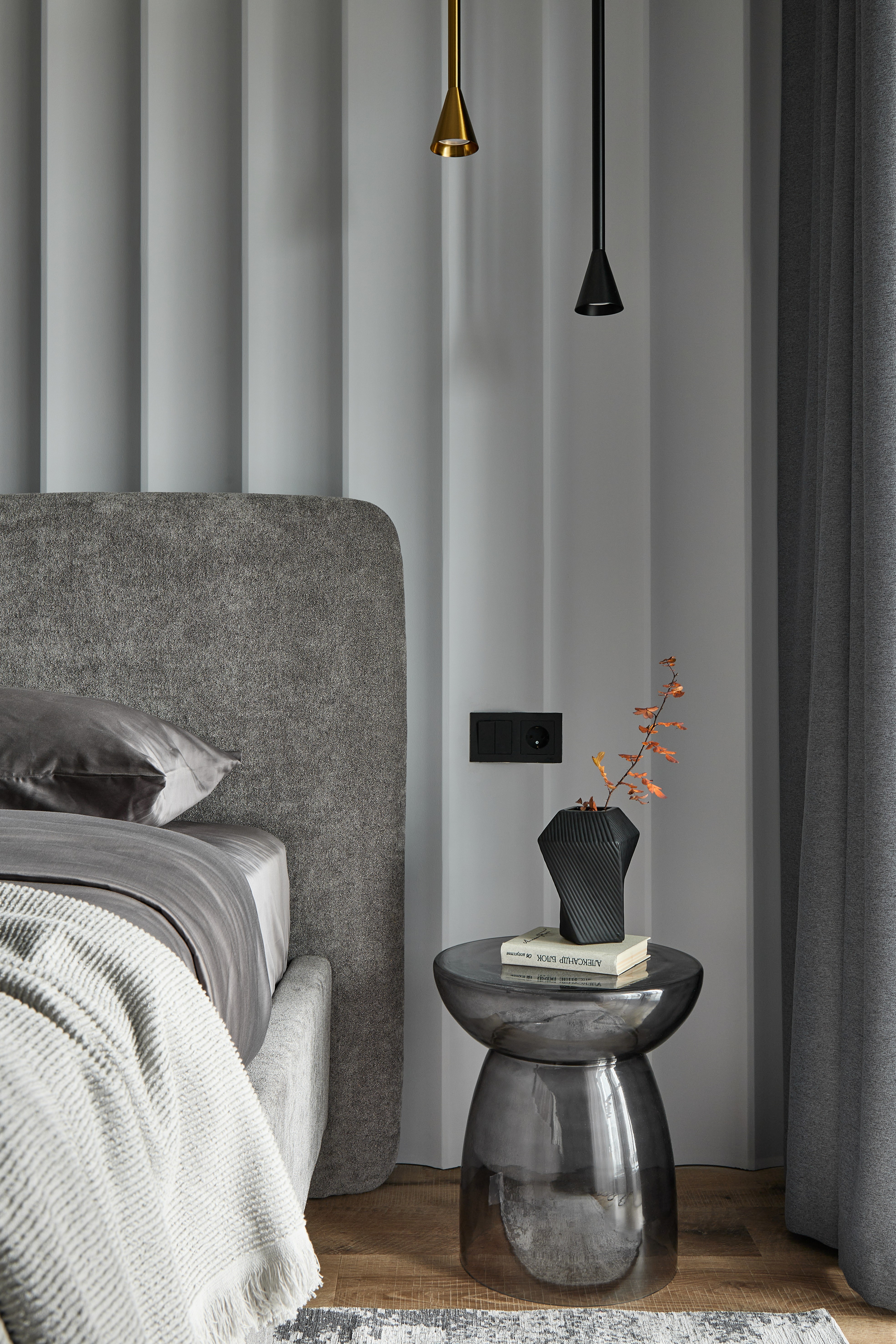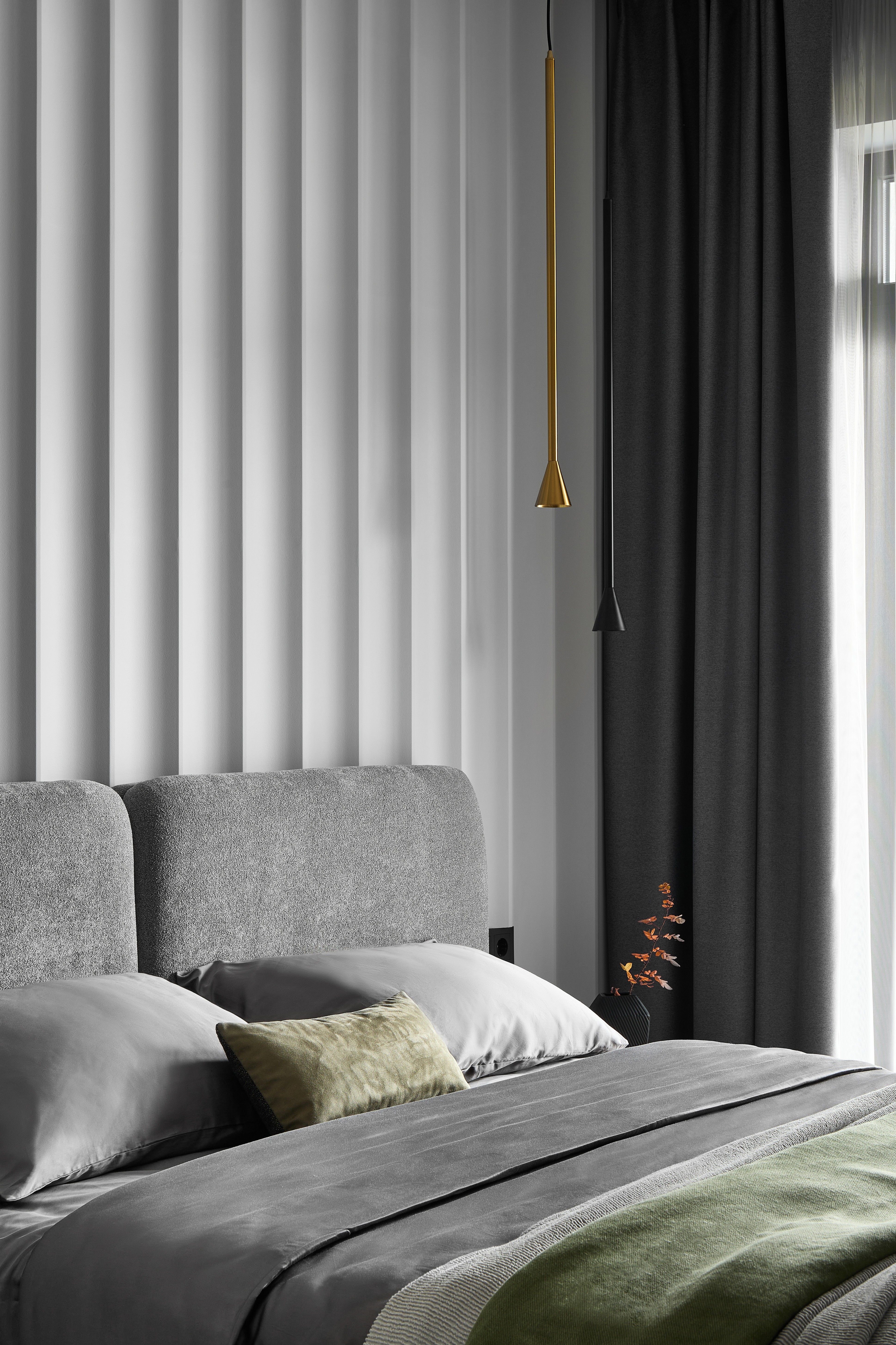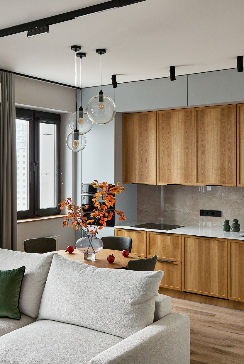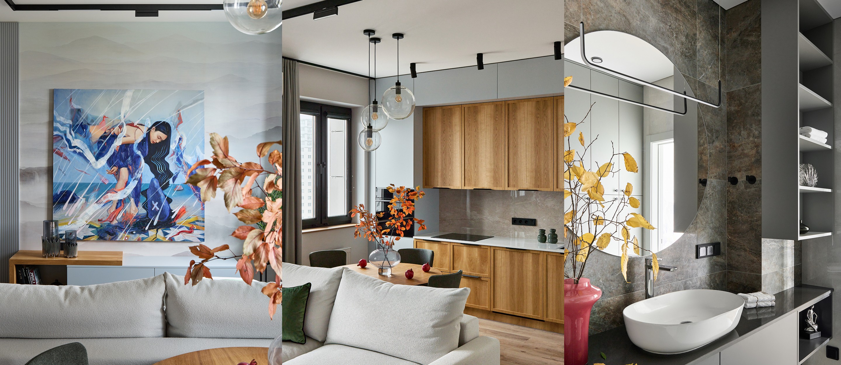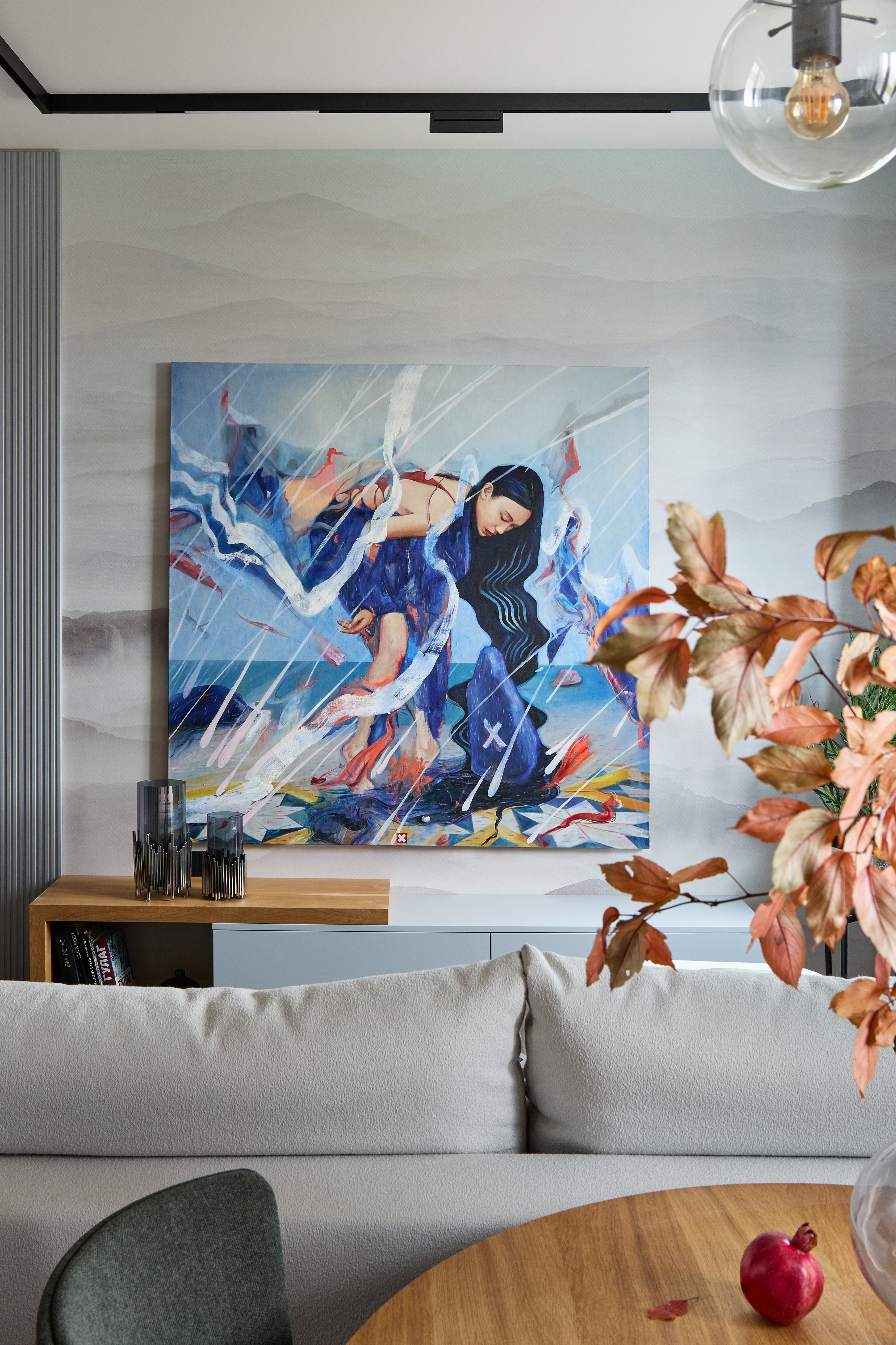 В интерьере преобладают спокойные и мягкие тона и материалы, а изюминкой интерьера стало искусство, которое разбавило и придало интерьеру жизнь и эмоции.