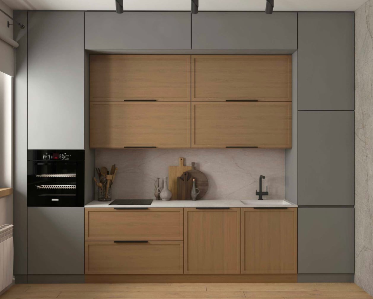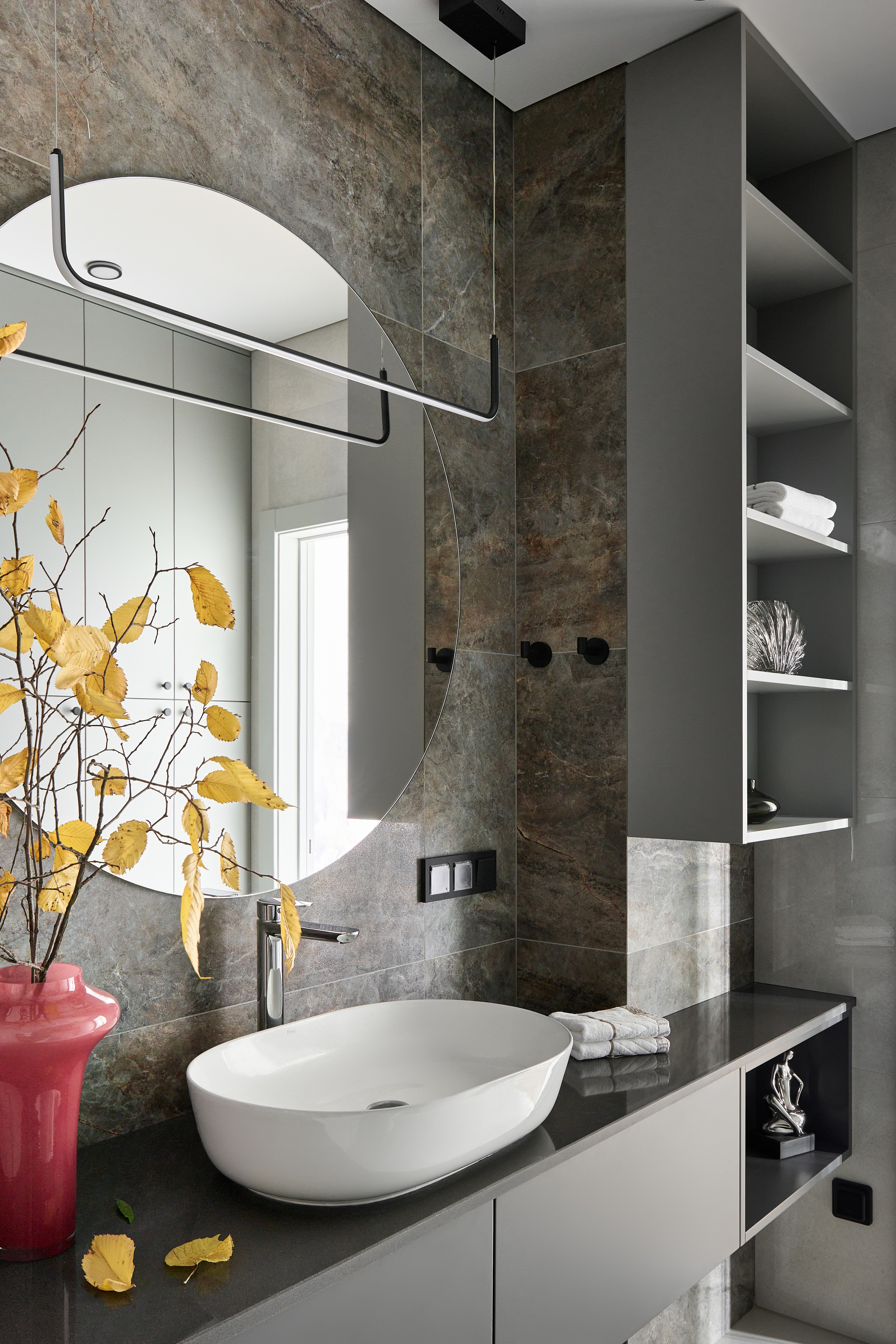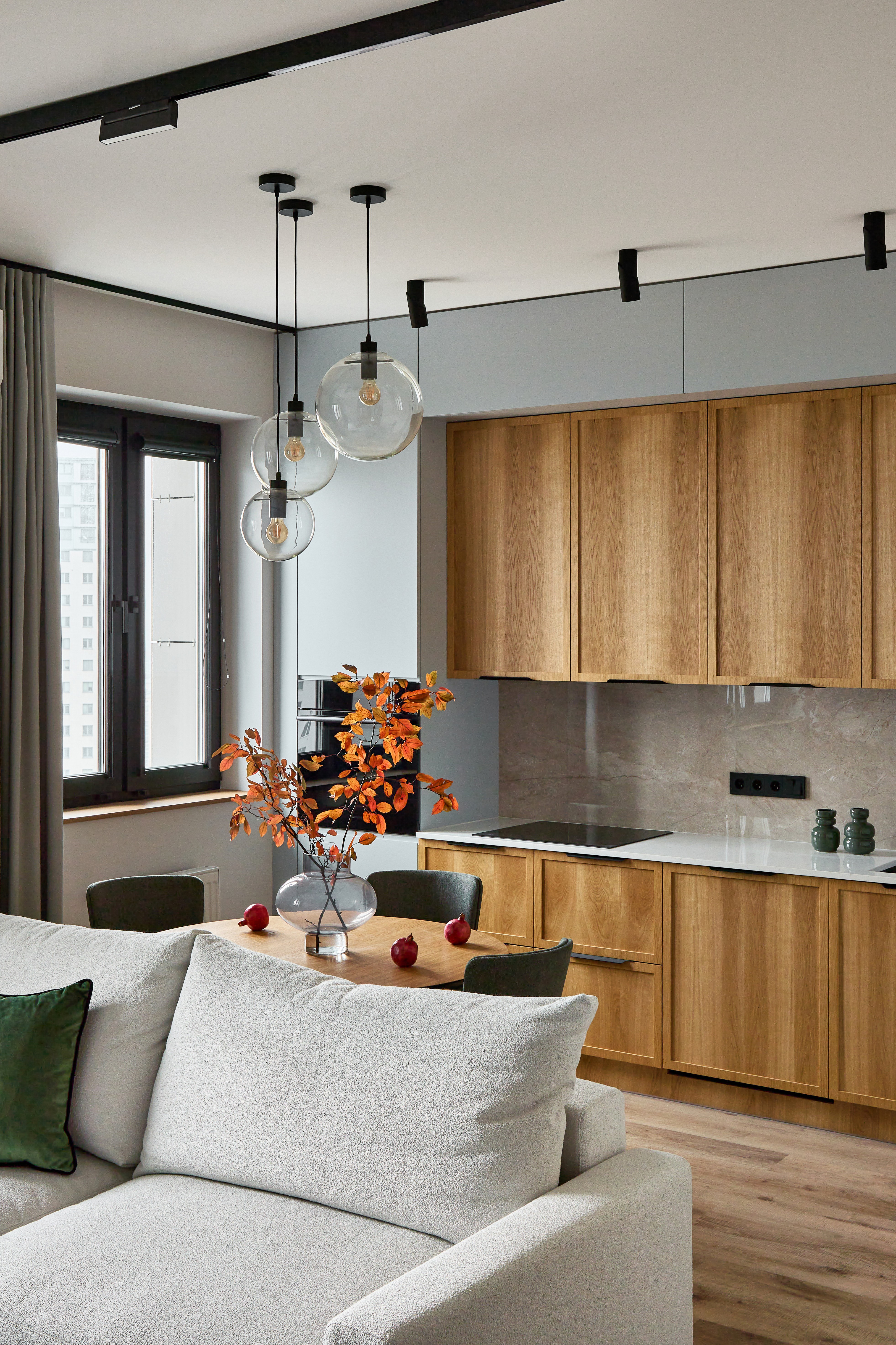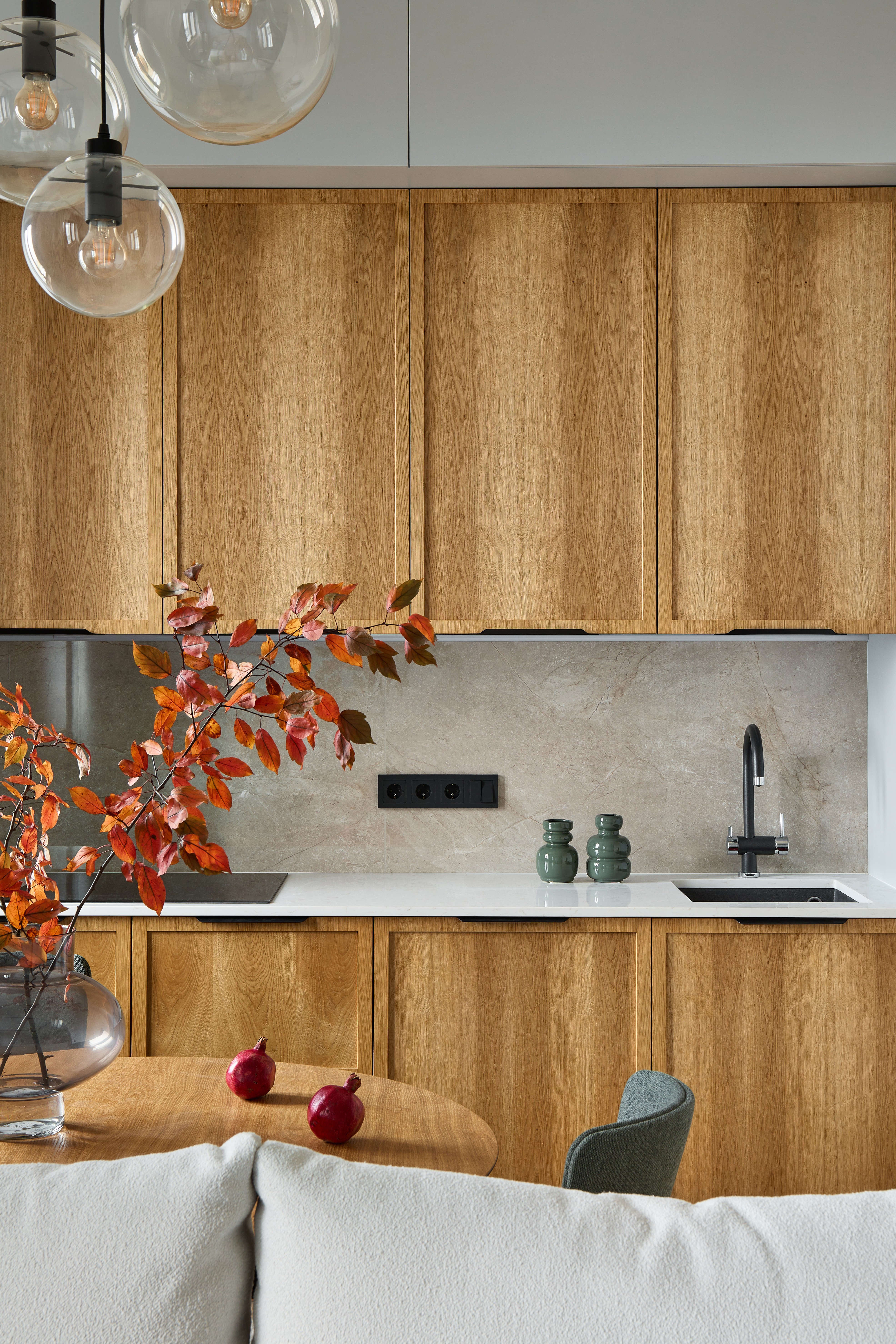 В интерьере преобладают спокойные и мягкие тона и материалы, а изюминкой интерьера стало искусство, которое разбавило и придало интерьеру жизнь и эмоции.