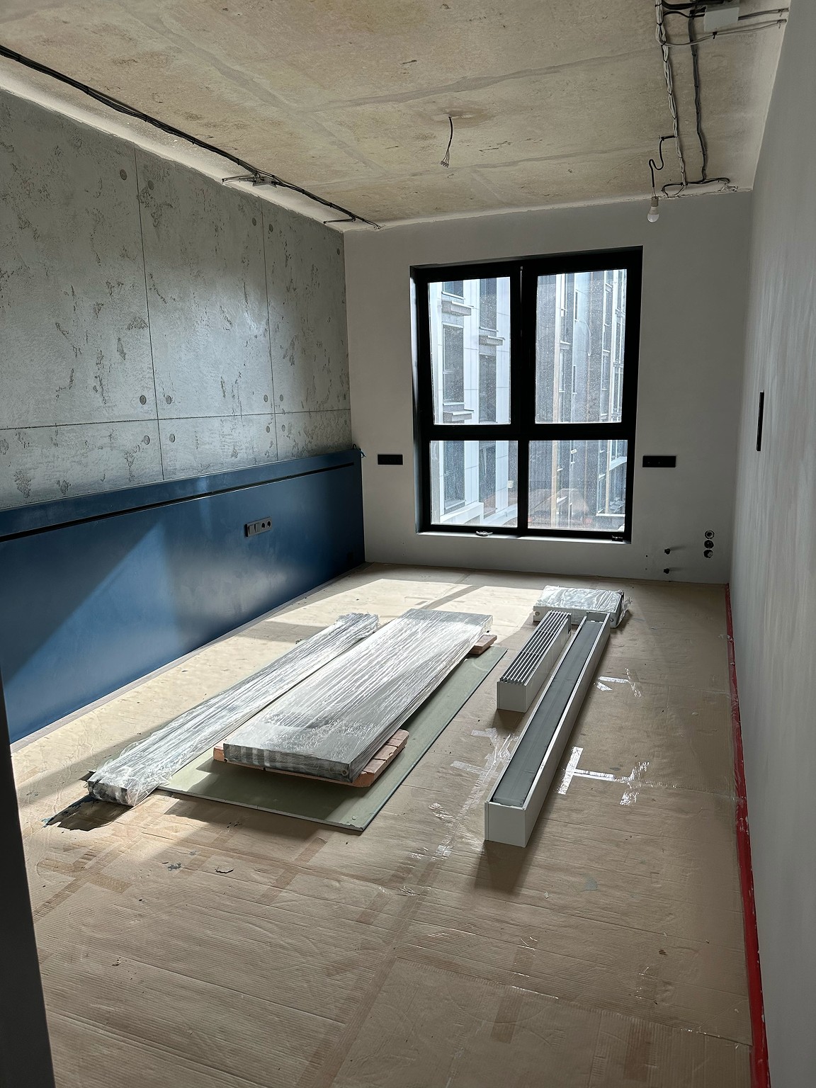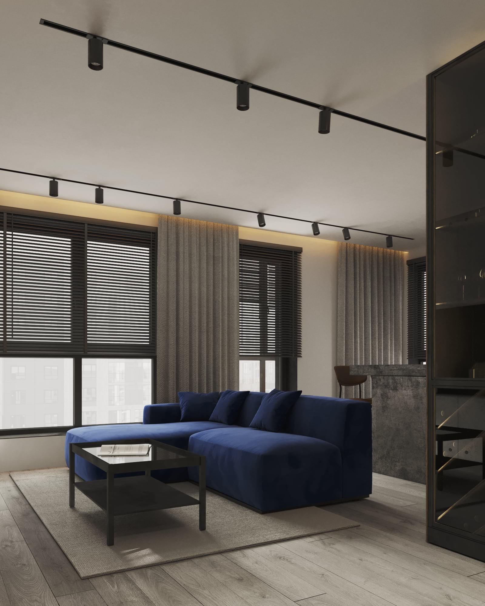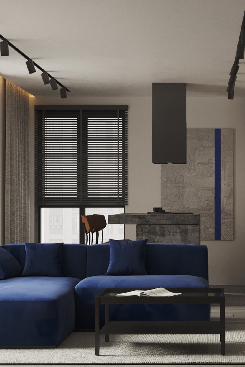 В гостиной разместился синий модульный диван. Заказчик просил по возможности с цветом быть крайне осторожными, так как не любит яркие оттенки, поэтому в квартире в основном применён приглушенный синий и в качестве ярких элементов использован горчичный, который в итоге очень понравился заказчику.