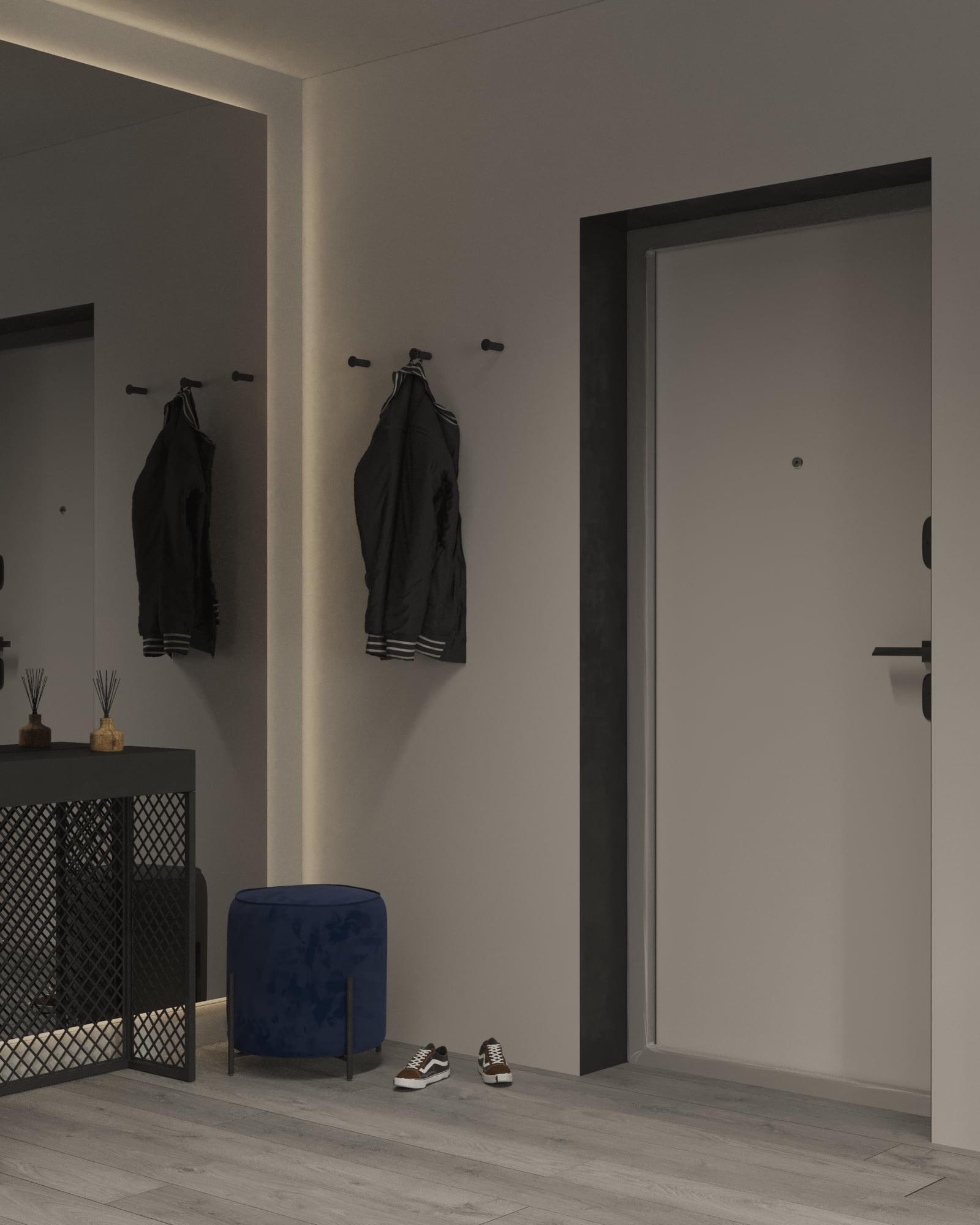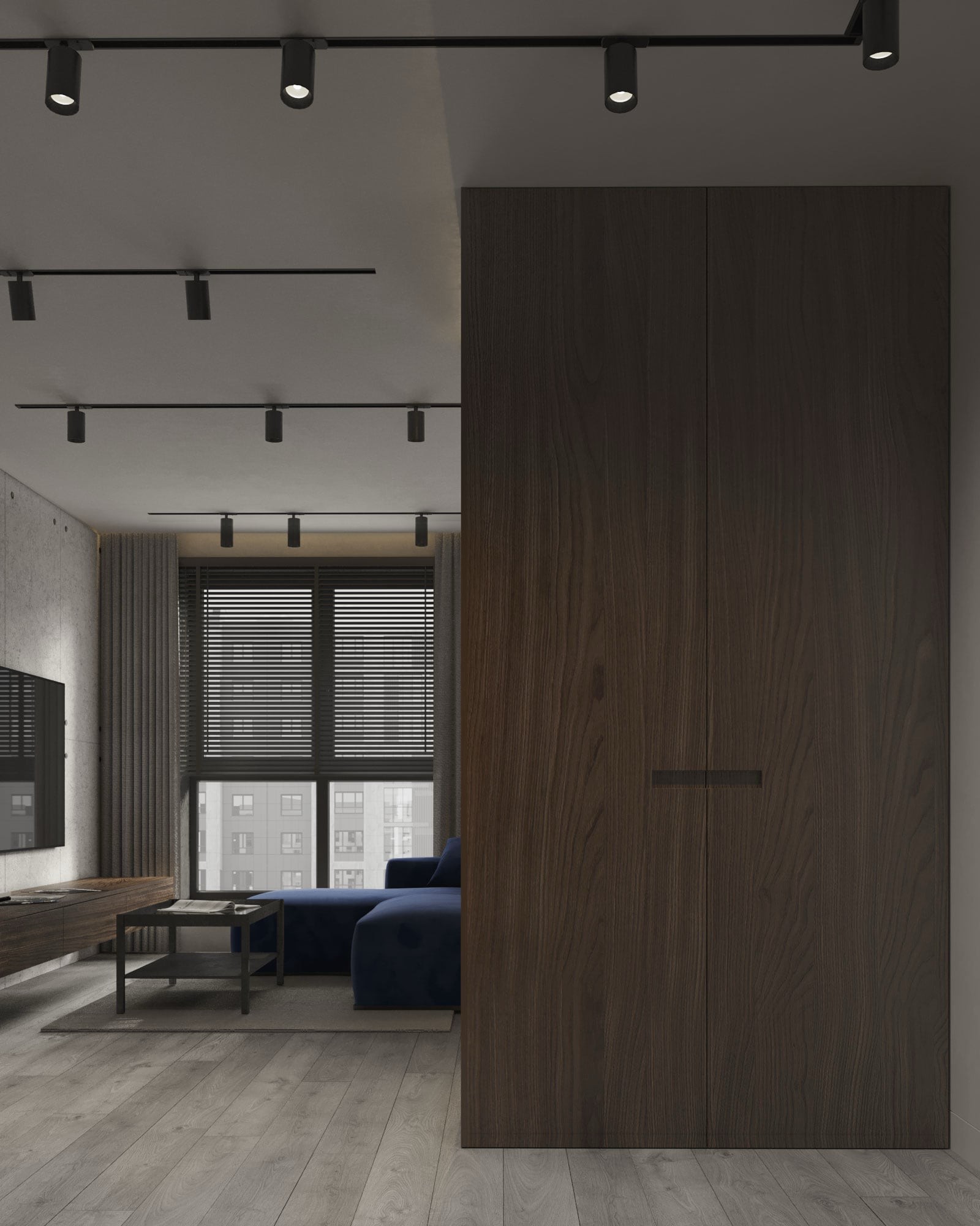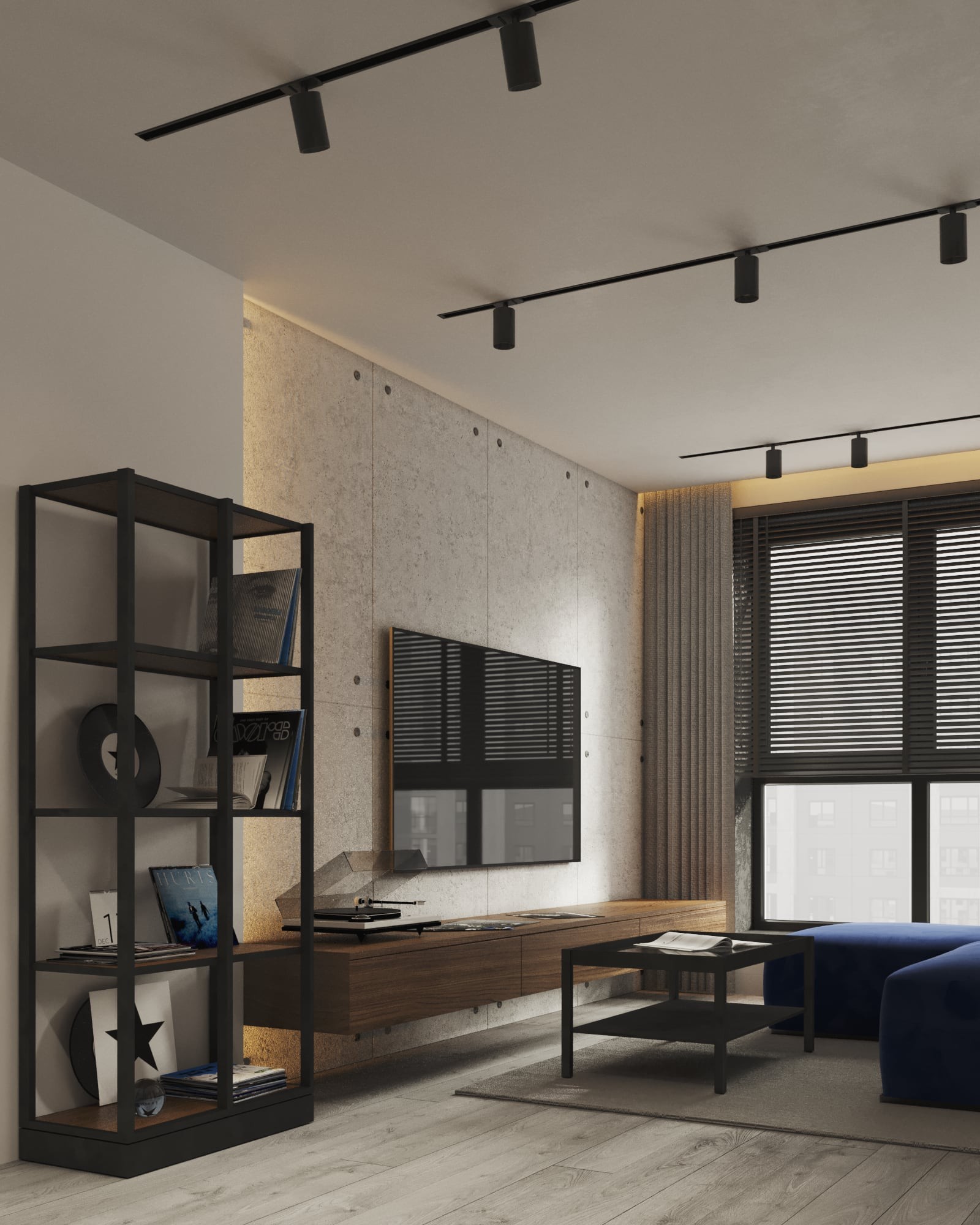 Квартира спроектирована для молодого парня-холостяка, у которого было несколько пожеланий: удобное большое рабочее место, потому что часто приходится работать из дома, большая зона TV с удобным диваном и душевая.