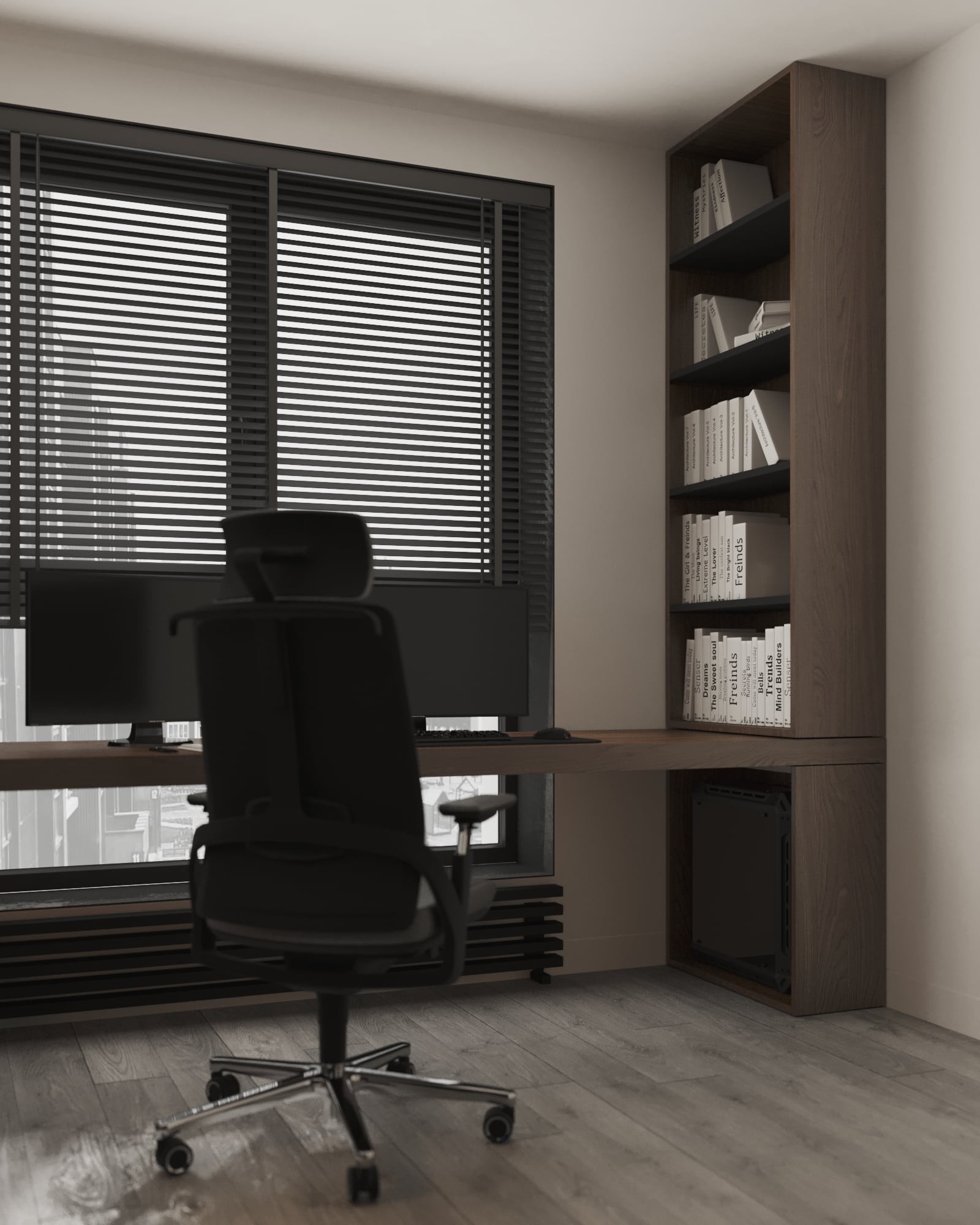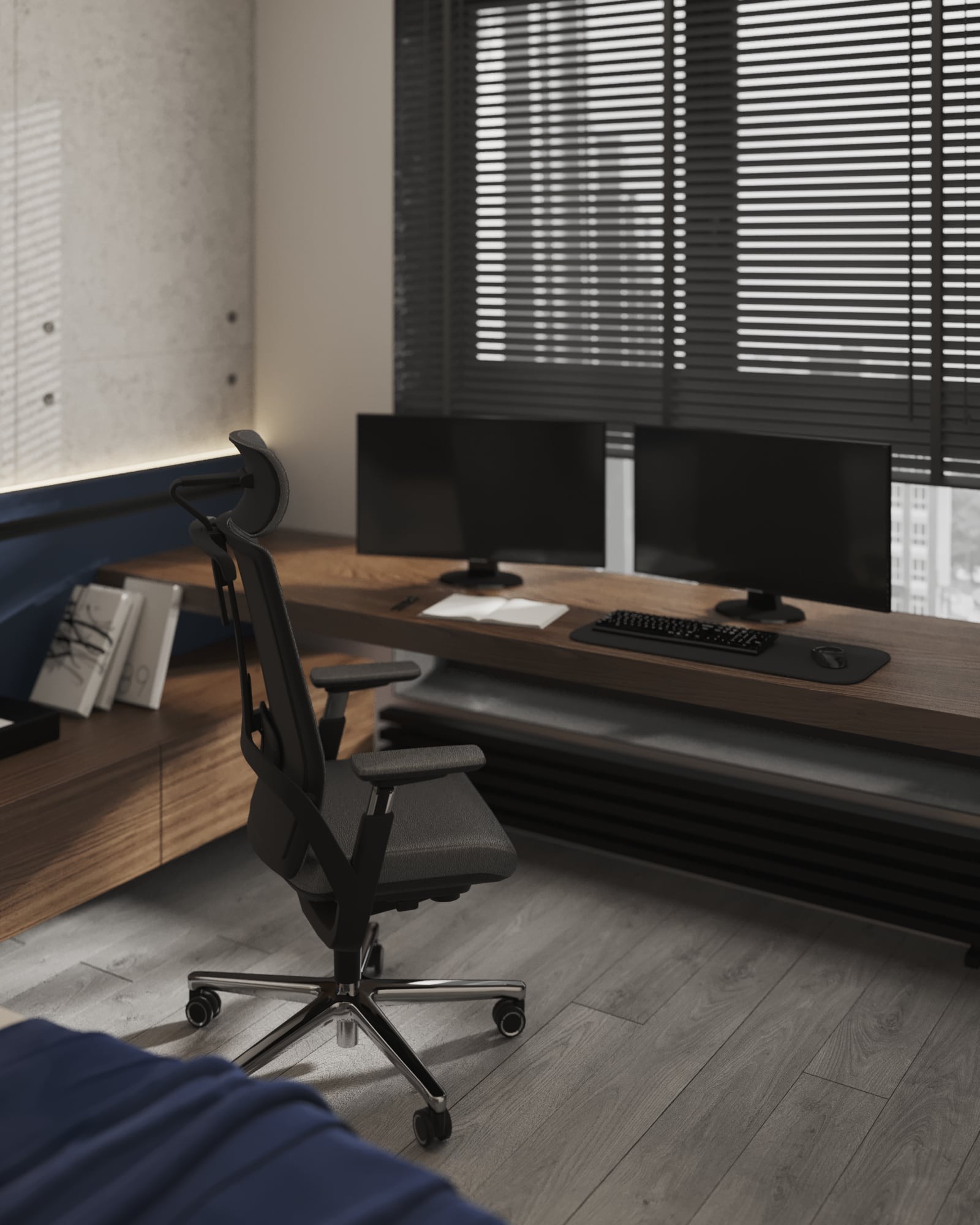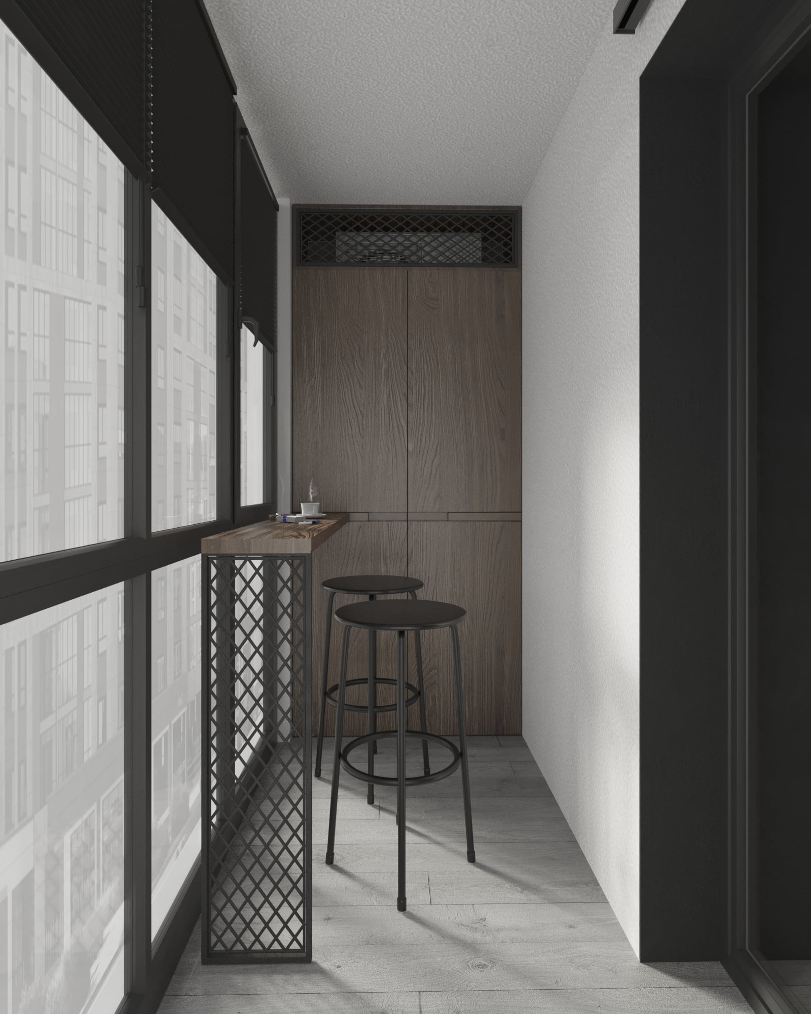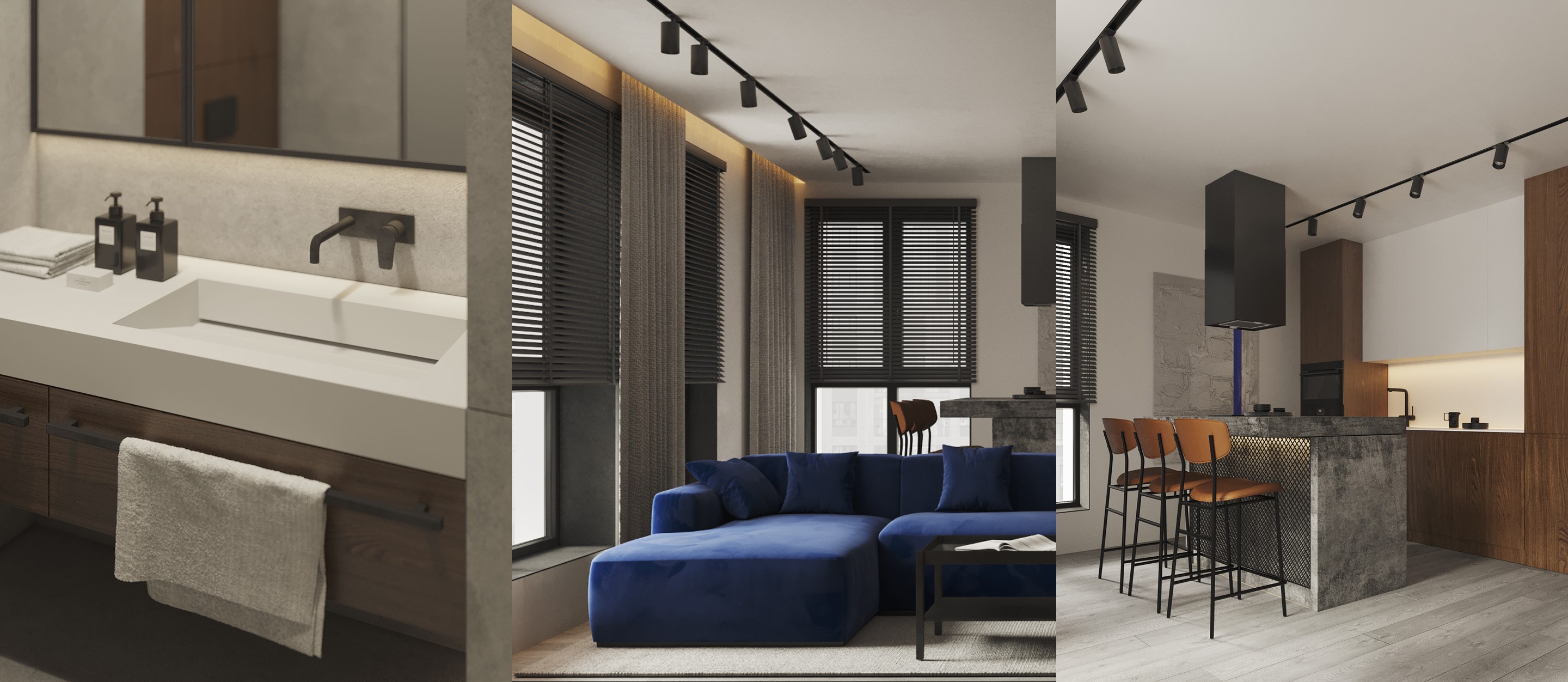 Квартира спроектирована для молодого парня-холостяка, у которого было несколько пожеланий: удобное большое рабочее место, потому что часто приходится работать из дома, большая зона TV с удобным диваном и душевая.