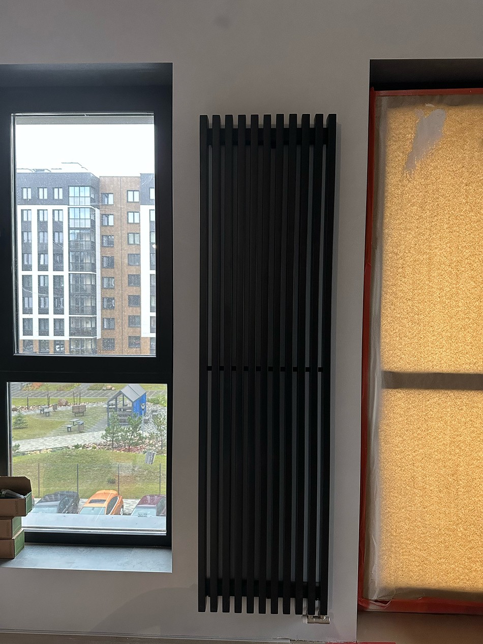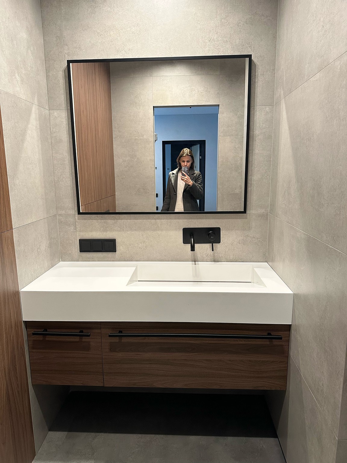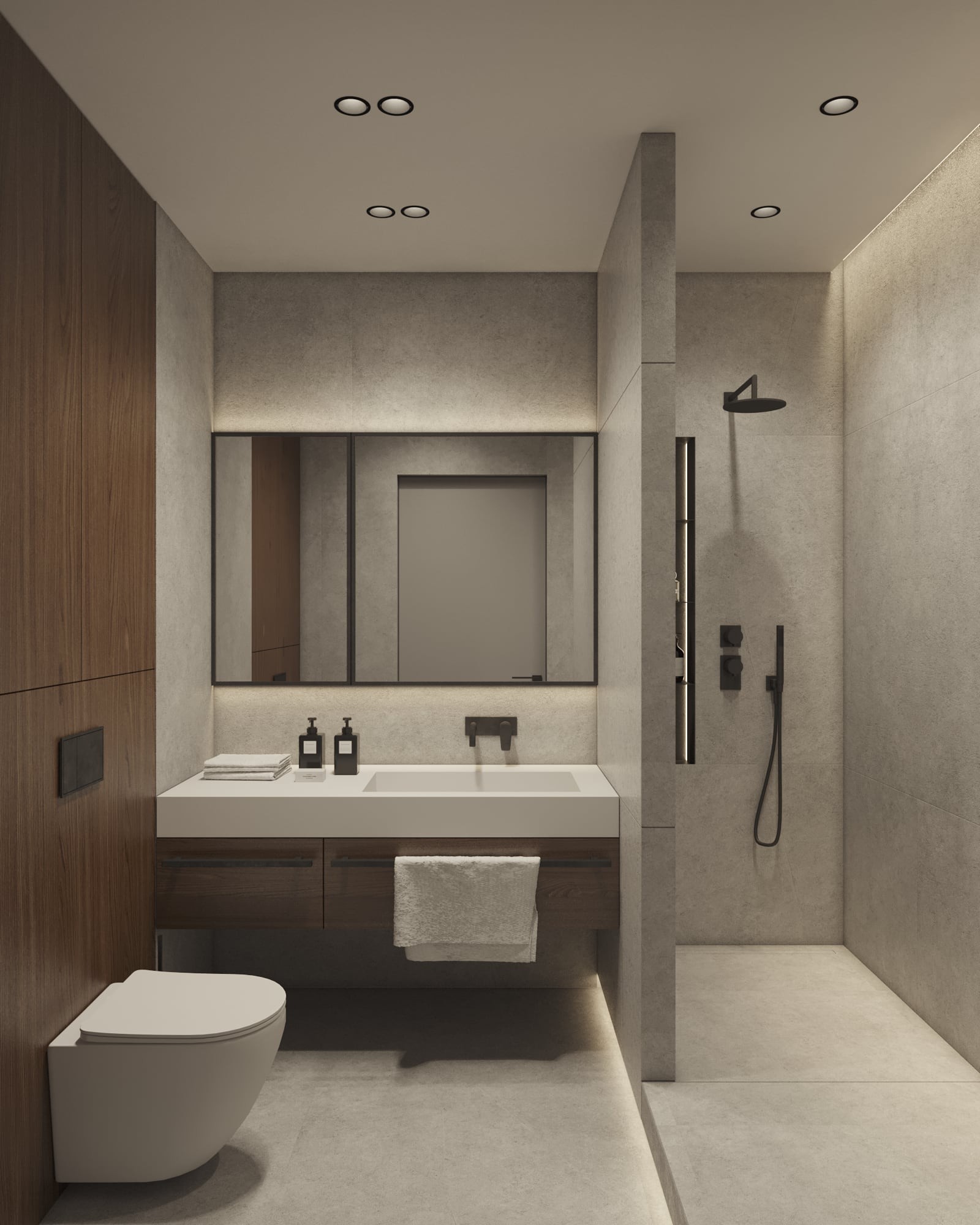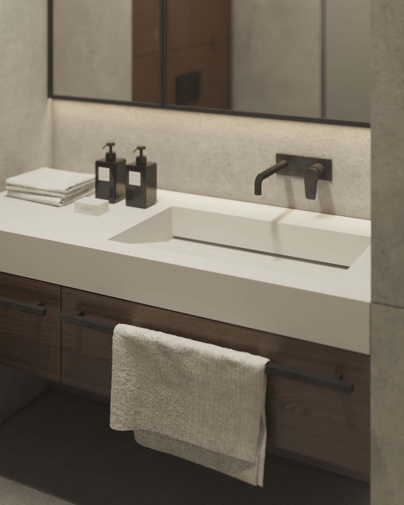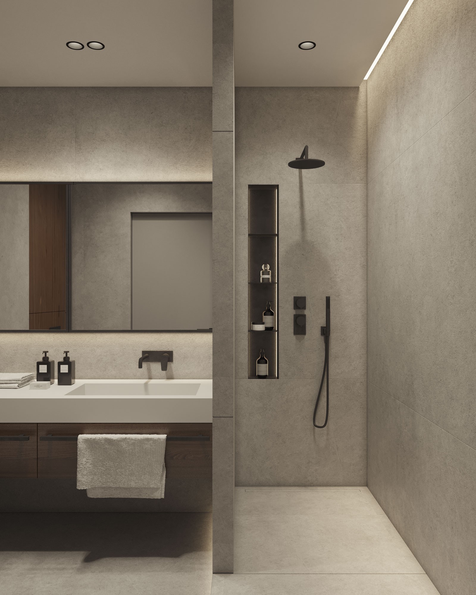 В санузле используется плитка под бетон в сочетании с деревом. Умывальник выполнен из кварцевого камня, а душевая имеет «свободный вход», что придаёт помещению дополнительный объём.