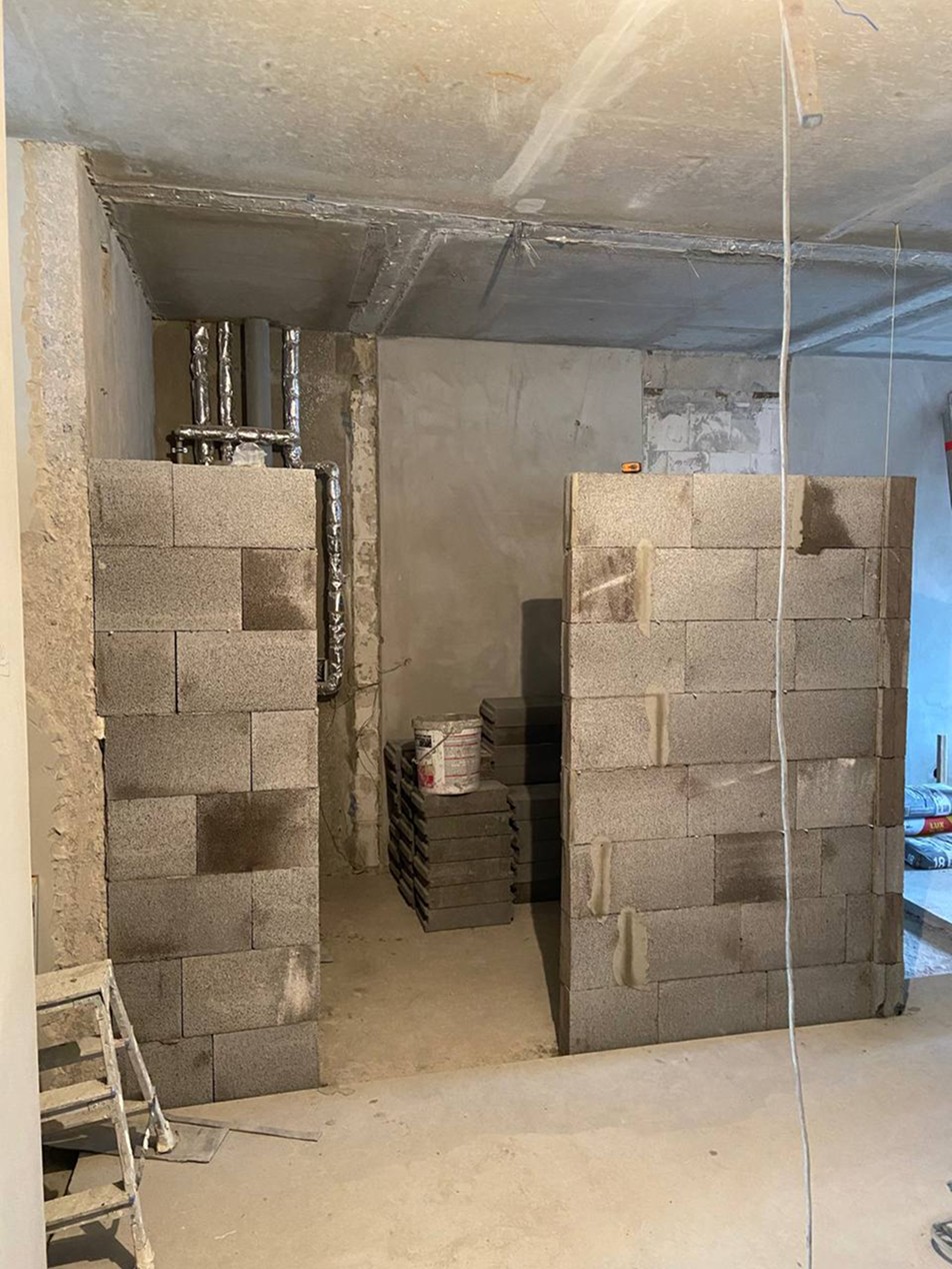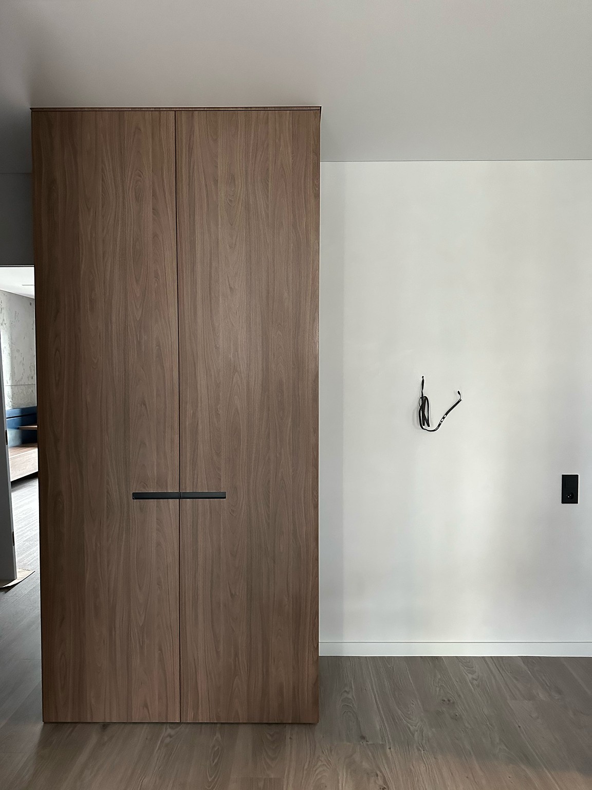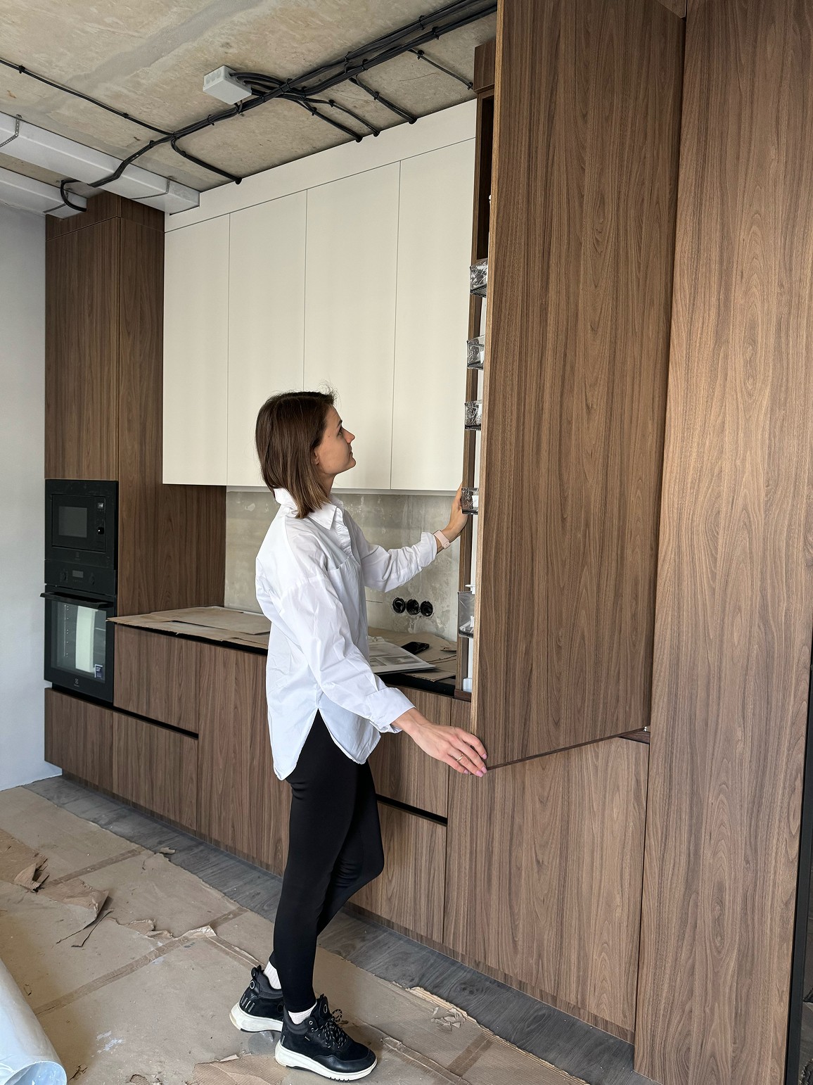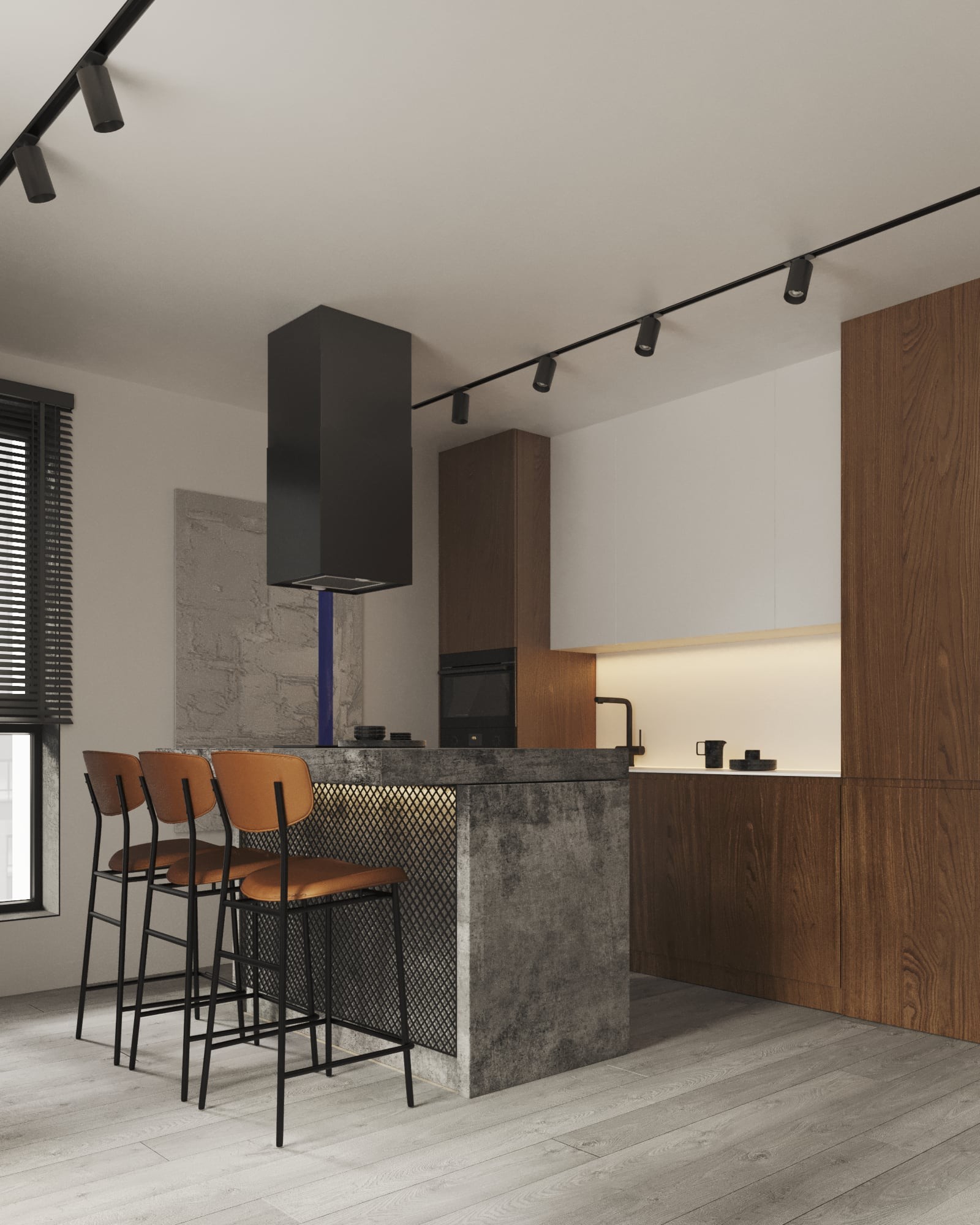 На кухне решено было использовать остров и полубарную стойку вместо стола, так как кухня получилась небольшая, остров добавляет дополнительное место готовки, а также дополнительные места хранения.