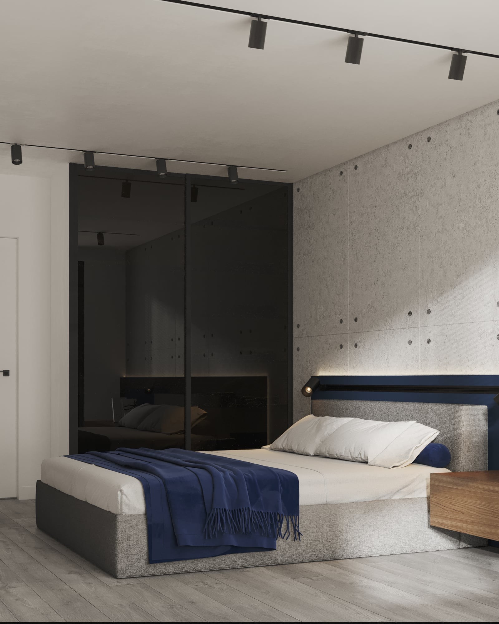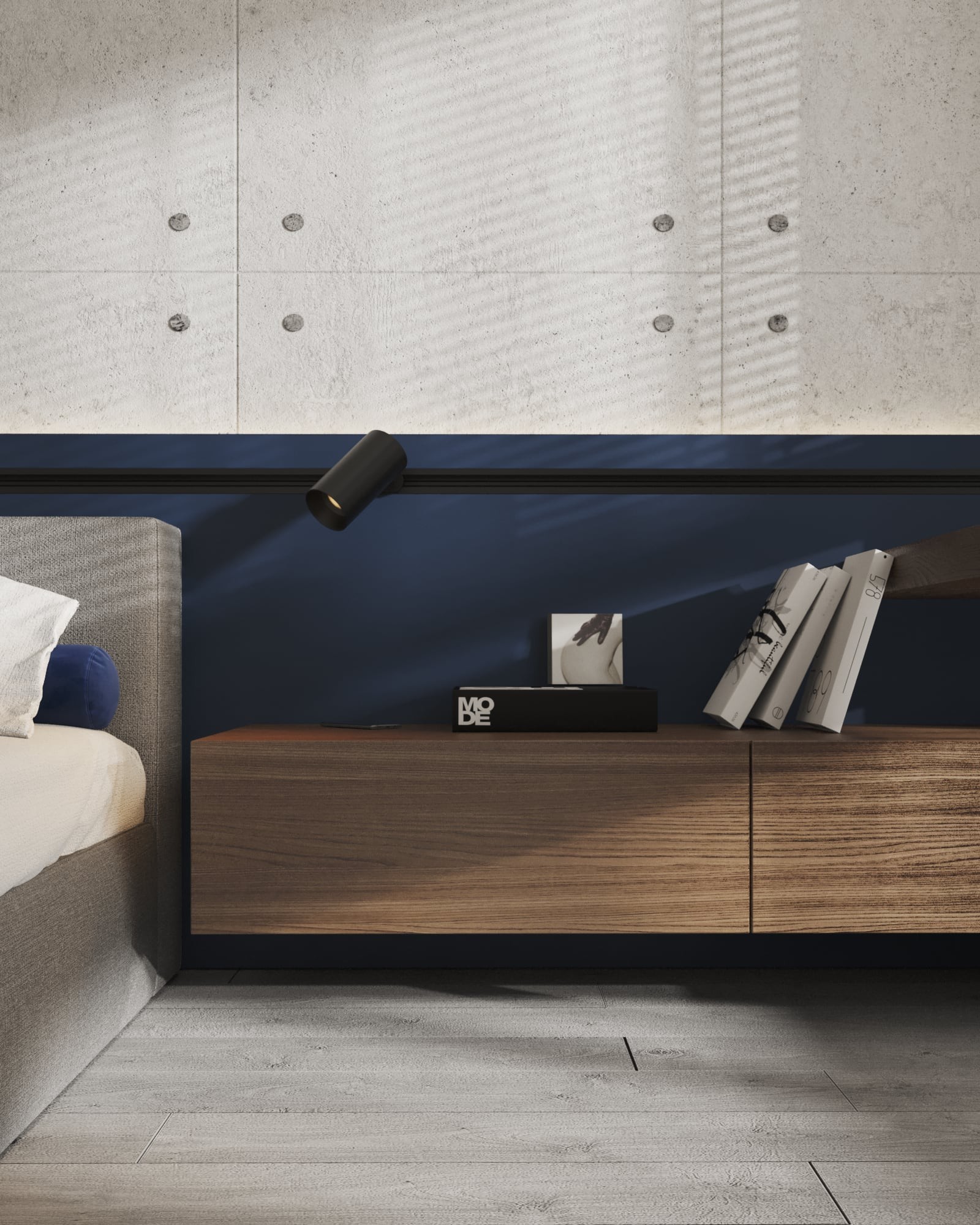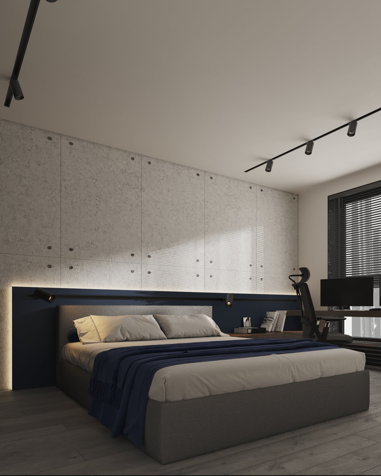 В спальне интересно обыграно изголовье кровати - это панель МДФ с врезным магнитным треком, куда самостоятельно можно вставлять, менять или добавлять магнитные светильники. Отделка за изголовьем кровати - декоративная штукатурка, имитирующая бетонные плиты, эта же штукатурка используется и в зоне TV в гостиной.