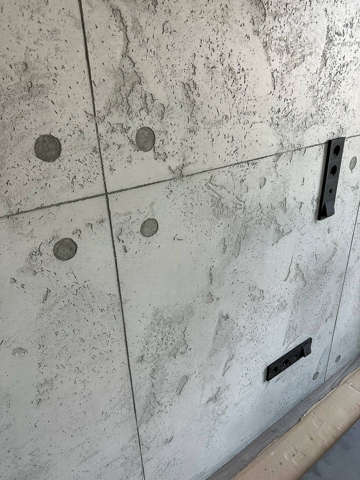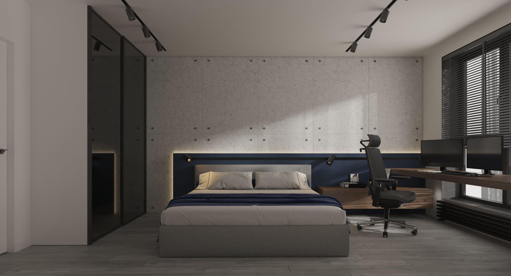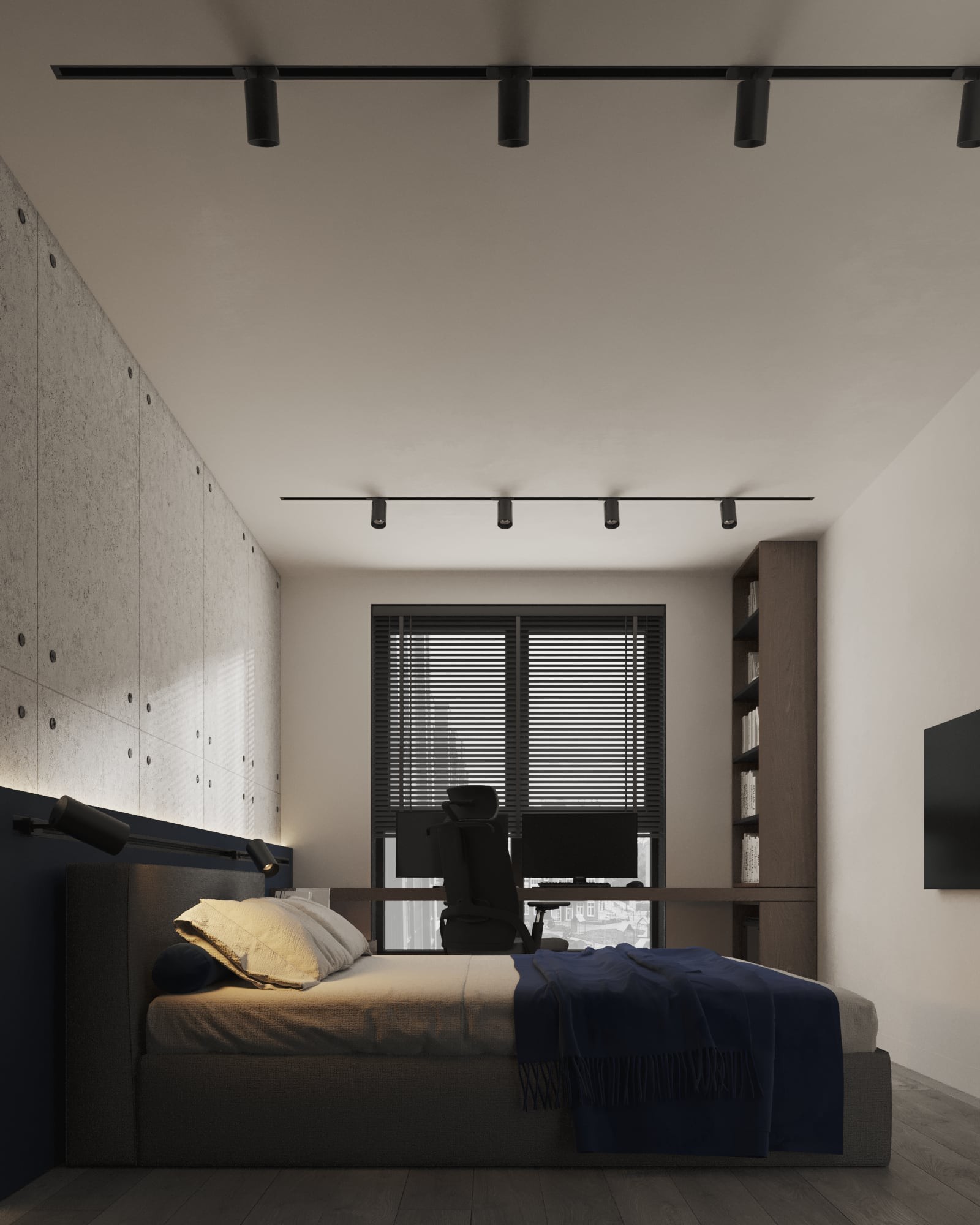 В спальне интересно обыграно изголовье кровати - это панель МДФ с врезным магнитным треком, куда самостоятельно можно вставлять, менять или добавлять магнитные светильники. Отделка за изголовьем кровати - декоративная штукатурка, имитирующая бетонные плиты, эта же штукатурка используется и в зоне TV в гостиной.