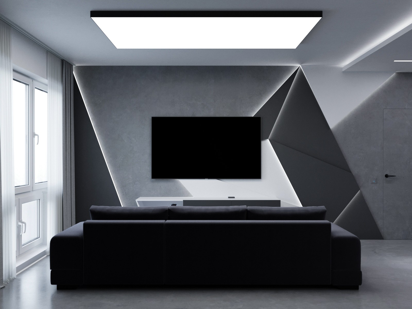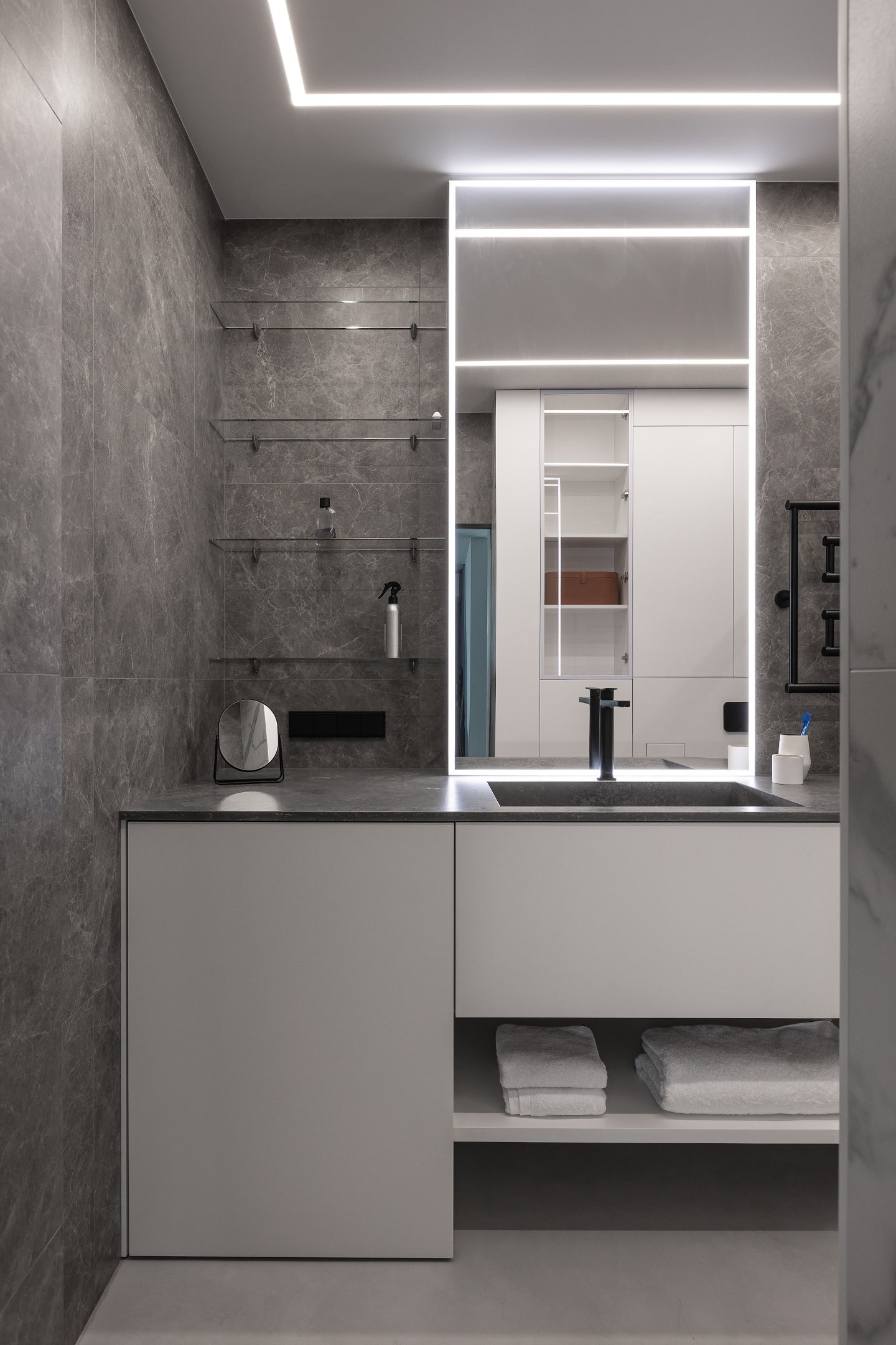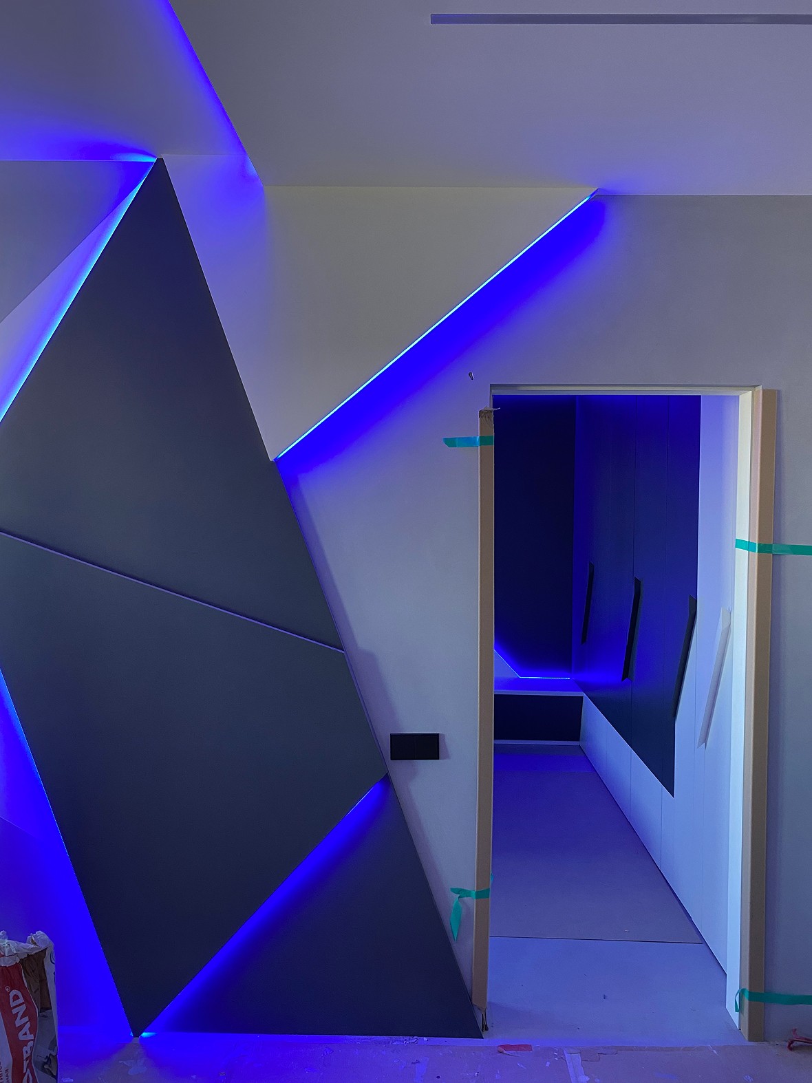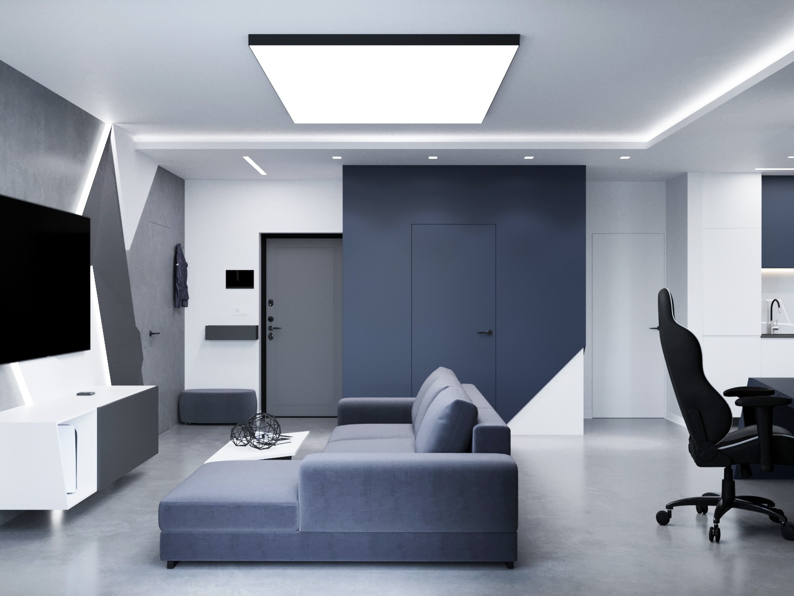 В квартире предусмотрено большое количество подсветок, которые запитаны на «умный дом». В качестве декоративных элементов используются панели с подсветками, которые придают пространству объем.