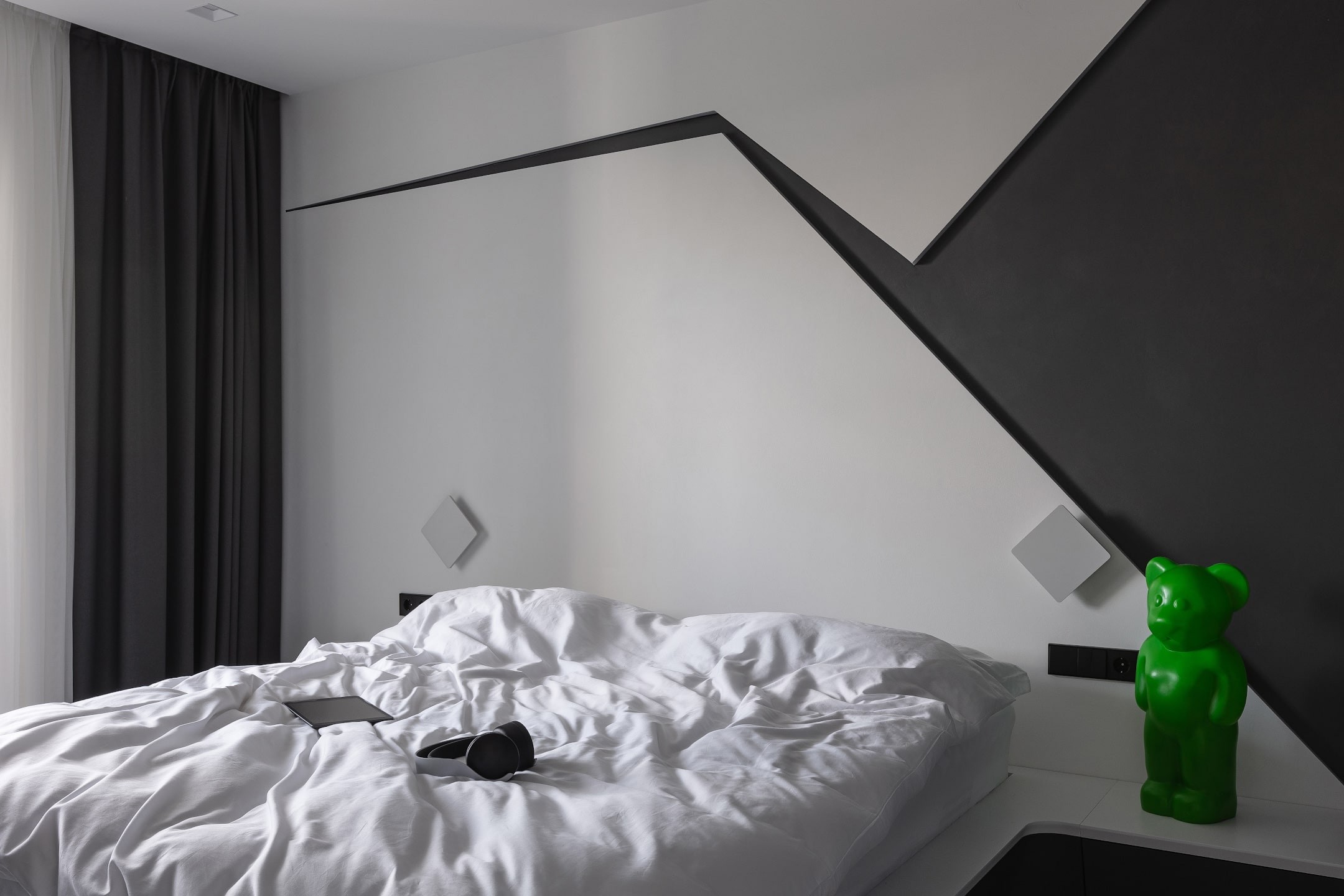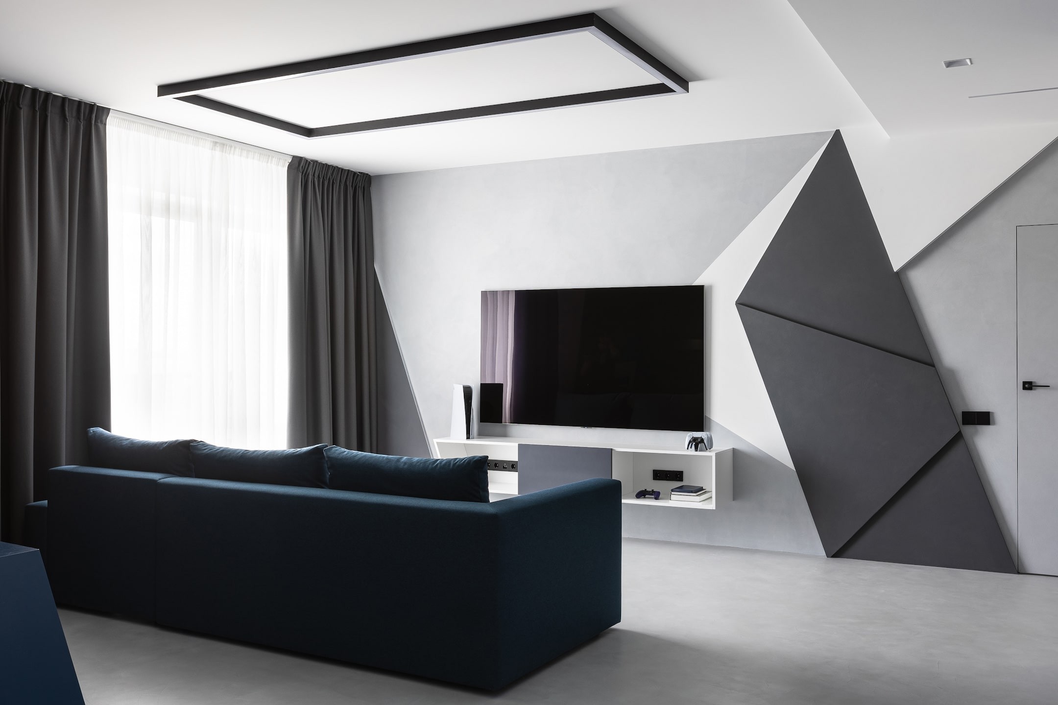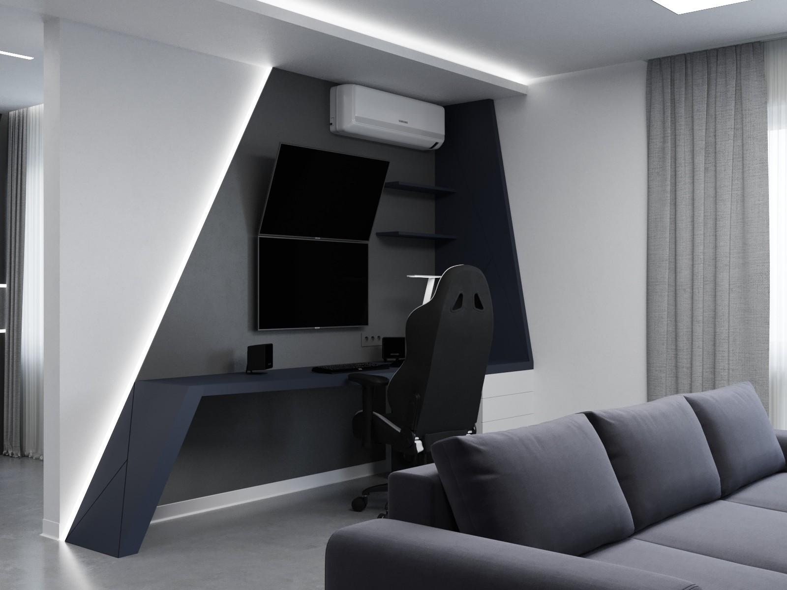 В квартире предусмотрено большое количество подсветок, которые запитаны на «умный дом». В качестве декоративных элементов используются панели с подсветками, которые придают пространству объем.
