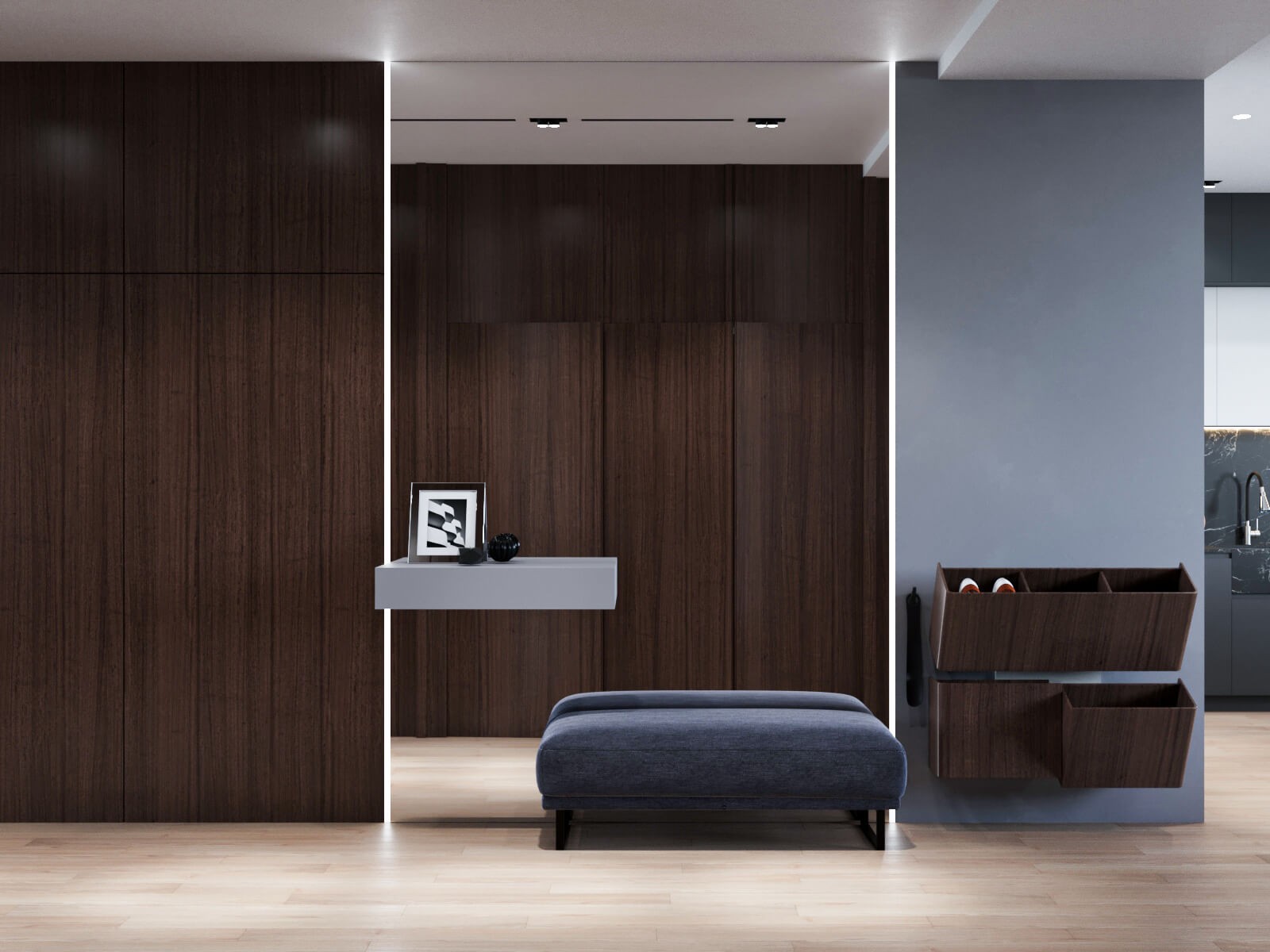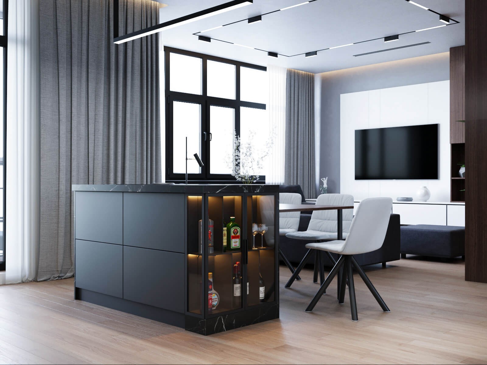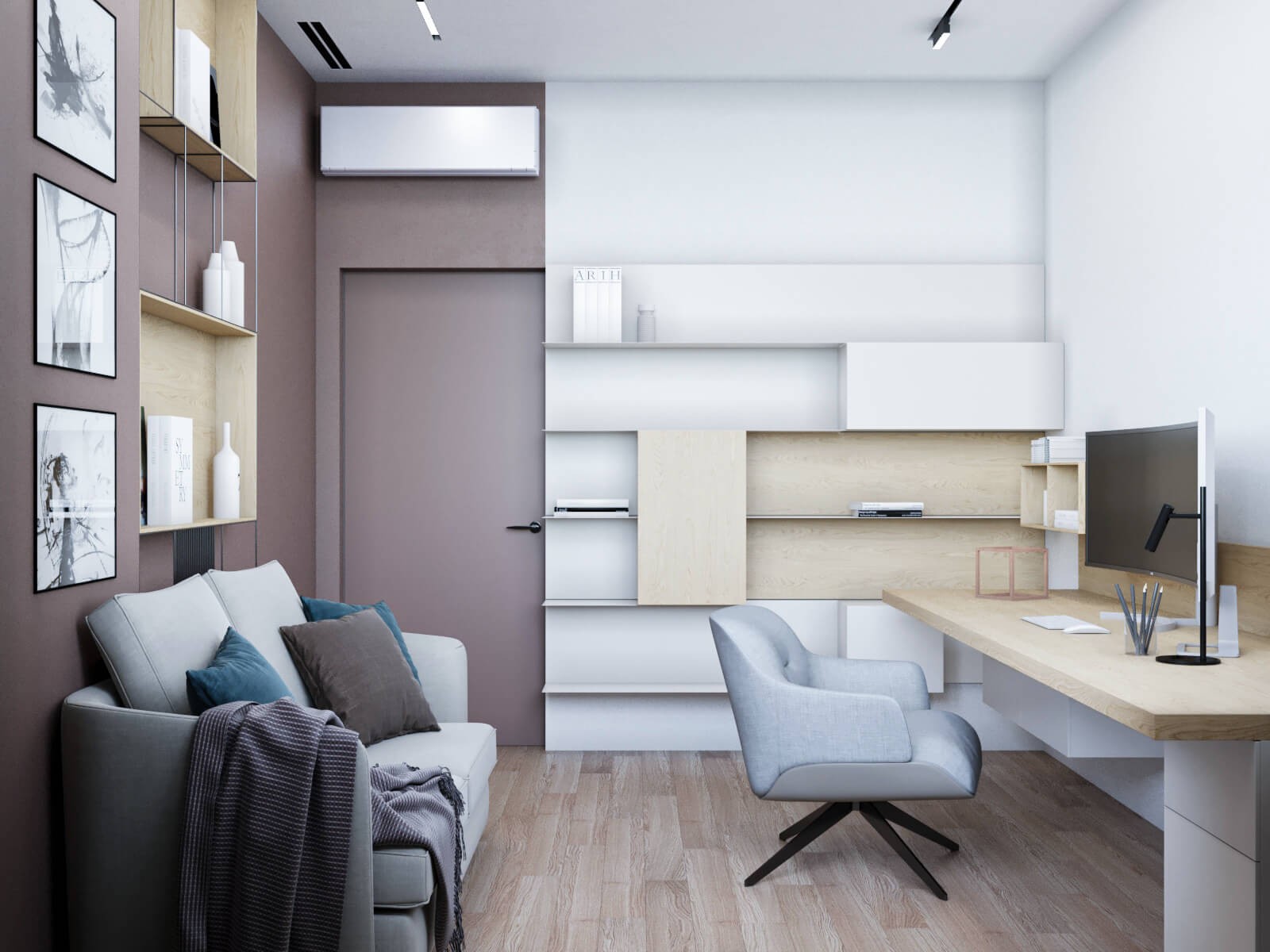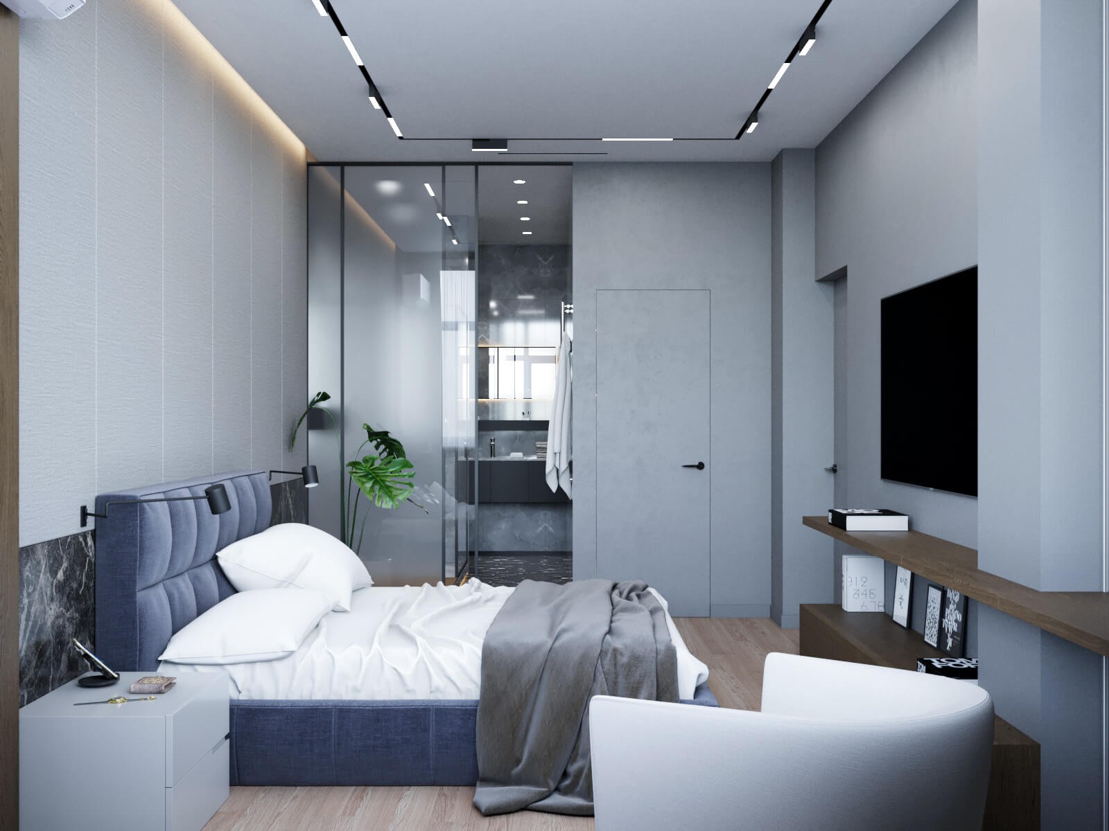 Из квартиры-студии площадью 122м² в результате перепланировки удалось сделать функциональное пространство со всем необходимым: просторная кухня-гостиная с кухонным островом для готовки; спальня с личным санузлом и гардеробной комнатой; рабочий изолированный кабинет; гостевой санузел; комната отдыха и большая кладовая. В квартире перенесена входная дверь, что позволило выиграть пространство под кладовую комнату.
