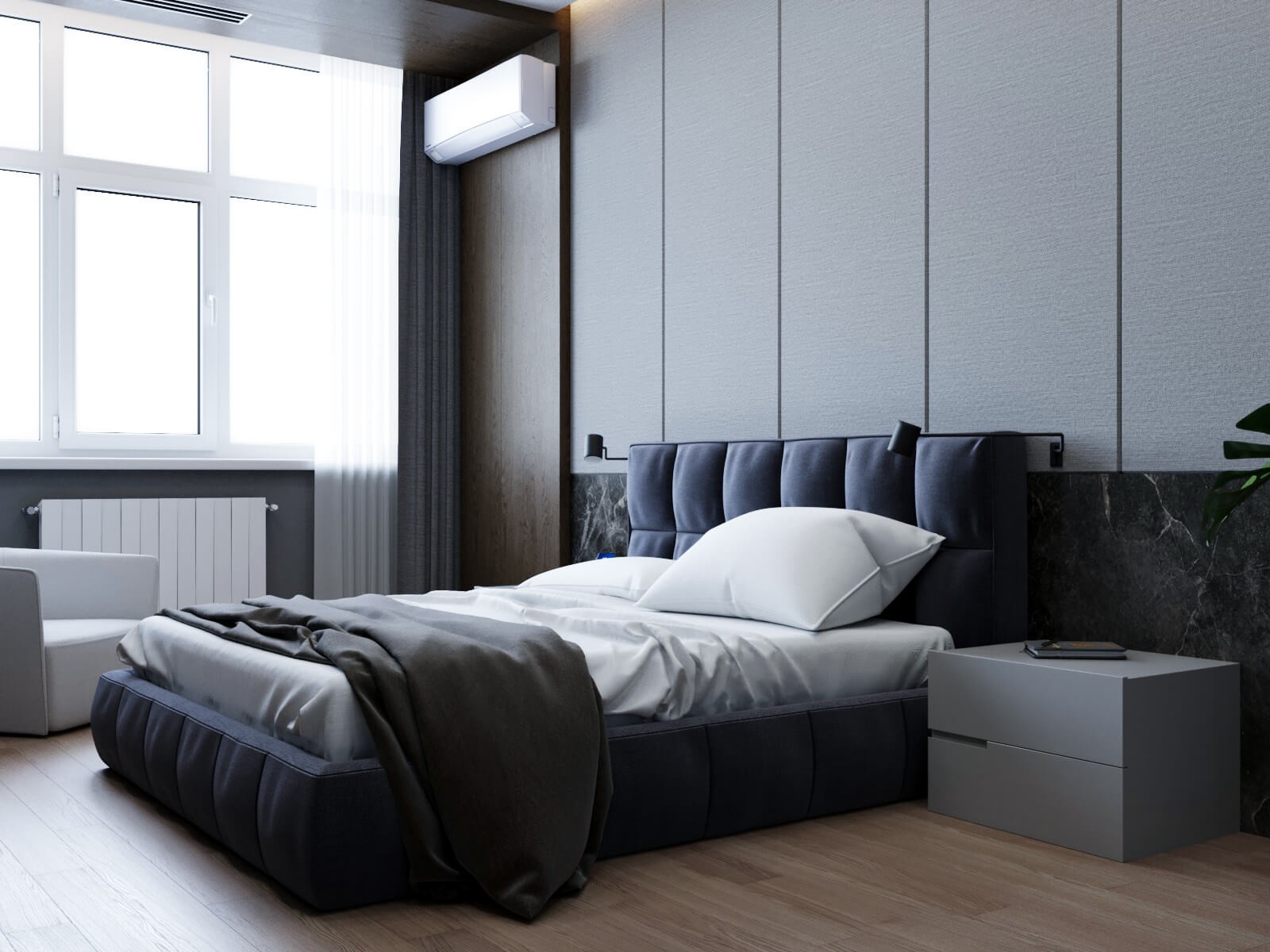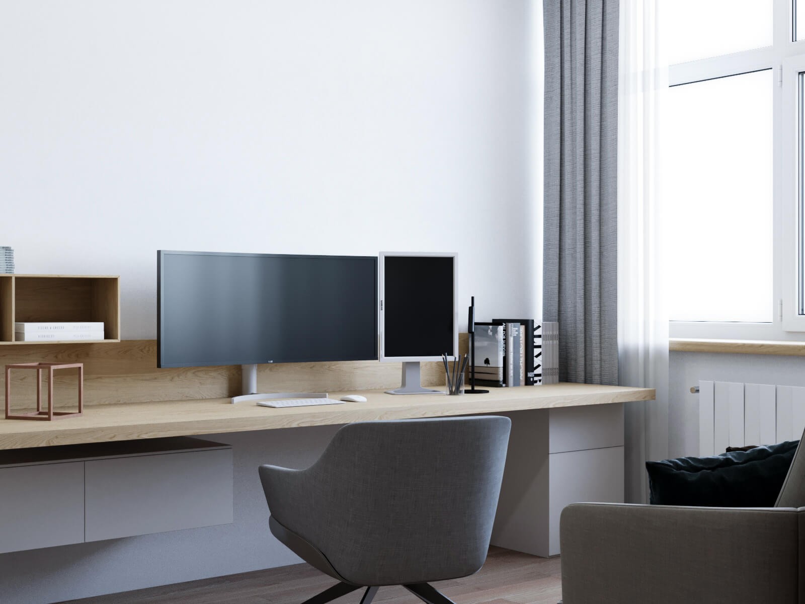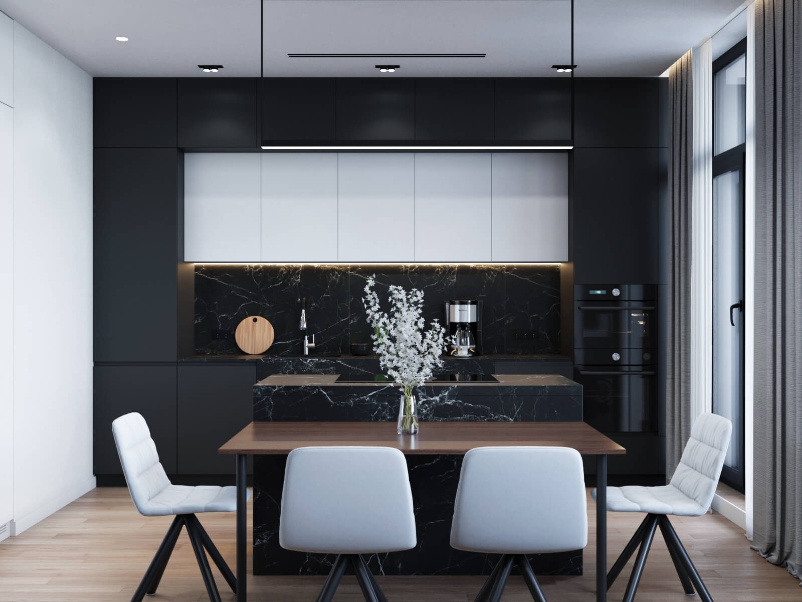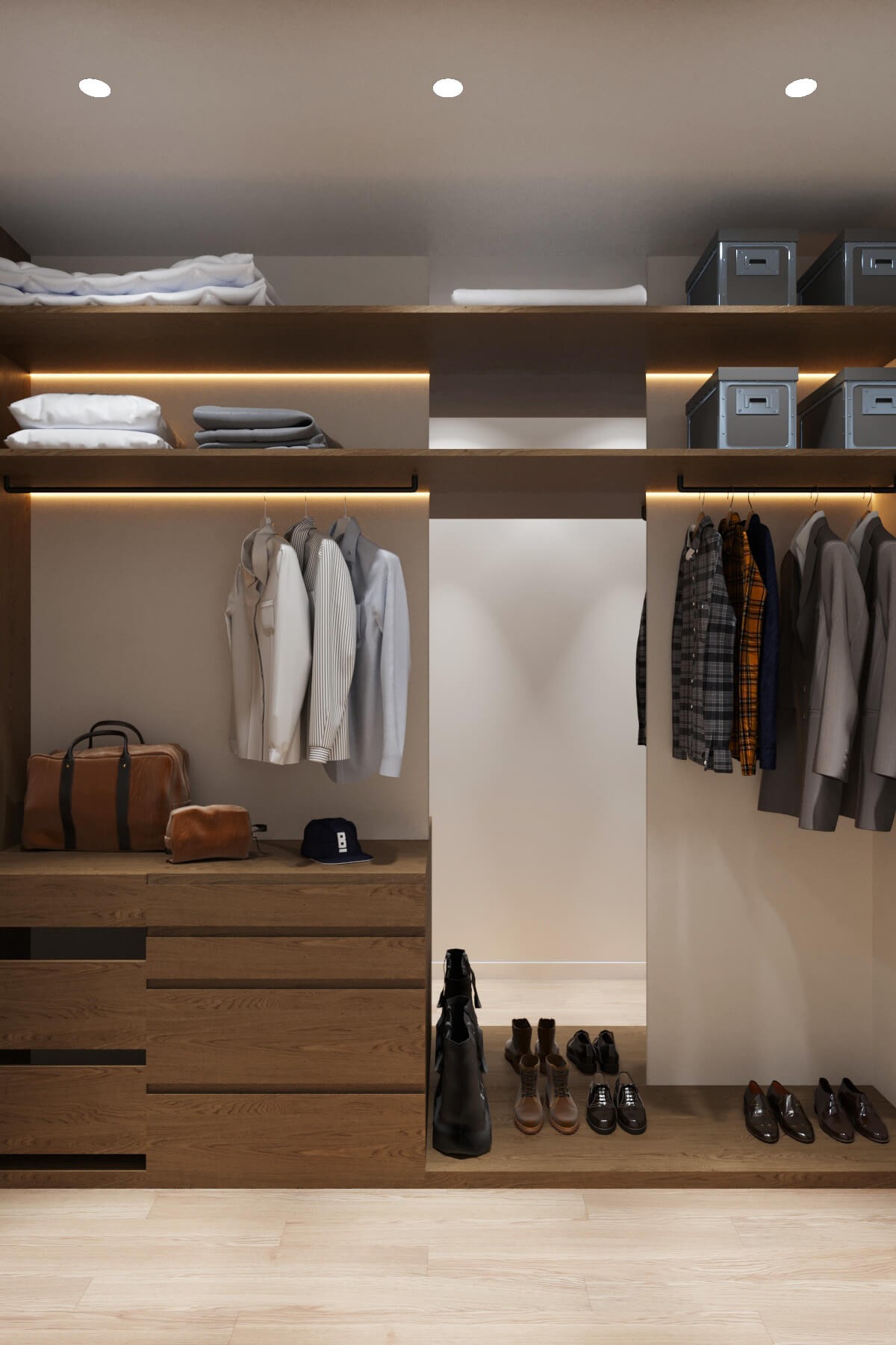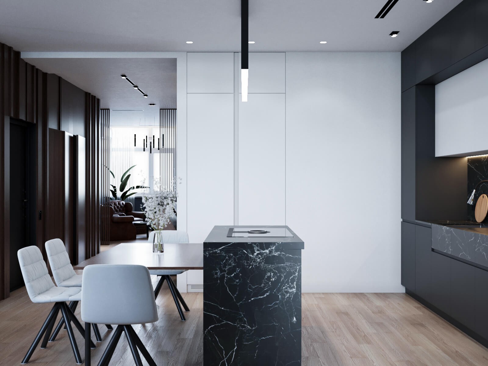 Из квартиры-студии площадью 122м² в результате перепланировки удалось сделать функциональное пространство со всем необходимым: просторная кухня-гостиная с кухонным островом для готовки; спальня с личным санузлом и гардеробной комнатой; рабочий изолированный кабинет; гостевой санузел; комната отдыха и большая кладовая. В квартире перенесена входная дверь, что позволило выиграть пространство под кладовую комнату.