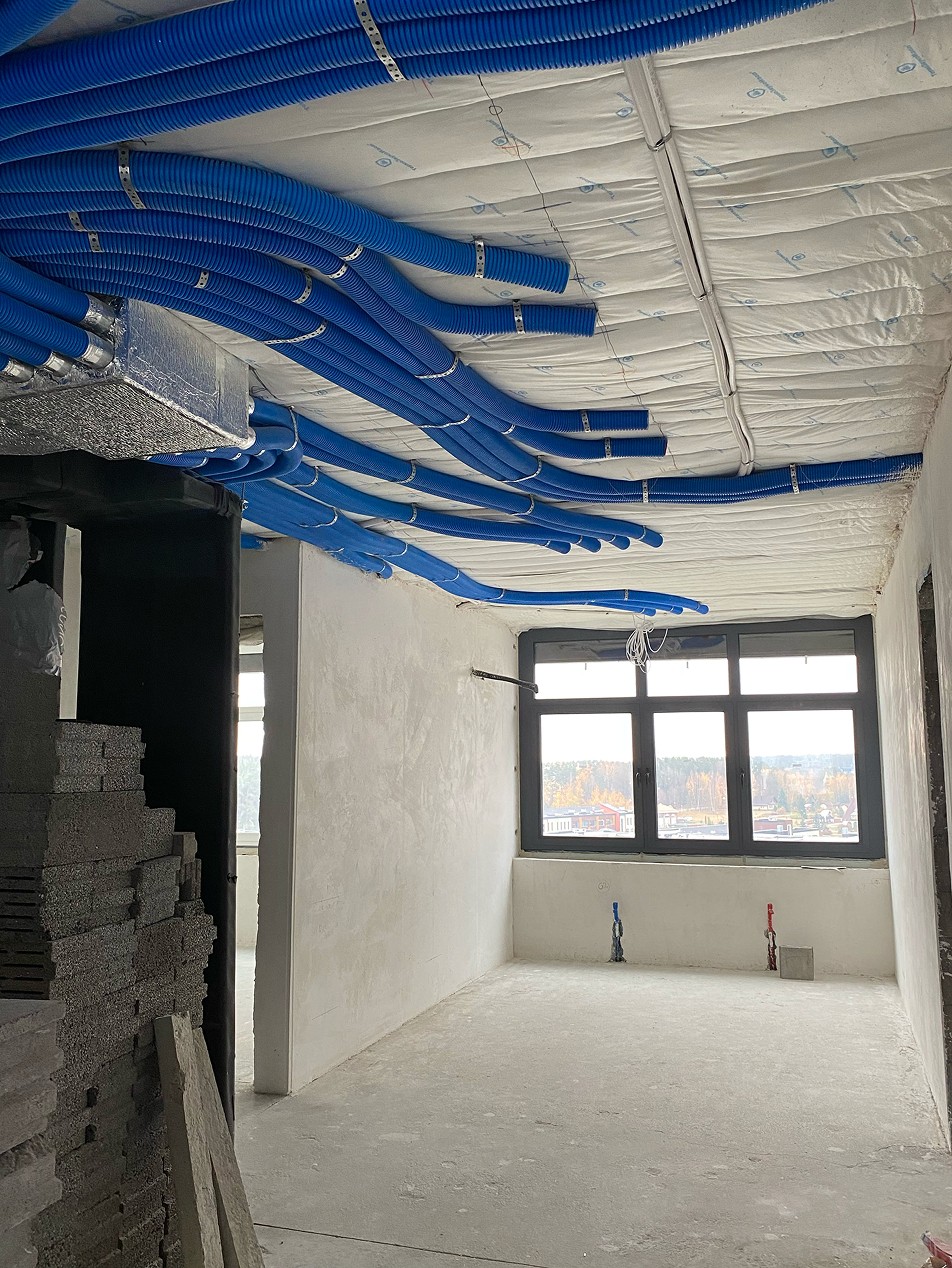 Квартира находится на последнем этаже, поэтому предусмотрена теплоизоляция потолка, а также система приточно-вытяжной вентиляции. Предусмотрена также шумоизоляция стен/пола и потолка.