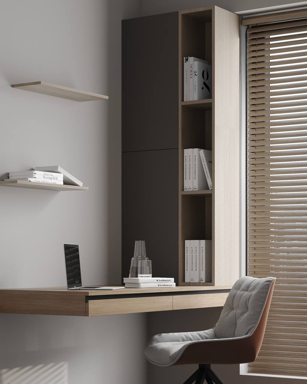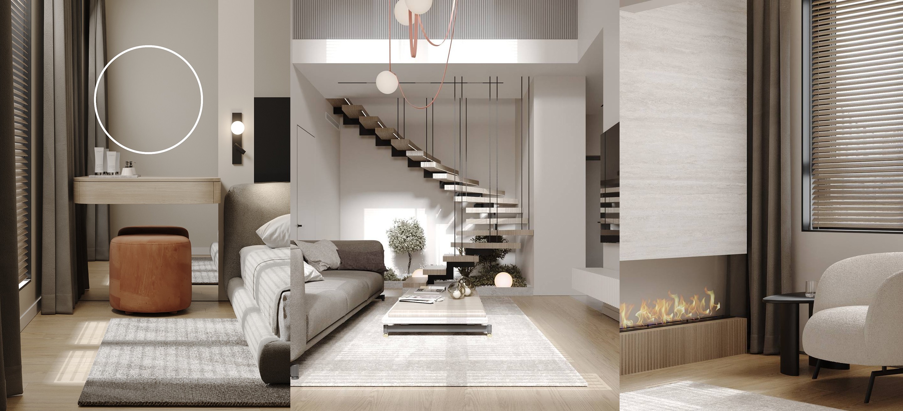 При проектировании двухуровневых квартир всегда стоит задача сохранить максимальный объем воздуха и света. Квартира располагается в ЖК «Зеленая Гавань» с потрясающими видами на лесной массив, поэтому было решено интегрировать природную среду в квартиру, было решено использование только натуральных материалов - шпон дерева, камень, керамика, стекло.