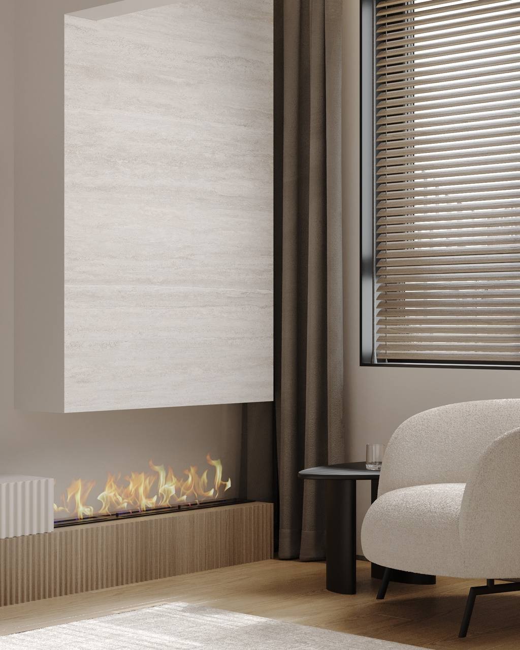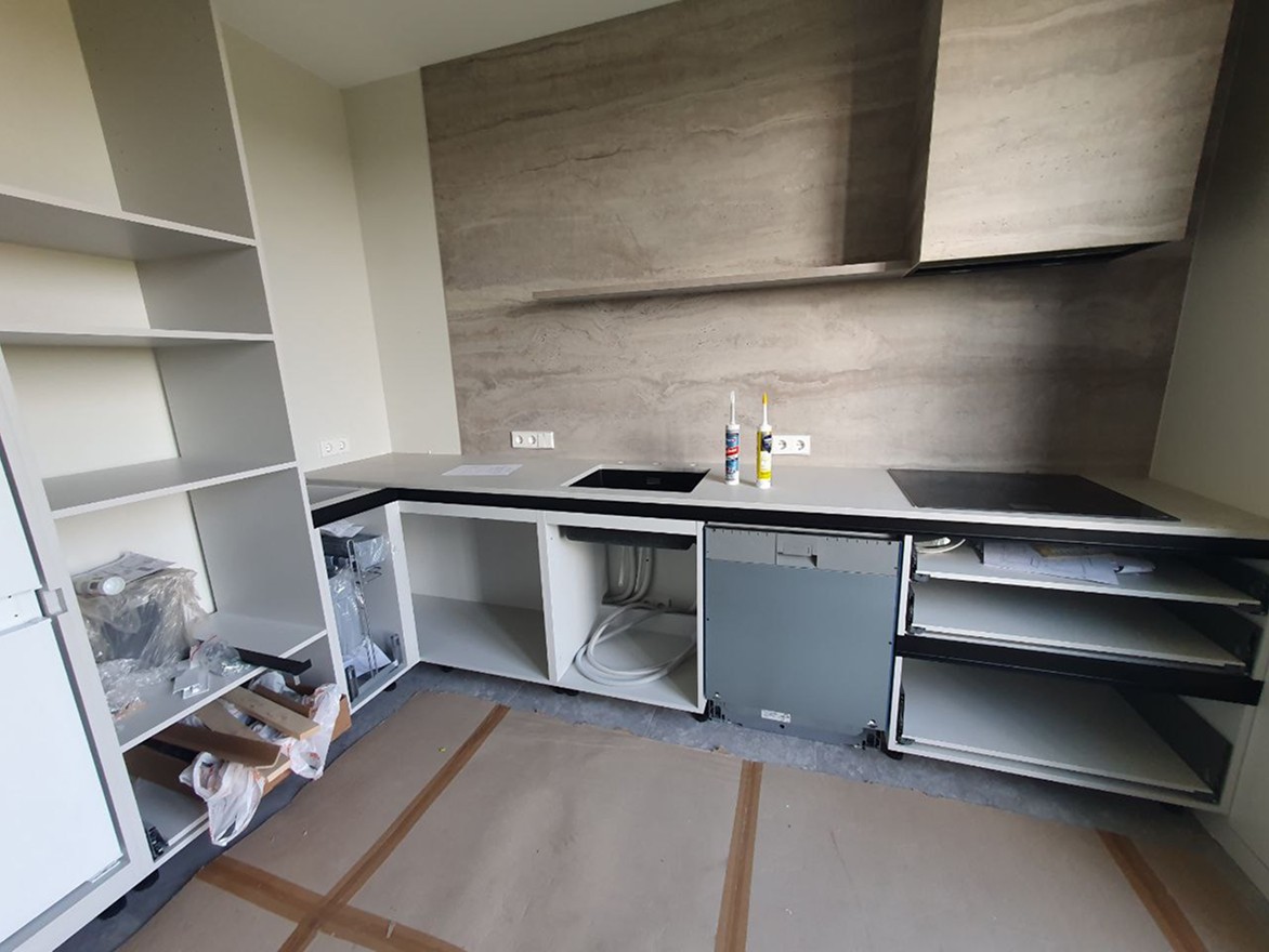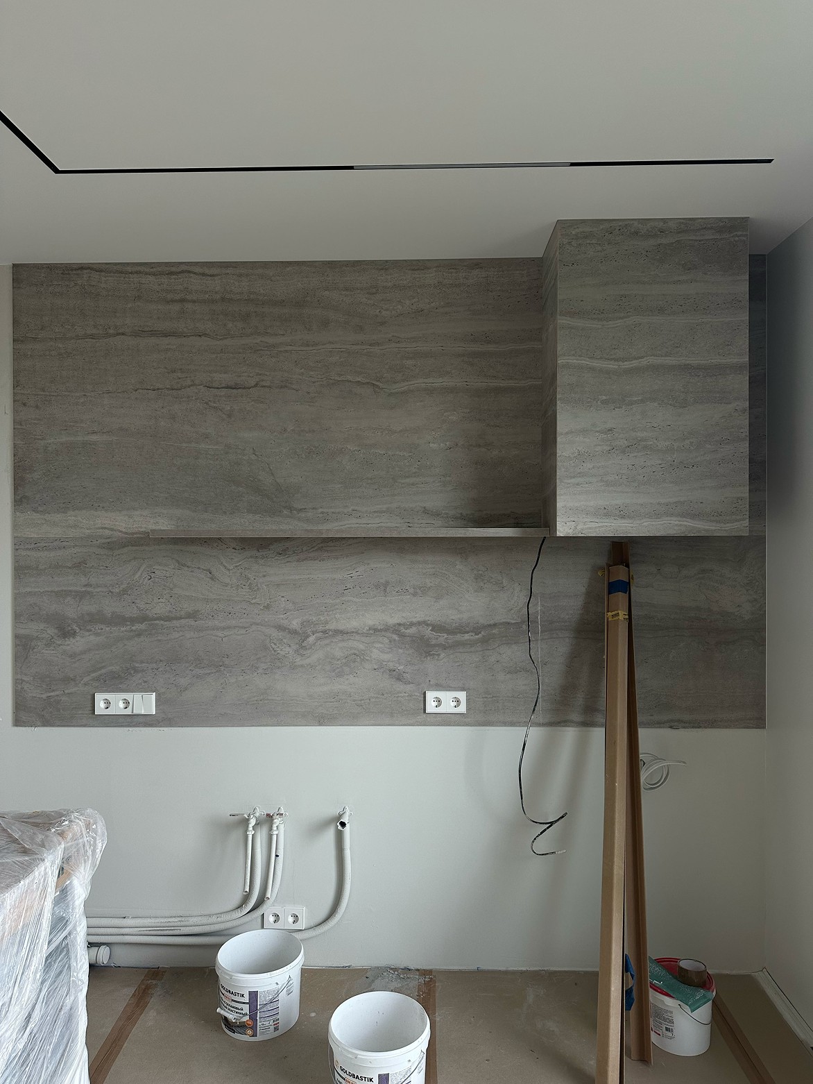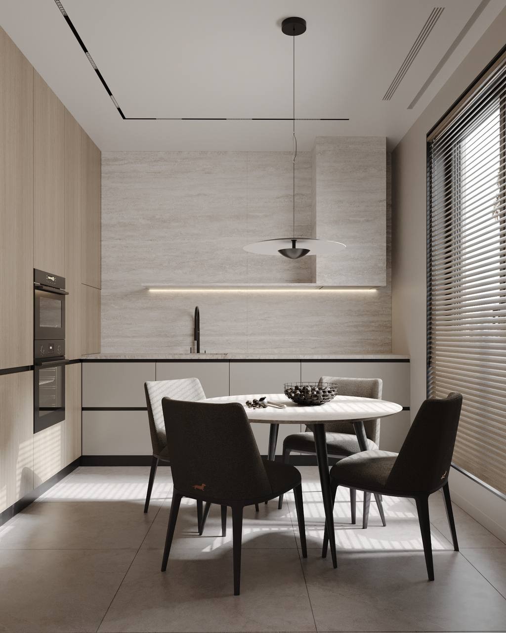 В зоне кухни заказчица сразу поставила условие: никаких верхних шкафчиков, но максимально использовать пространство кухни для хранения и функционала. На фартуке, выполненном из широкоформатного керамогранита располагается вытяжка, которая также облицована керамогранитом.