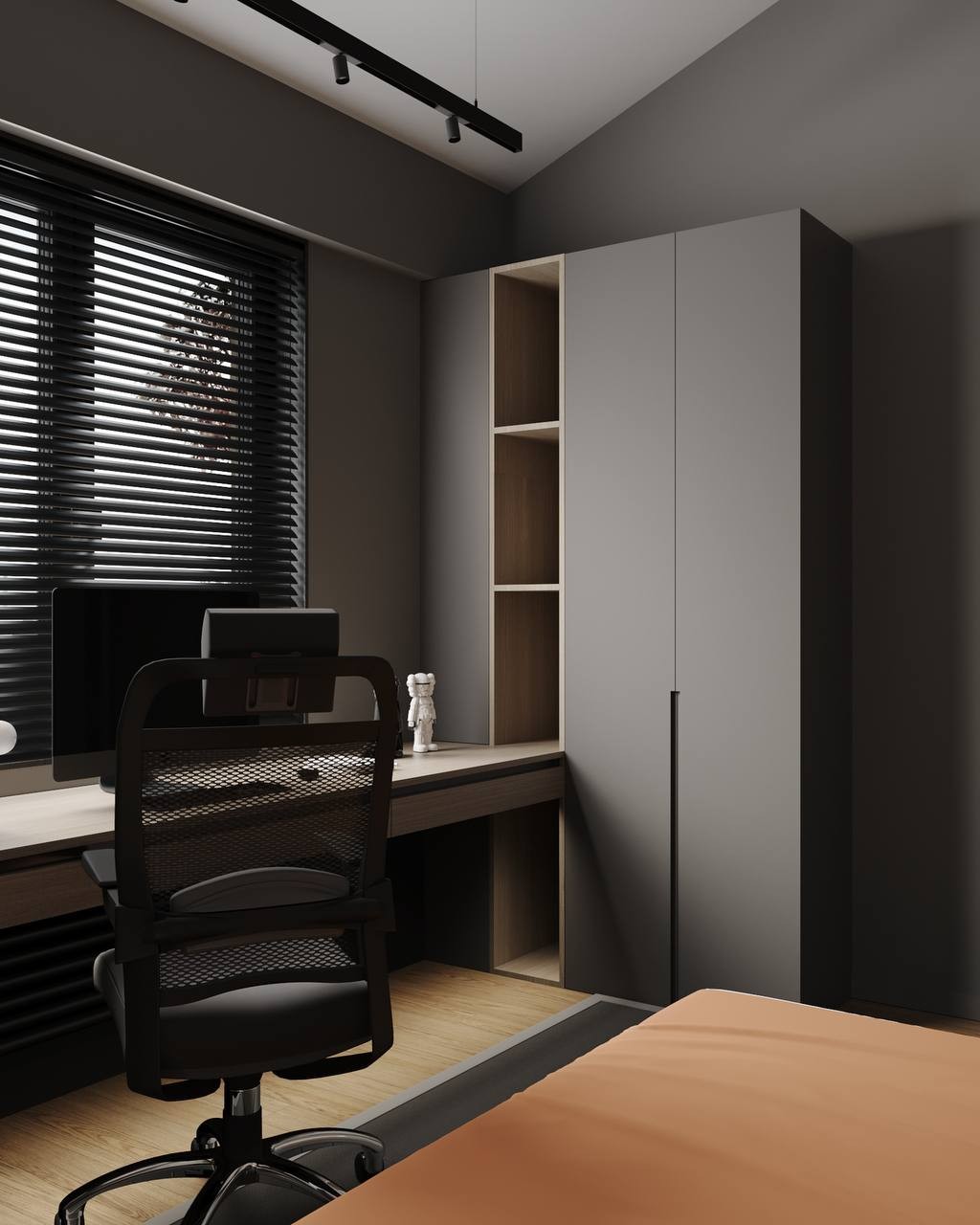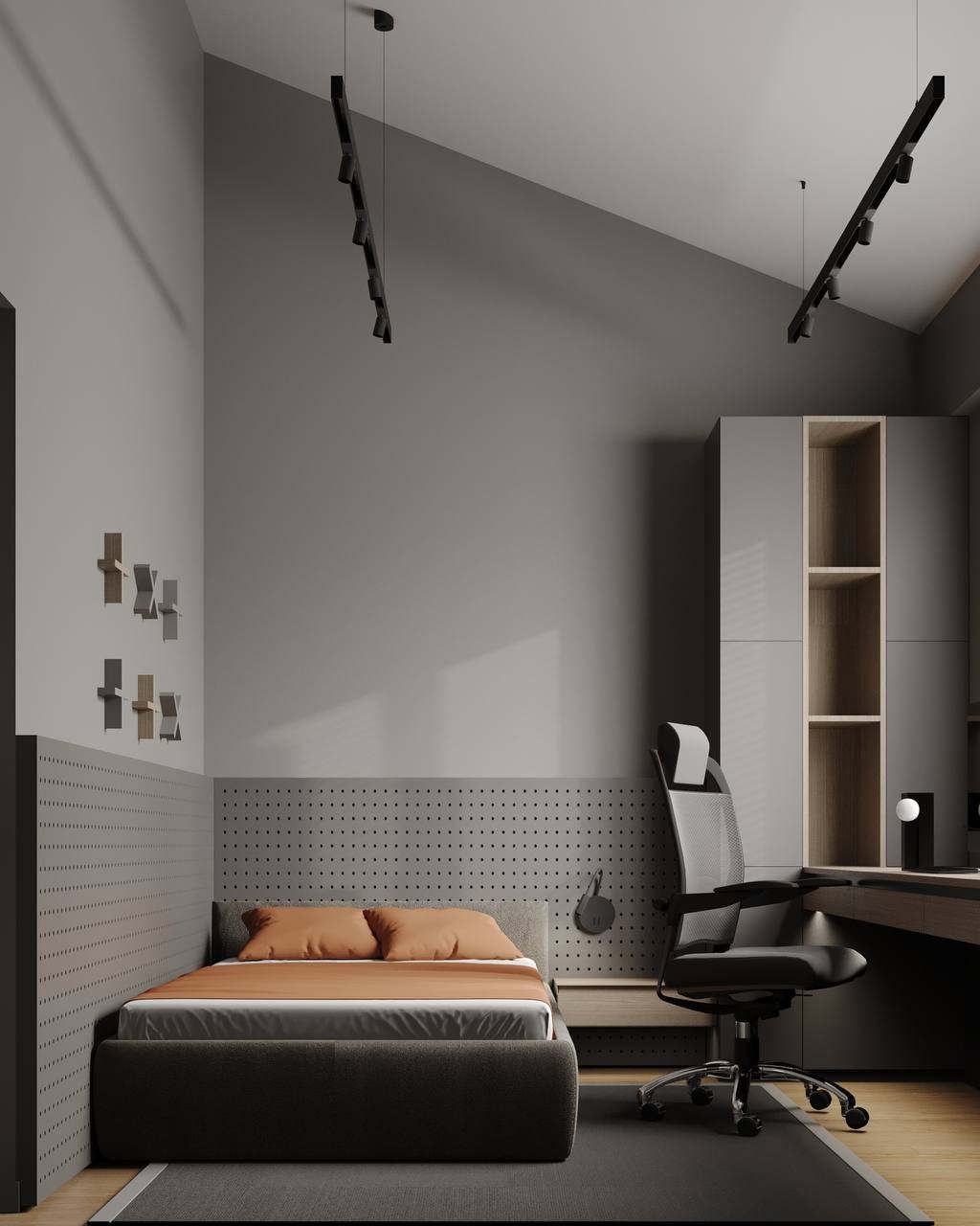 Детская комната для подростка выполнена в максимально темных тонах и отличается от всей квартиры, но подросток четко обозначил свои границы и проектирование комнаты было полностью с ним согласовано.