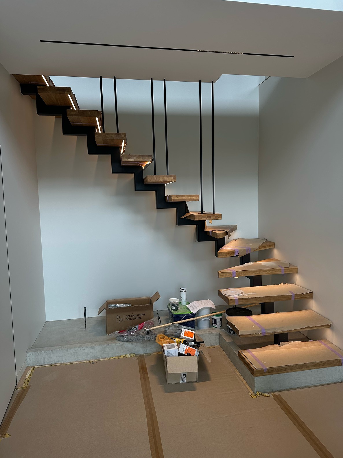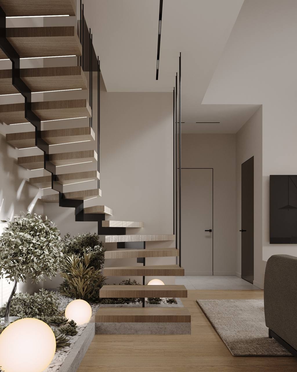 Особенностью интерьера конечно же является лестница, было решено выполнить ее максимально парящей, но безопасной, под лестницей организован небольшой сад со стабилизированными растениями.
