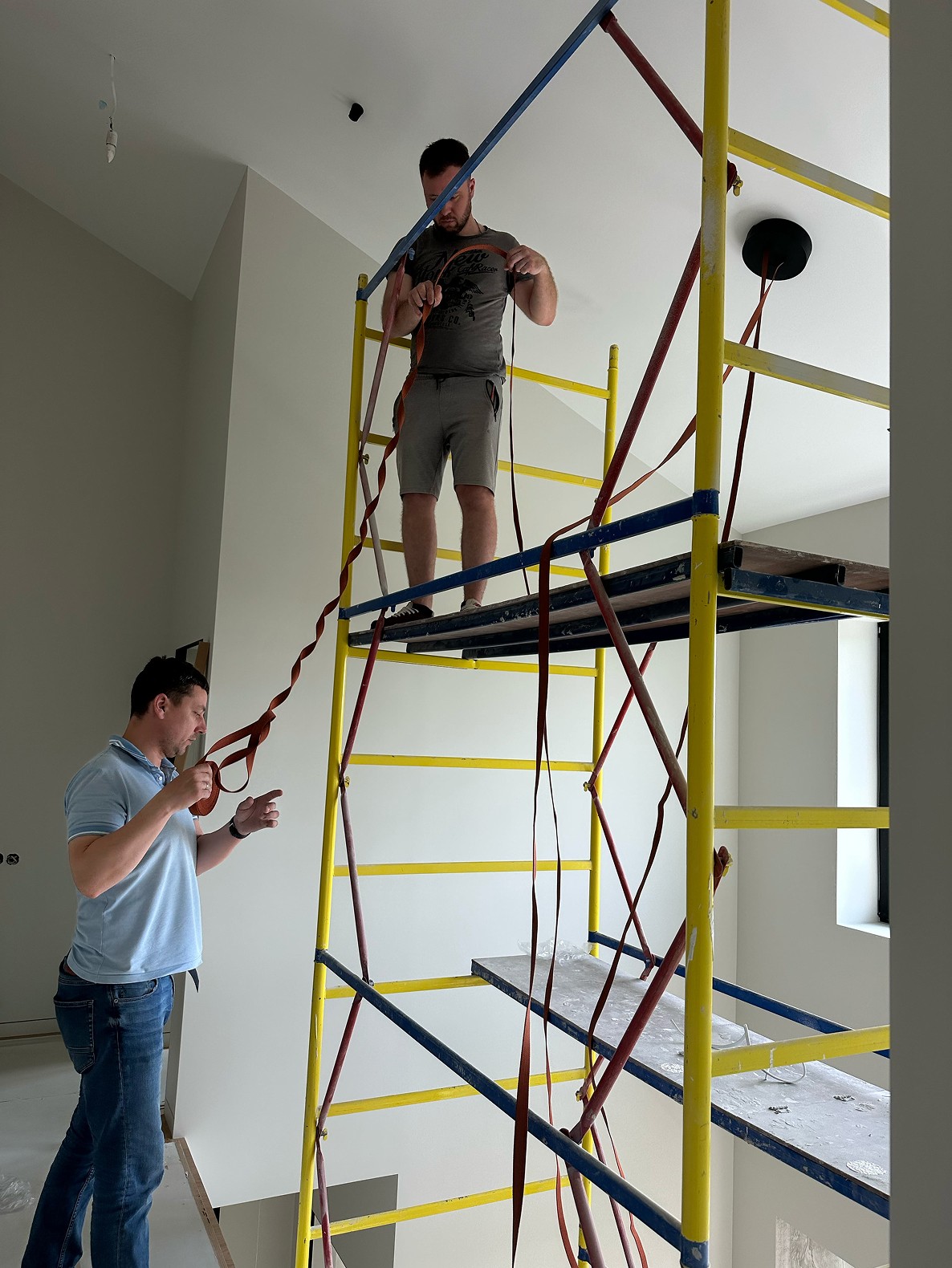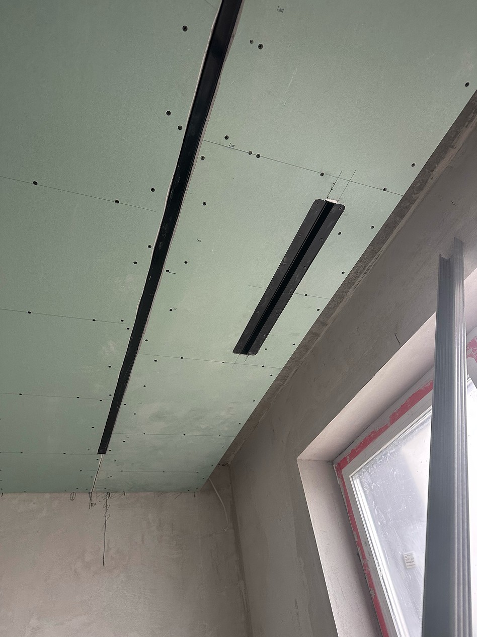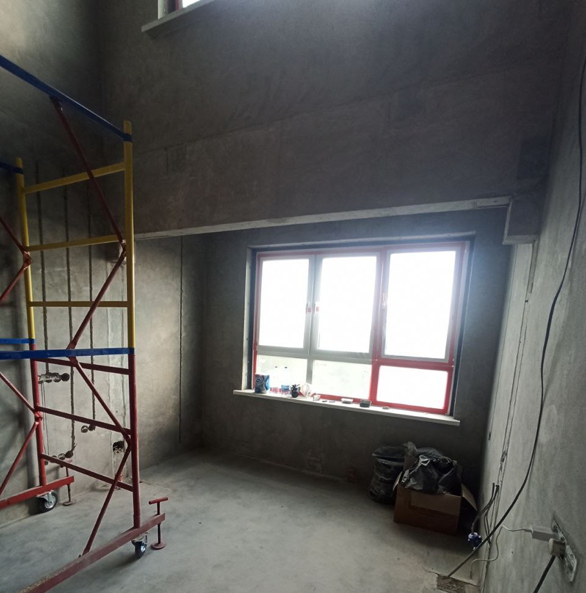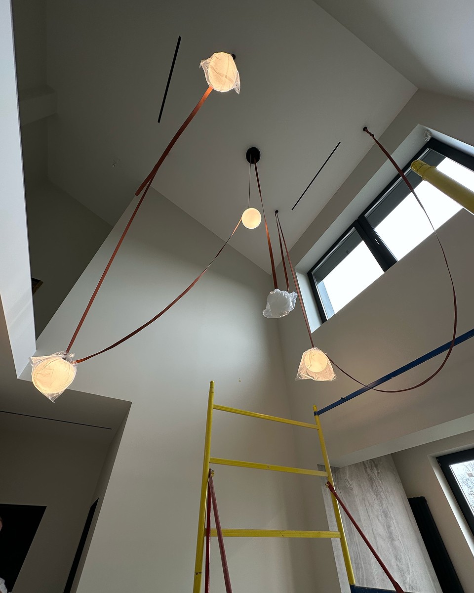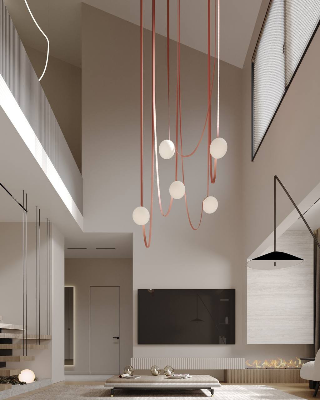 В гостиной высота потолка достигает в высшей точке 8,3 метра, заказчики очень переживали за освещение этого пространства, потому что никогда не сталкивались с такой высотой помещения, поэтому было решено использовать множество подсветок, декоративного освещения, а в центре разместить современную люстру на подвесных магнитных ремнях.