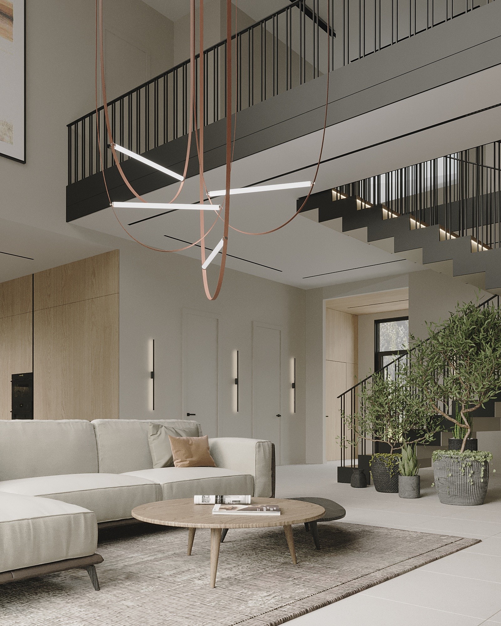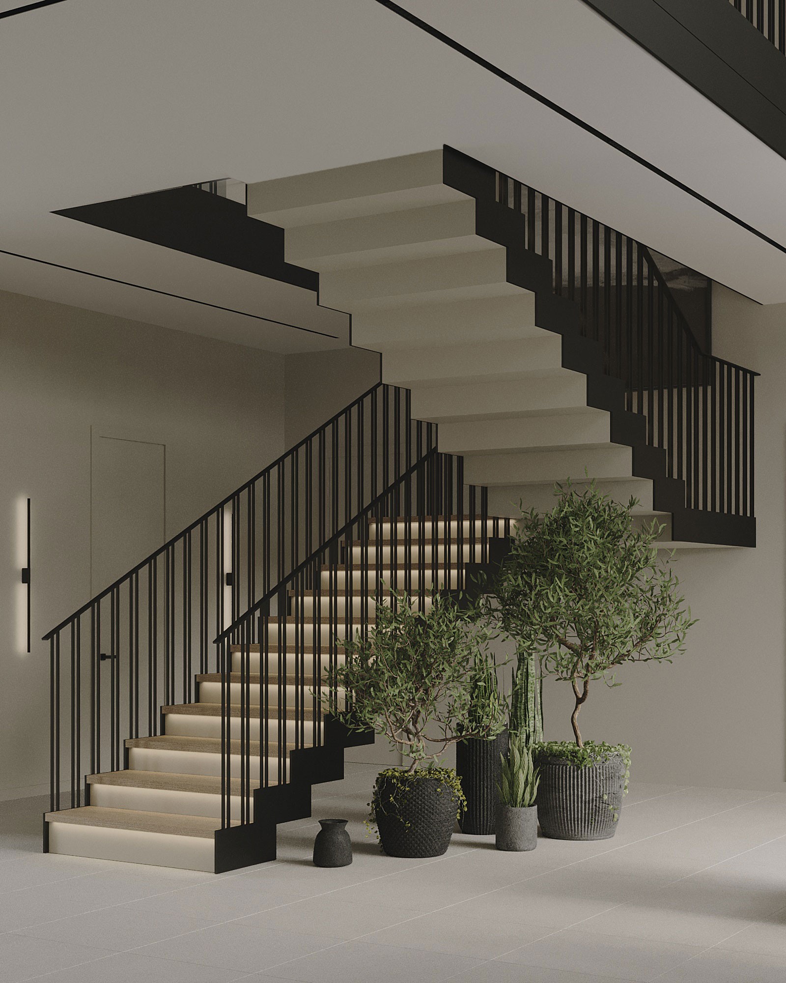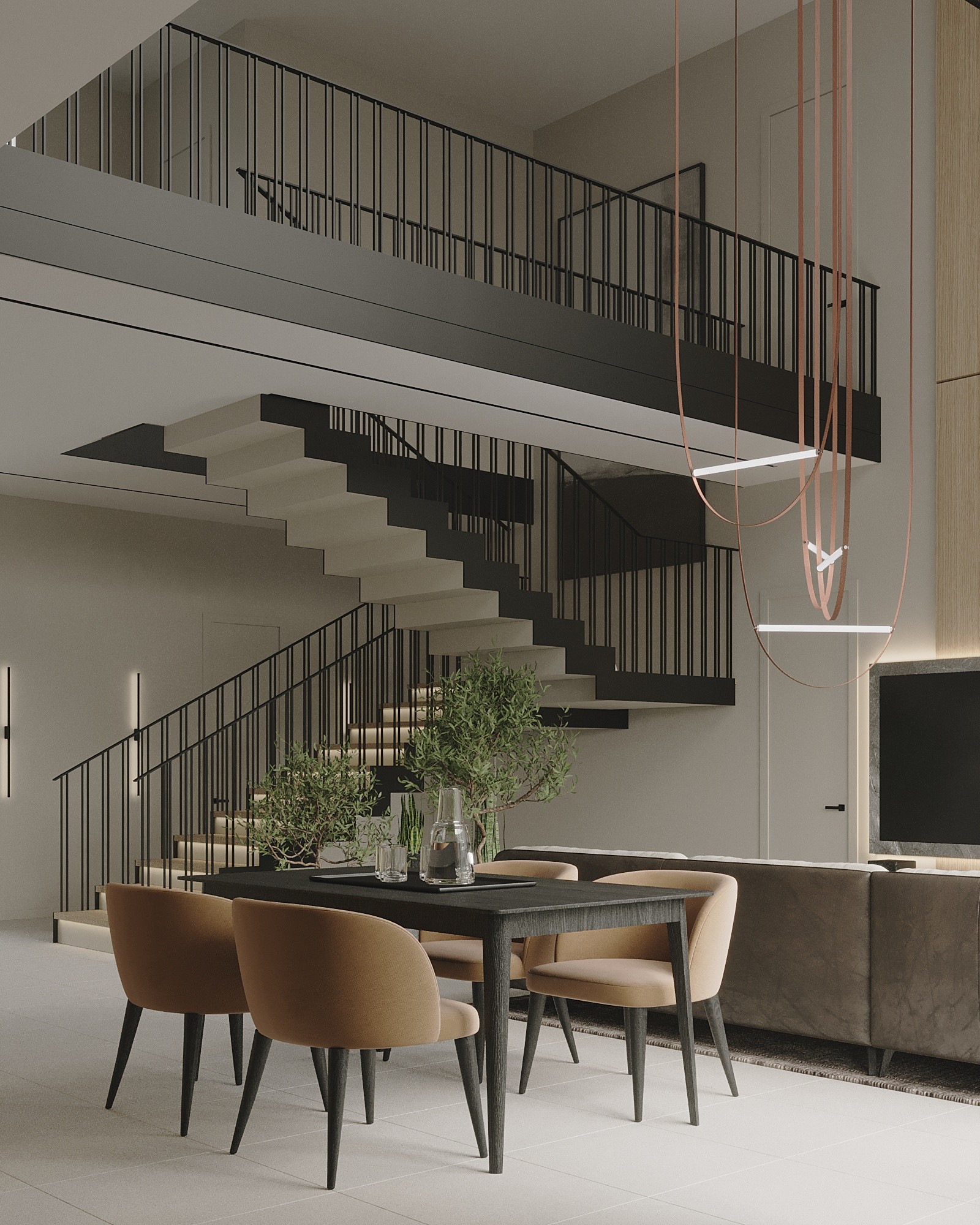 Так как лестница просматривается с видовых точек гостиной и кухни, было решено выполнить ступени в зеркальной технике, обшить их натуральным деревом и крашенным черным МДФ с торца, перила выполнены из металла, так как от стекла отказались из-за меньшей практичности для семьи с двумя детьми.