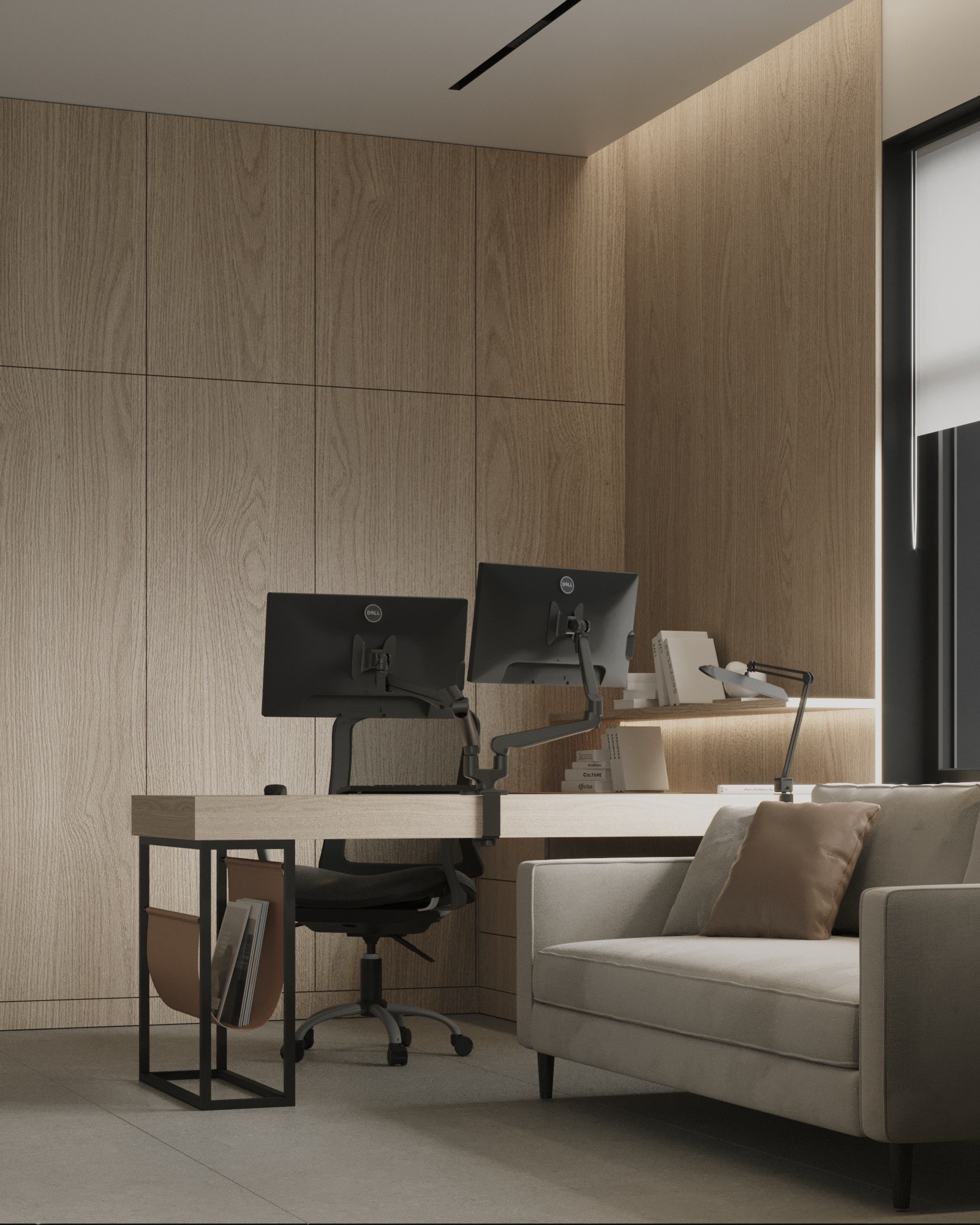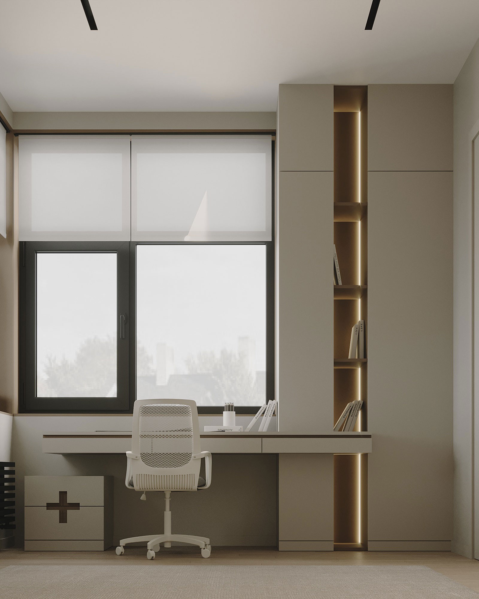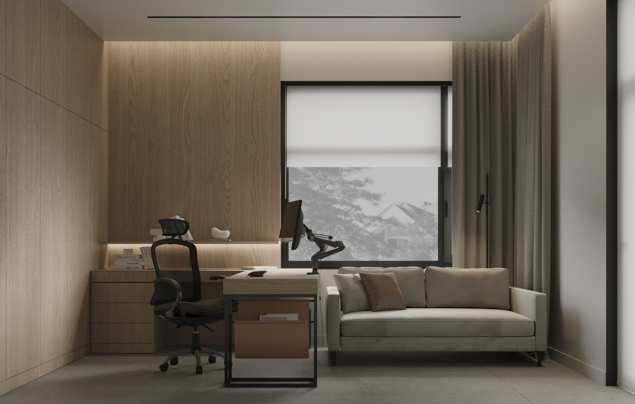 На первом этаже дома располагается кабинет хозяина, со всей необходимой атрибутикой для работы, а также гостевая комната с модульной кроватью.