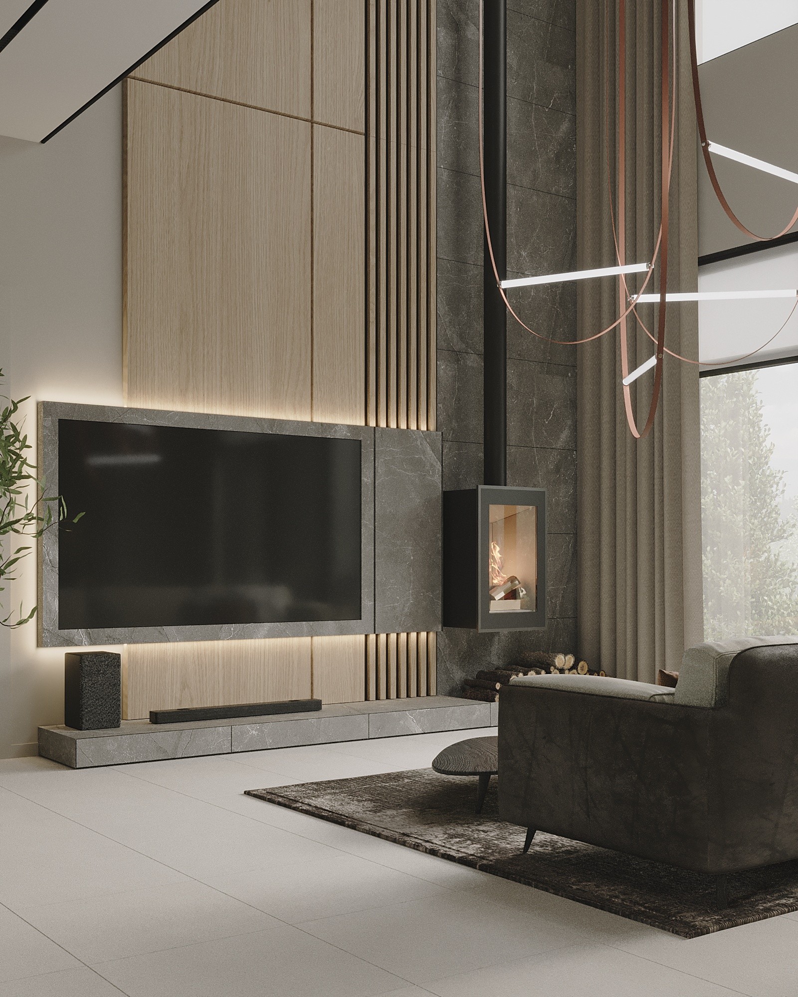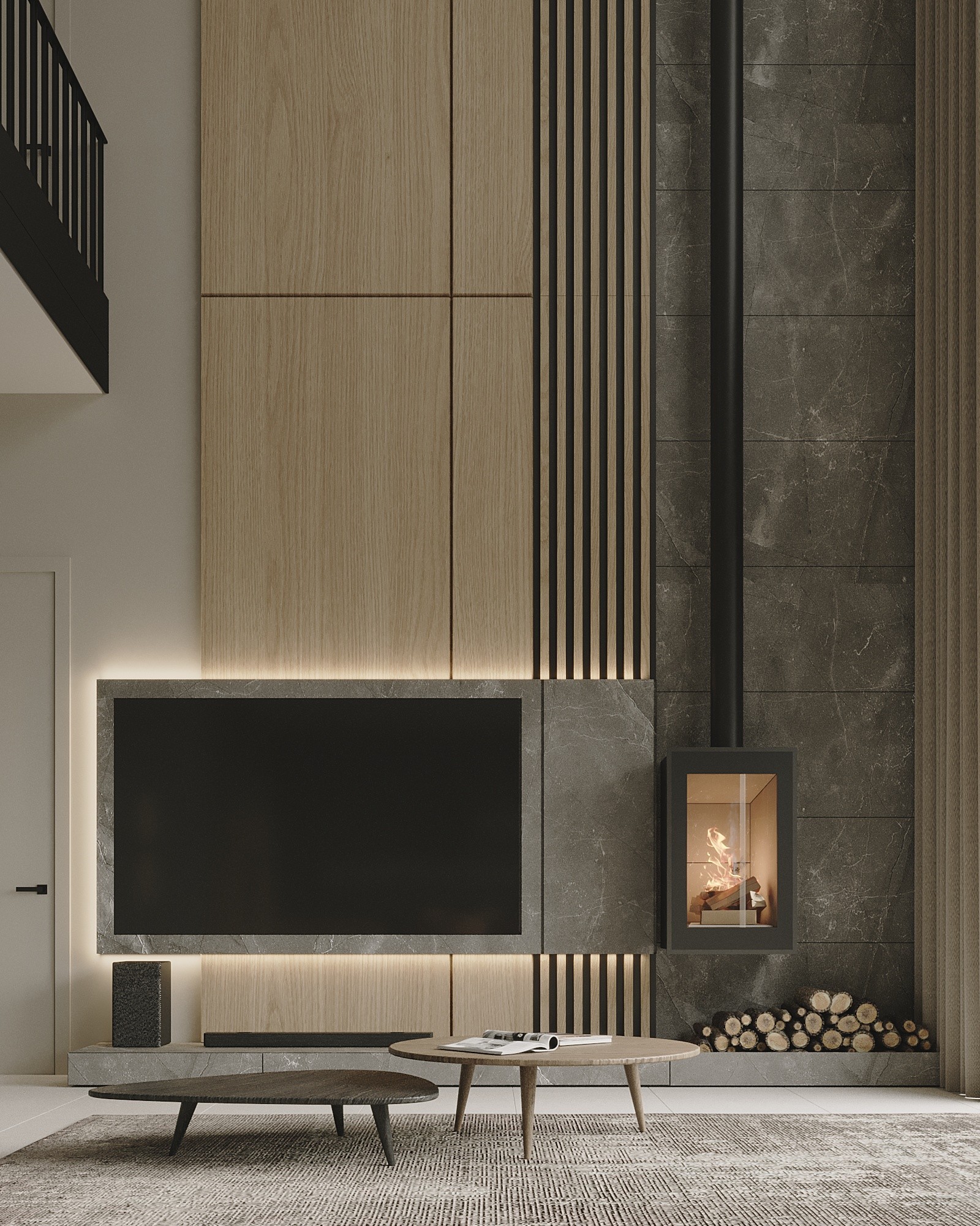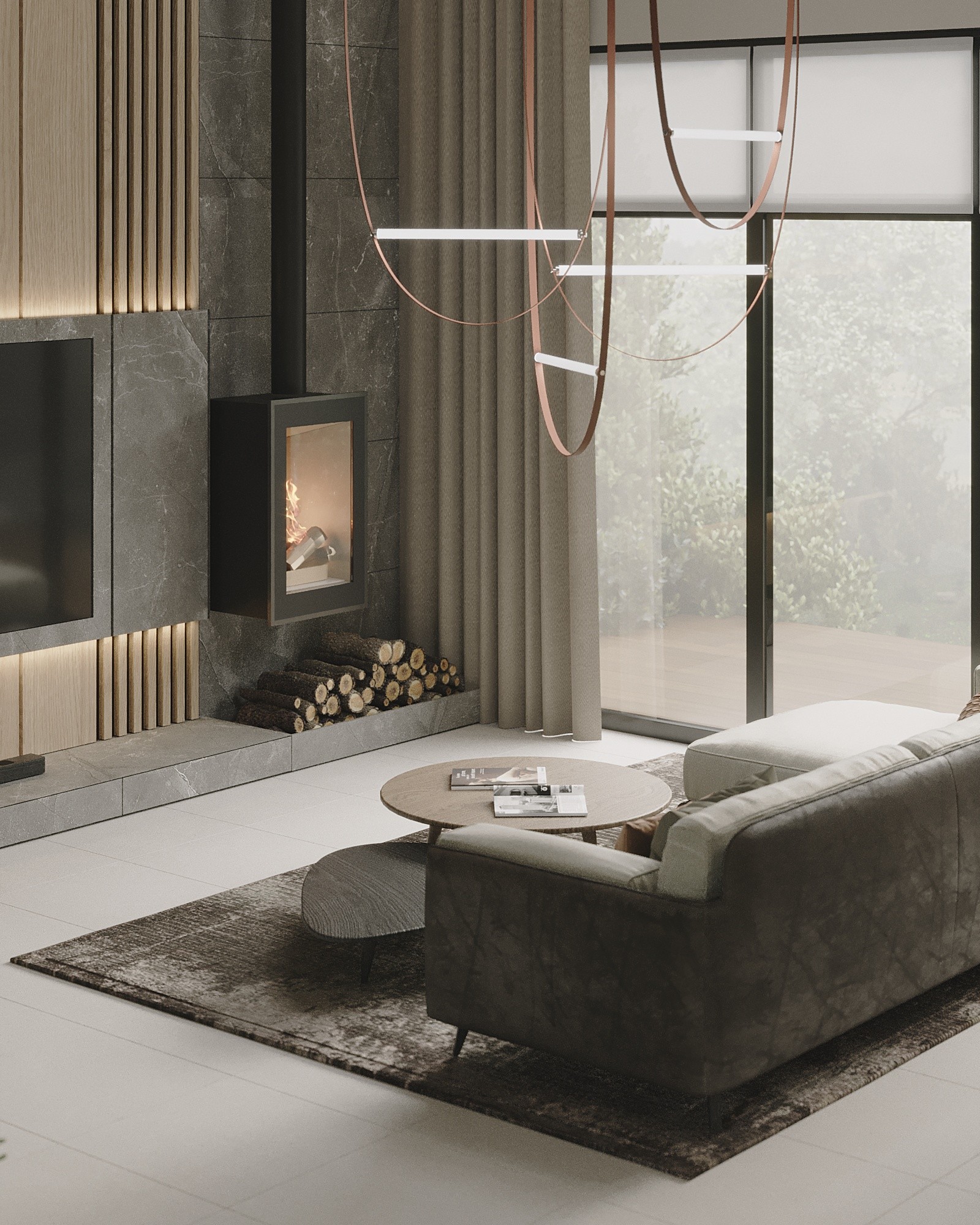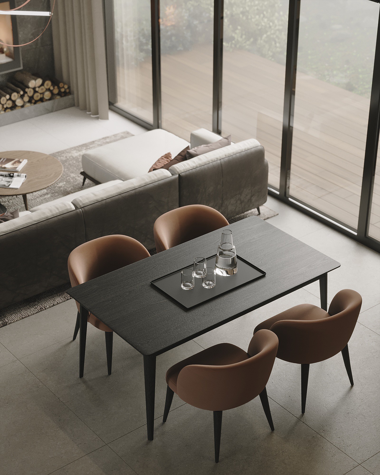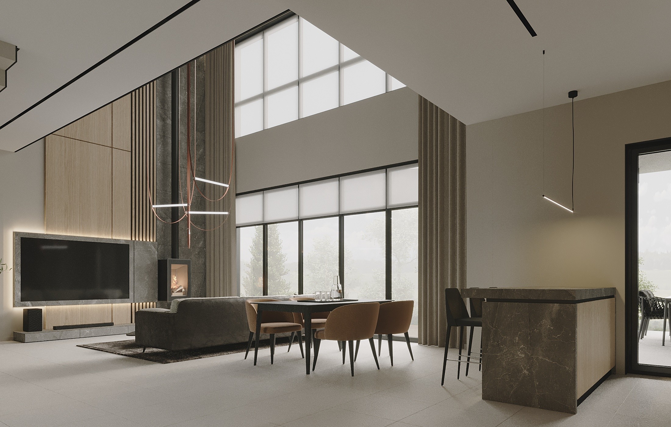 Центром первого этажа является гостиная зона с огромным панорамным окном, которое создает визуальную связь между внутренним пространством дома и экстерьером. Акцентом гостиной является настоящий камин на дровах, который придает дому дополнительный уют и комфорт. В гостиной расположился большой угловой диван для компании, а также столовая зона с обеденным столом с возможностью раскладки до 12 человек.
