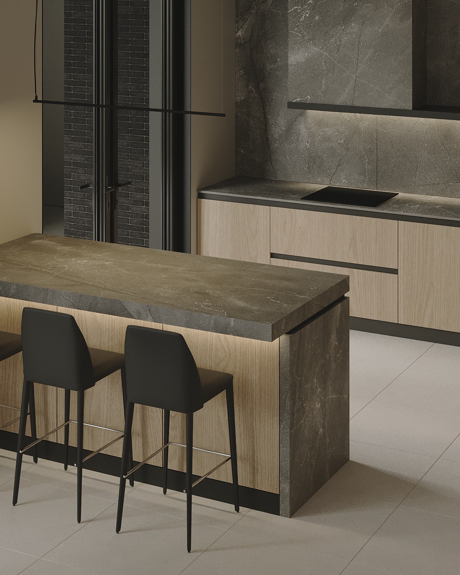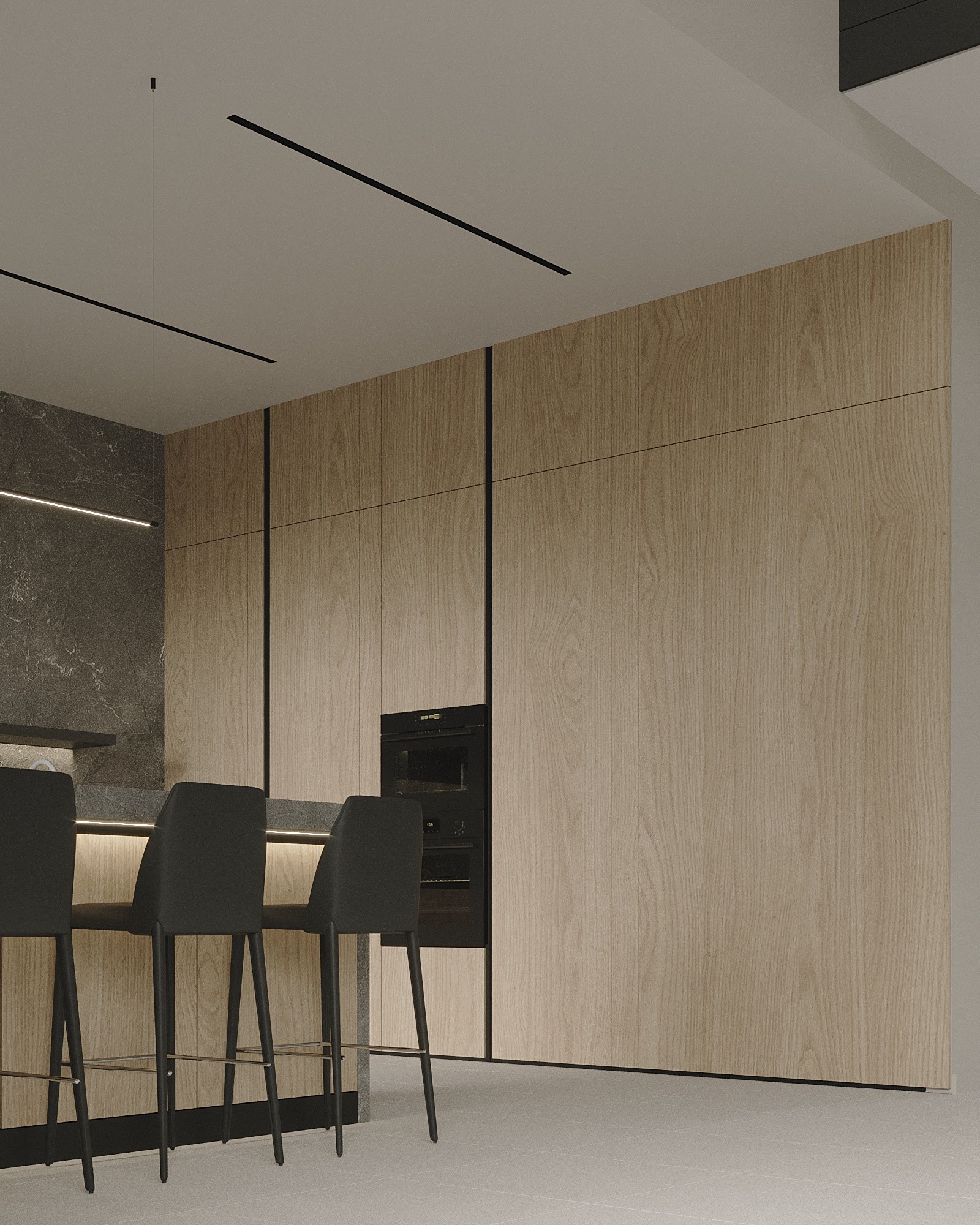 Кухня максимально функциональная и удобная, а за потайной дверью-панелью находится кладовая, где можно хранить дополнительные запасы и кухонную утварь. Из кухни можно попасть на террасу возле дома, где находится летняя кухня и зона барбекю.