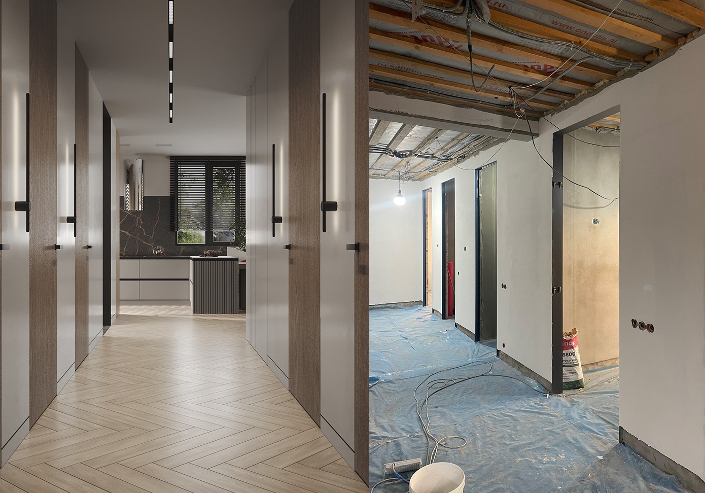 Подготовительные работы, демонтажные и монтажные работы, штукатурные работы, разводка черновой электрики и вентиляции, разводка черновой сантехники.