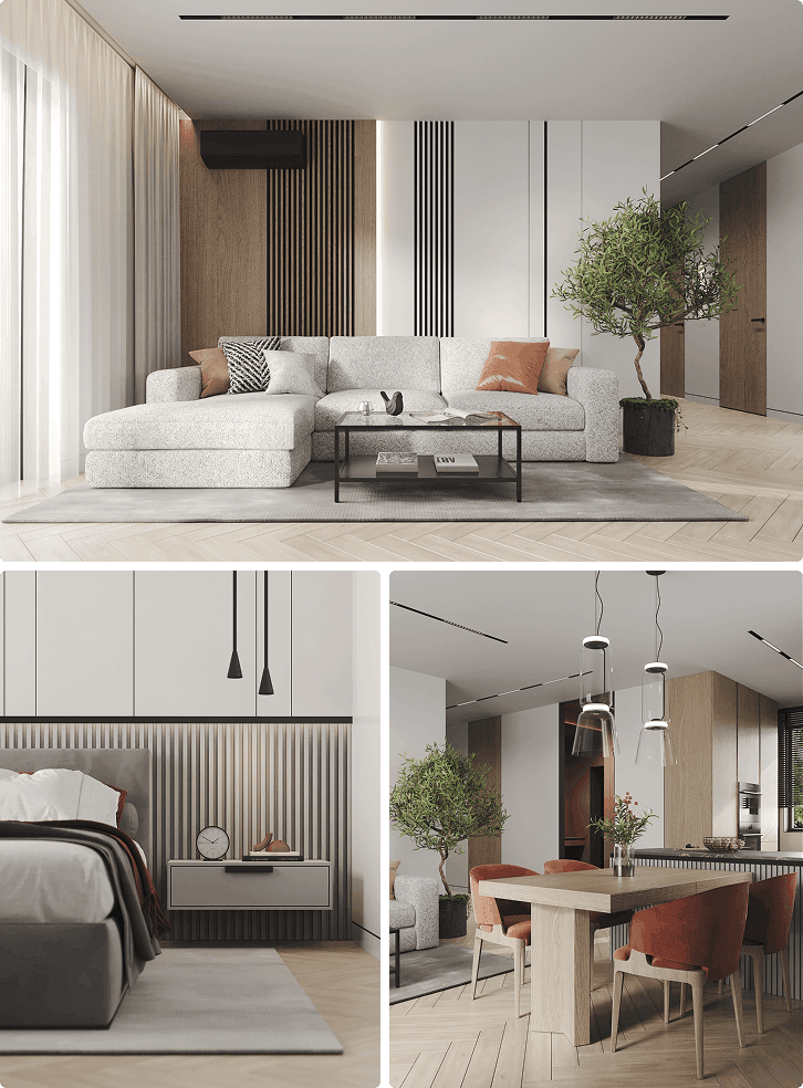 Создадим реалистичные визуализации помещений (4-6 ракурсов для каждого помещения, с естественным и искусственным освещением), а также внесем корректировки при необходимости.